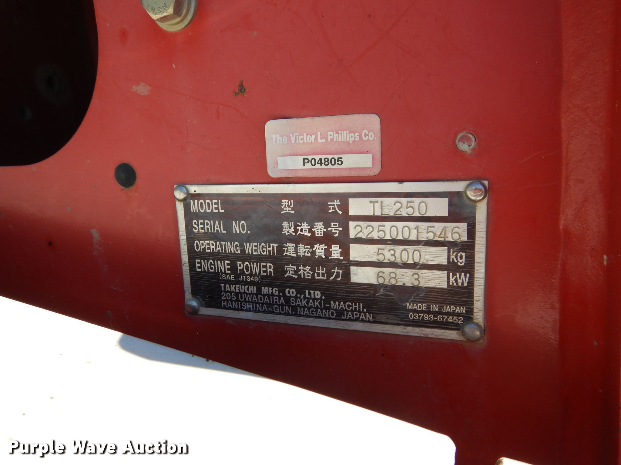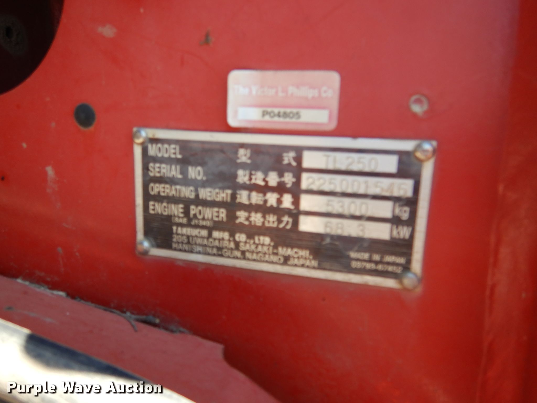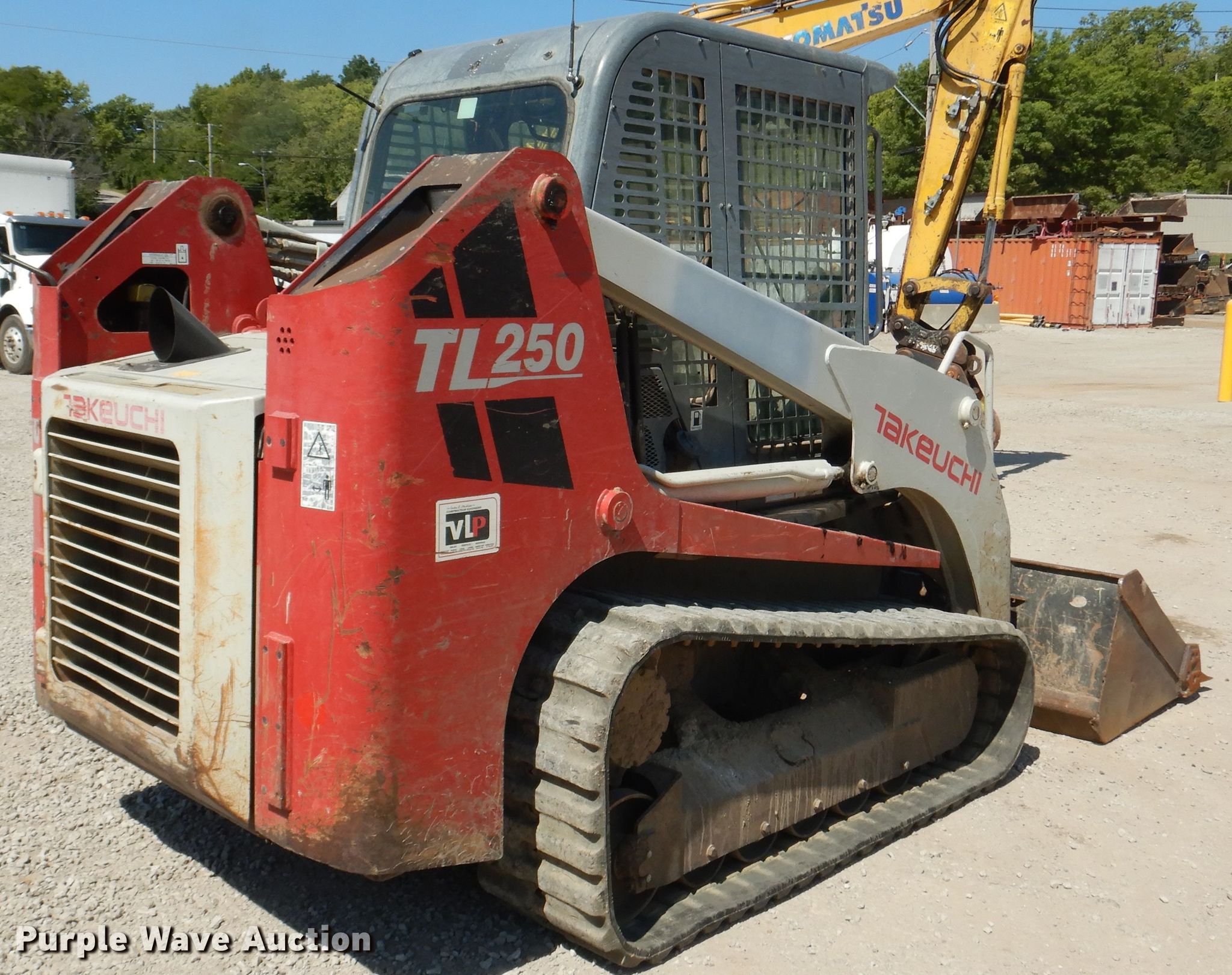 Purple Wave is selling a used Skid Steer Loader in Missouri. This item is a 2012 Takeuchi TL250 skid steer loader with the following: 1,138 hours on meter, Serial: 225001546