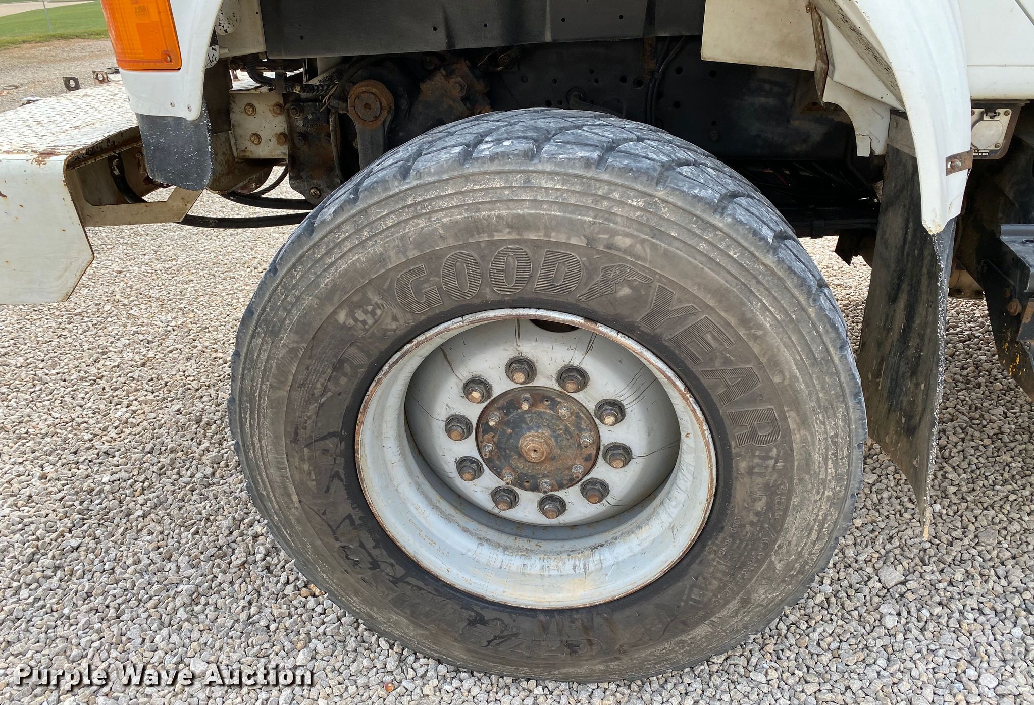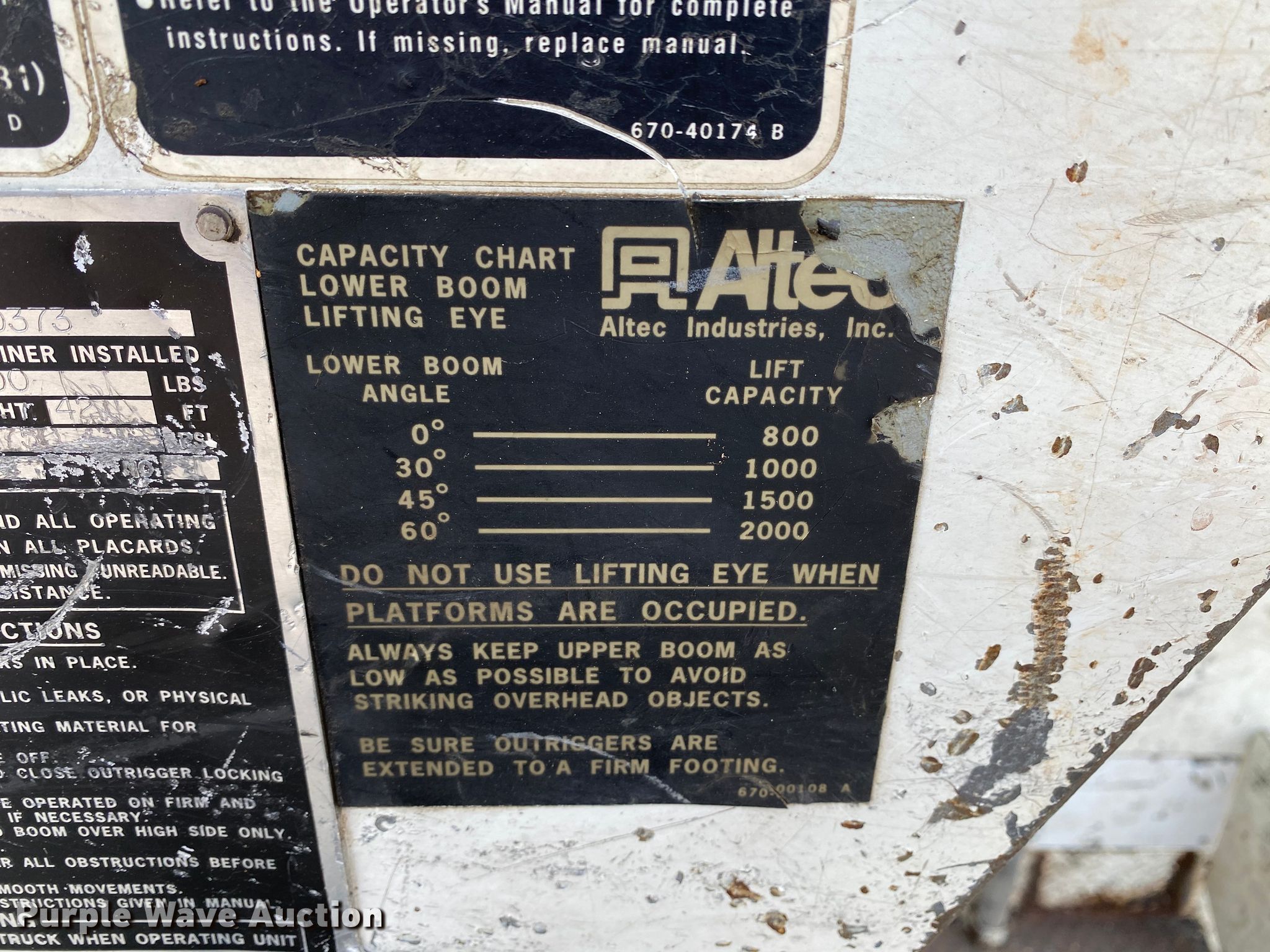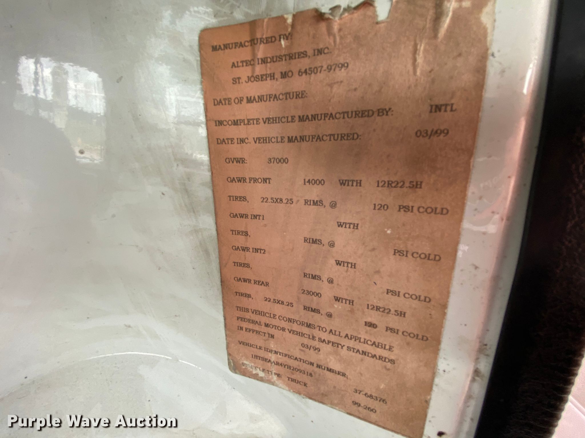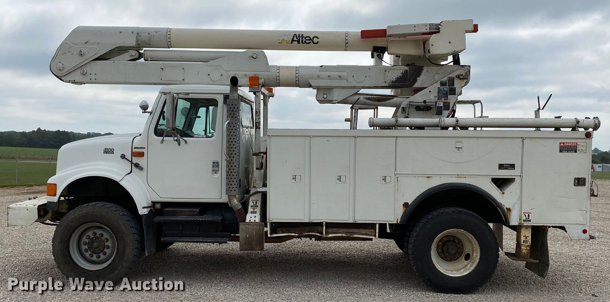 2000 International 4800 bucket truck. 184,199 miles on odometer, Engine hours: 14,592. Engine International DT466, Displacement: 7.6L, Cylinders: 6, Fuel type: Diesel. Transmission Eaton Fuller , Manual, Speed: 6. Chassis Four wheel drive, Axles: Single, Suspension: Spring, Brakes: Air, PTO, GVWR: 37,000 lbs, Wheelbase: 178". Interior AC, Heat. Operational Utility bed Altec, Serial: 37-68376, Length: 13', Winch Model 20UB9X3R2G, 20,000 lbs capacity , Serial 38101899E, Boom 1999 Altec A0422, Serial: 0399BD0373, Boom length: 21', Mast height: 42', Maximum lift capacity: 400 lbs, Maximum lift height: 45', Boom type: Articulating, Man basket, Boom controls Ground, Platform/ basket, Material handler. Tires Front: 385/65R22.5, Rear: 12R22.5. Missouri title. 1HTSEAAR4YH209318. Crawford Electric Cooperative. 10301 N Service Rd E. Bourbon, MO 65441