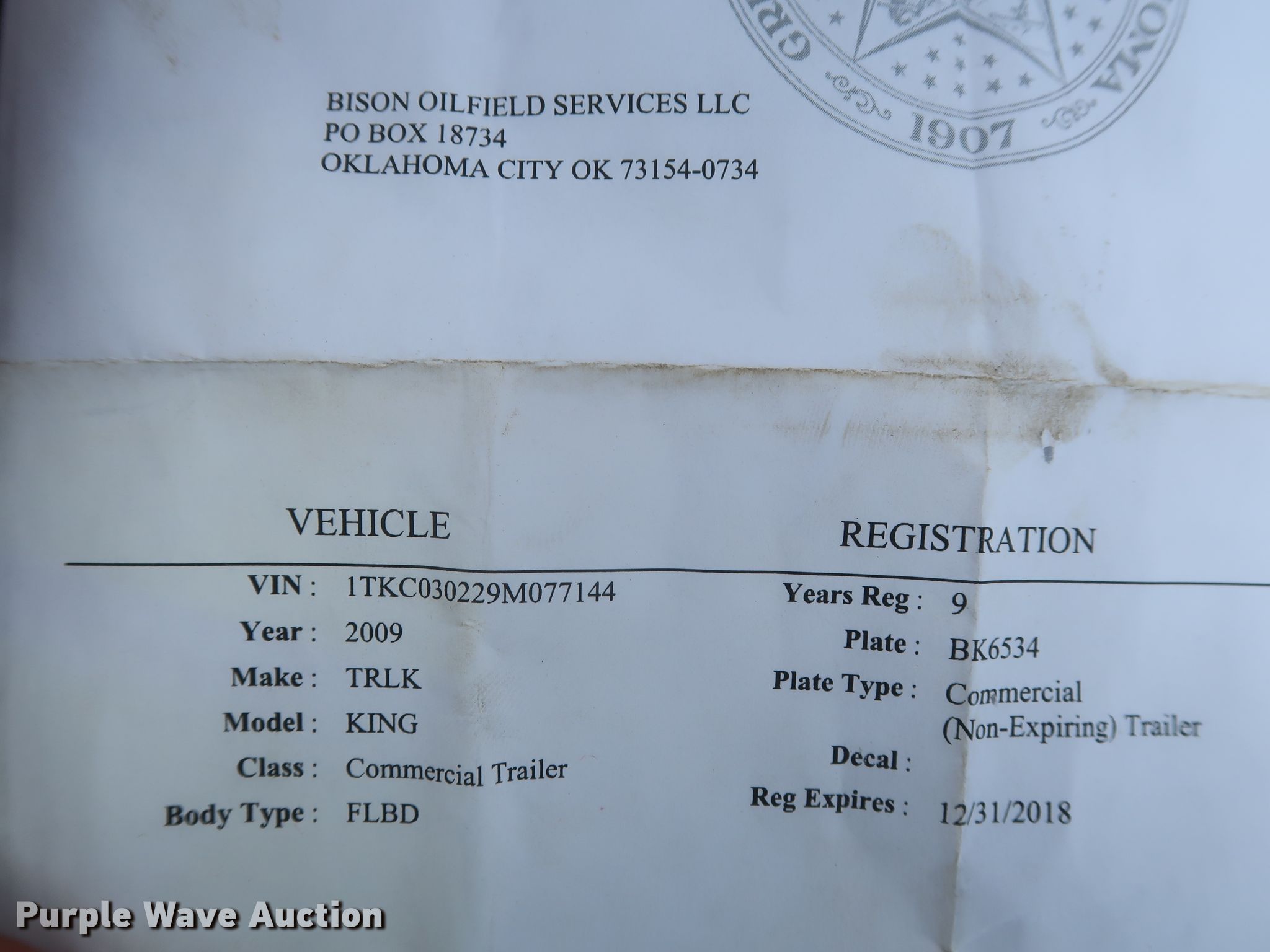 2009 Trail King equipment trailer. 35'L x 102"W overall, 30'L x 102"W wood deck, Single leg hydraulic landing gear, Spring suspension, Air brakes, Tandem axle, 235/75R17 tires. Transfer of ownership documentation will be a bill of sale. Distribution of ownership documentation may be delayed up to 30 days from verification of funds... Item must be removed by Tuesday, October 27. 1TKC030229M077144. Bison Oilfield Services, LLC. 12534 North 356 Road. Seminole, OK 74868