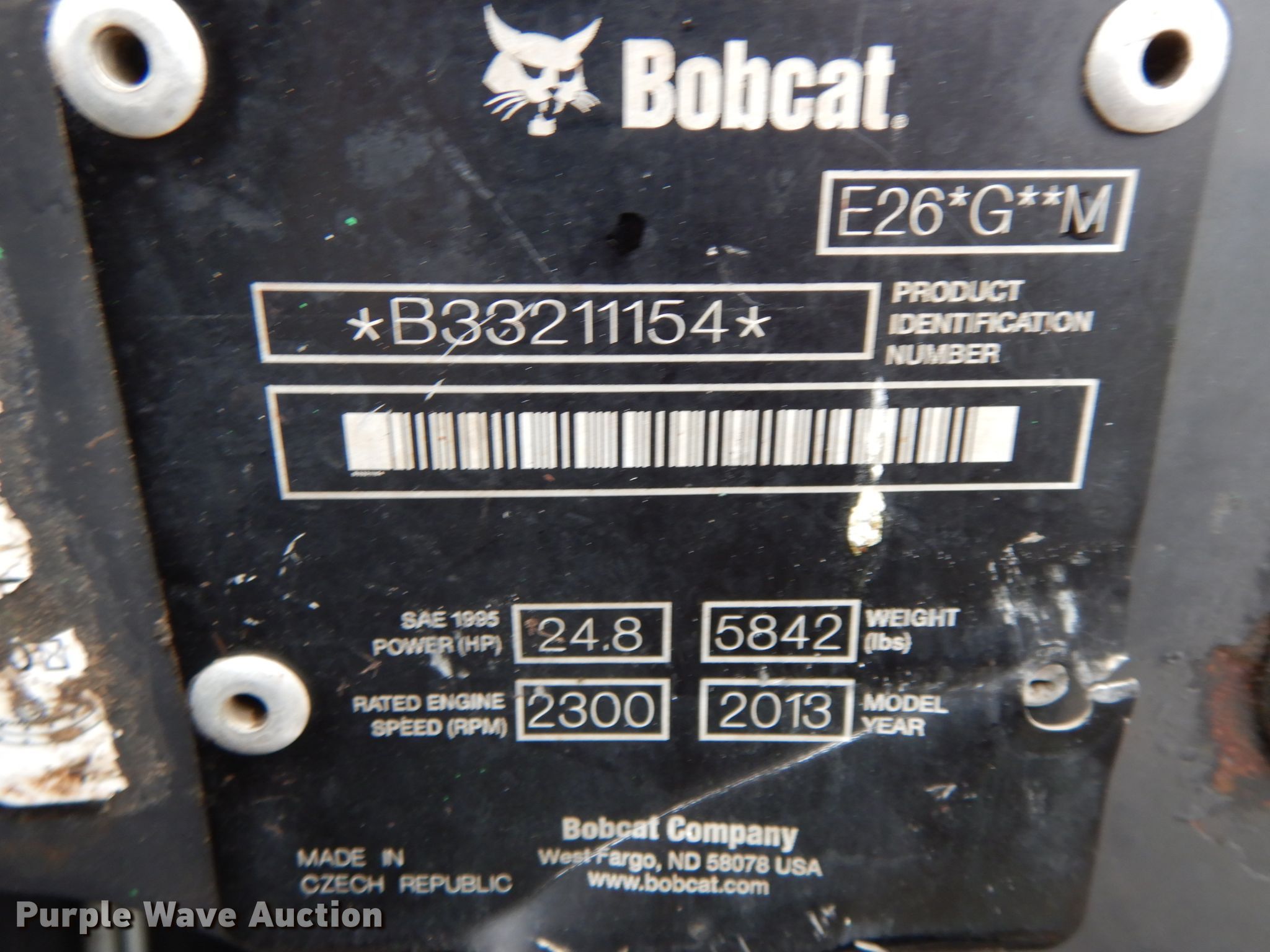 Purple Wave is selling a used Mini Excavator in Missouri. This item is a 2013 Bobcat E26 mini excavator with the following: 2,504 hours on meter, Serial: B33211154