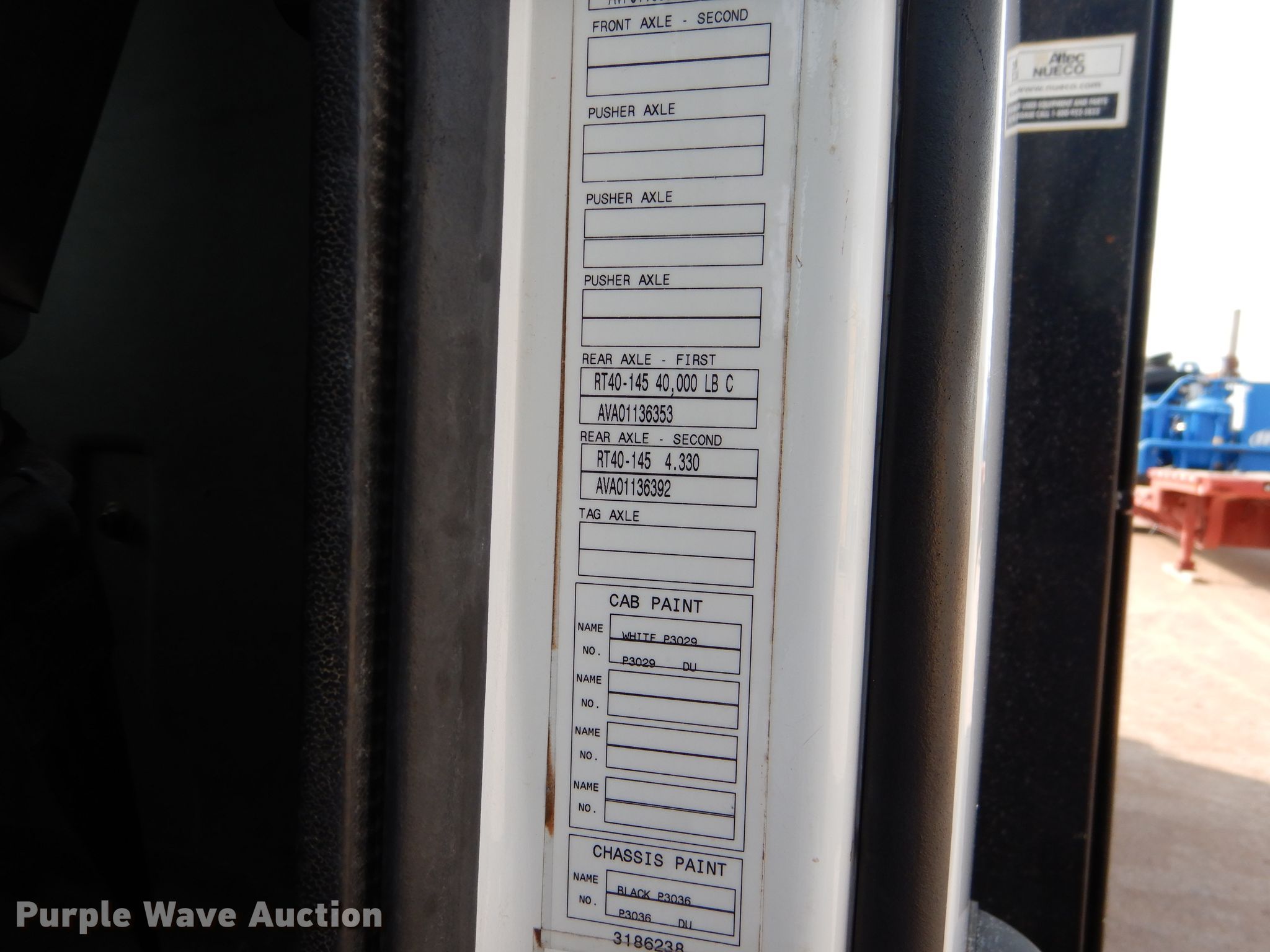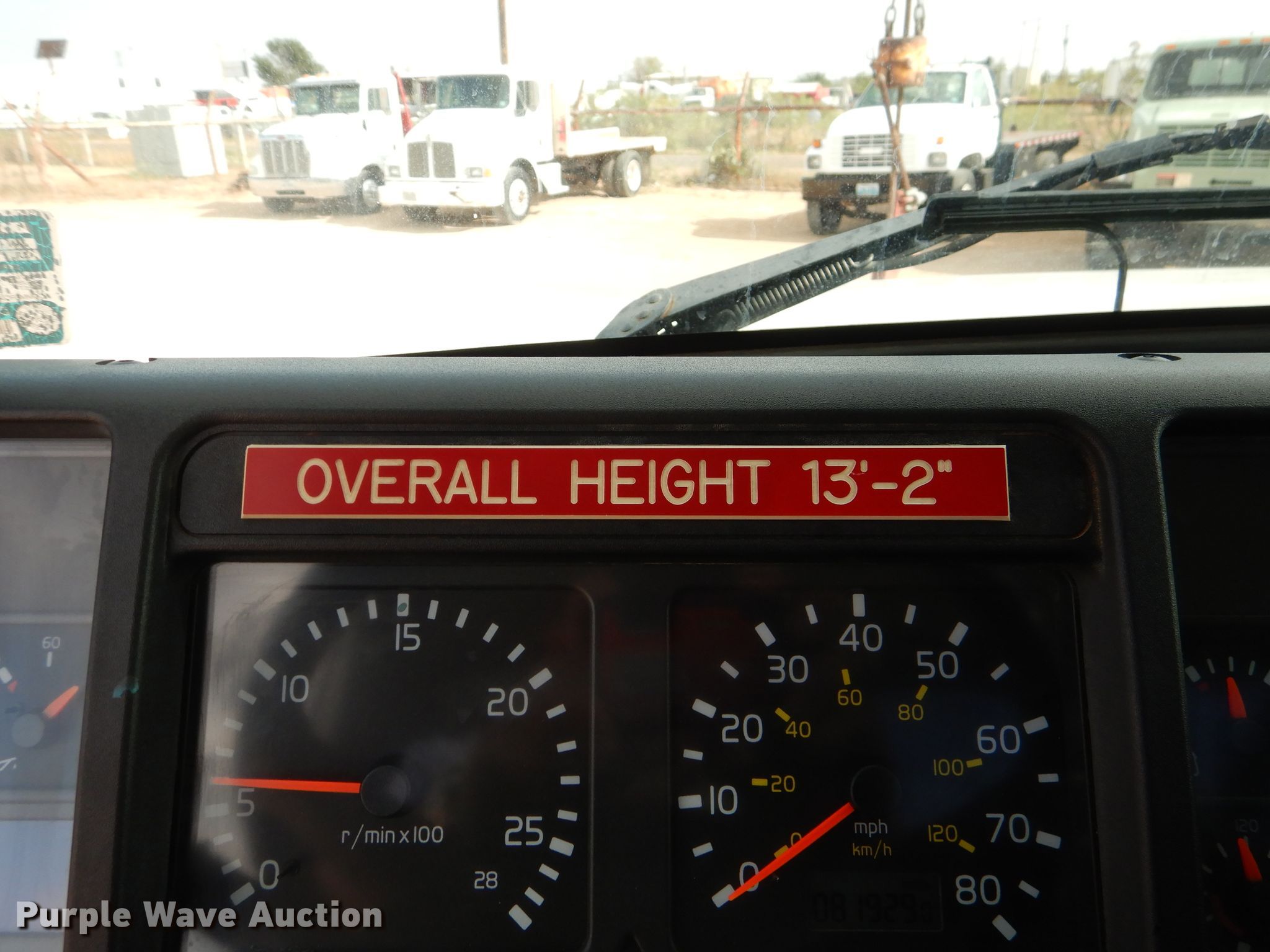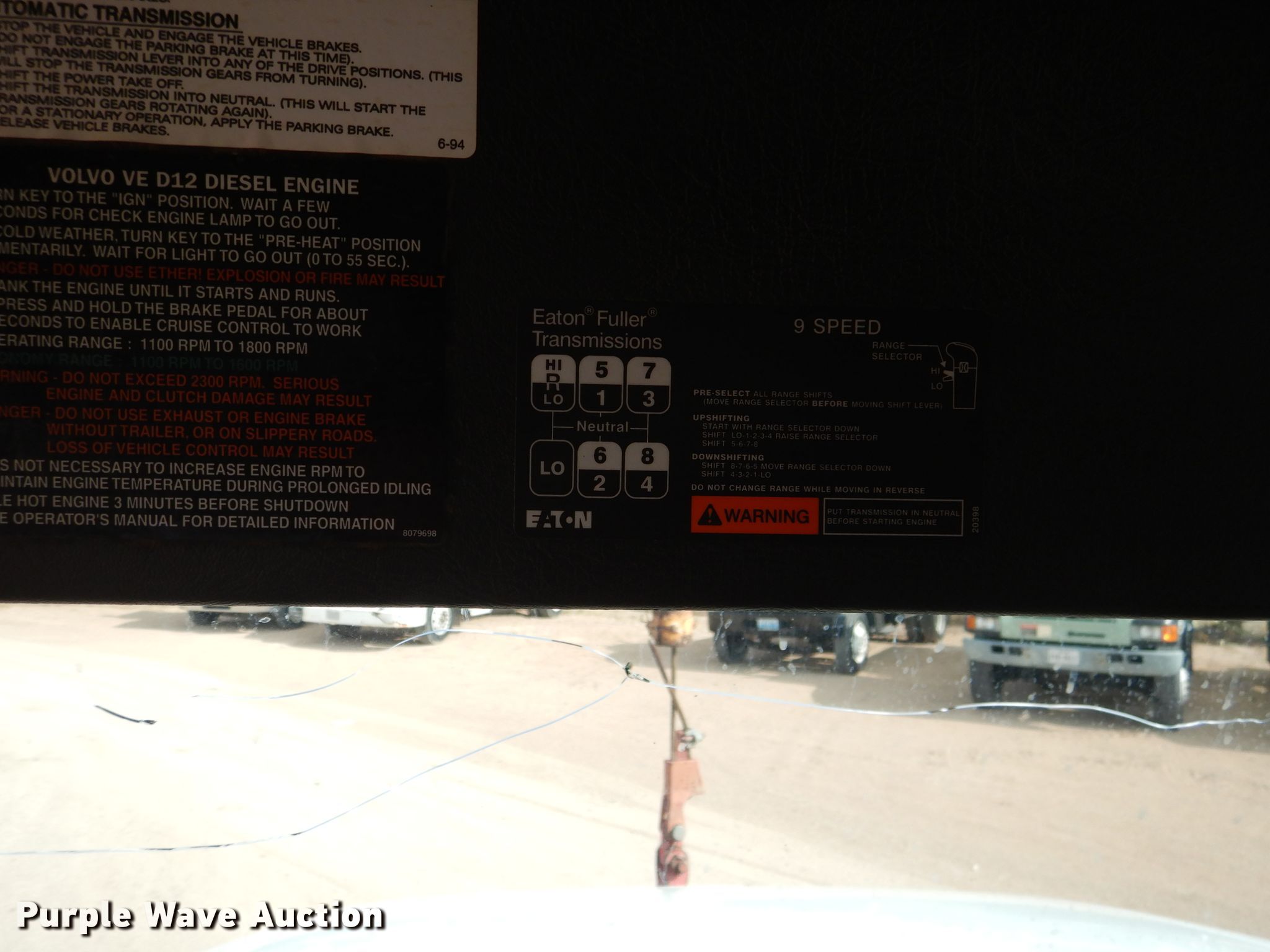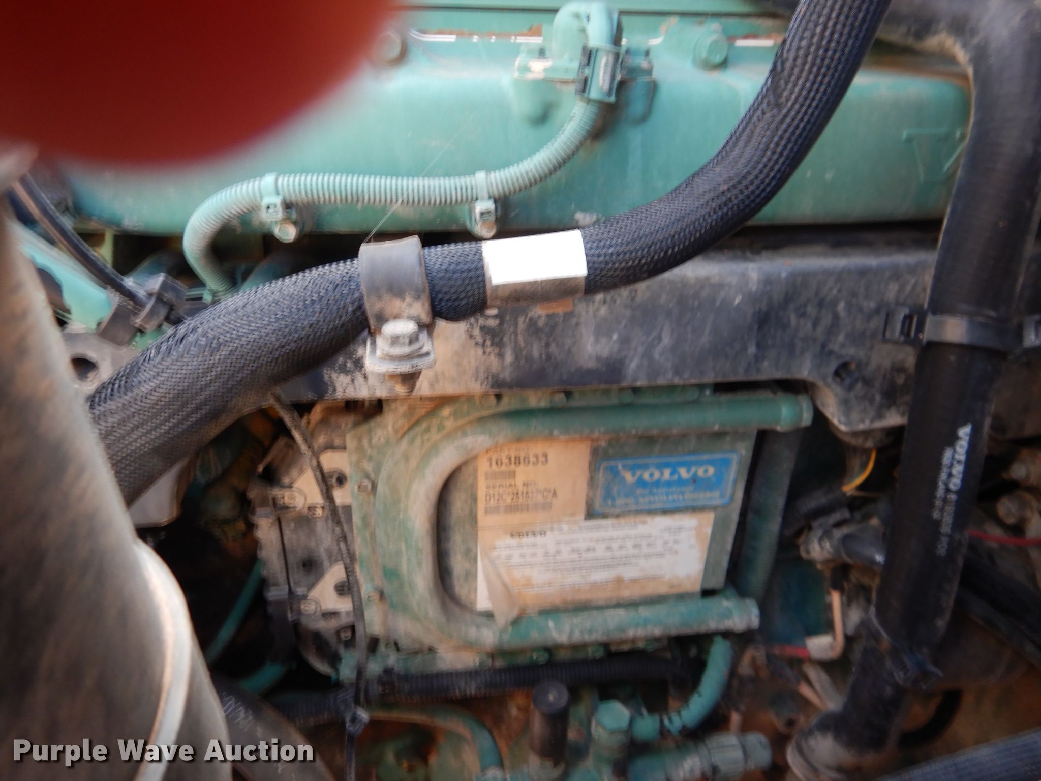 2002 Volvo VHD crane truck. 81,929 miles on odometer, Unit #: 899. Engine Volvo VE D12, Serial: D12C251537CA, Displacement: 12.1L, Cylinders: 6, Fuel type: Diesel, HP: 345. Transmission Eaton Fuller RTX13609B, Manual, Speed: 9. Chassis Axles: Tandem, Suspension: Spring, Brakes: Air, PTO, GVWR: 54,600 lbs FAWR: 14,600 lbs, IAWR: 20,000 lbs, RAWR: 20,000 lbs. Interior AC, Heat. Operational Utility bed National 446B, Serial: 35199, Length: 45', Crane Boom Telescopic, Boom controls, Crane block. Tires Front: 315/80R22.5, Rear: 11R22.5. Texas title. 4V5KC9GF62N334117. Two Rivers Pipeline. 3276 S County Rd West. Odessa, TX 79761