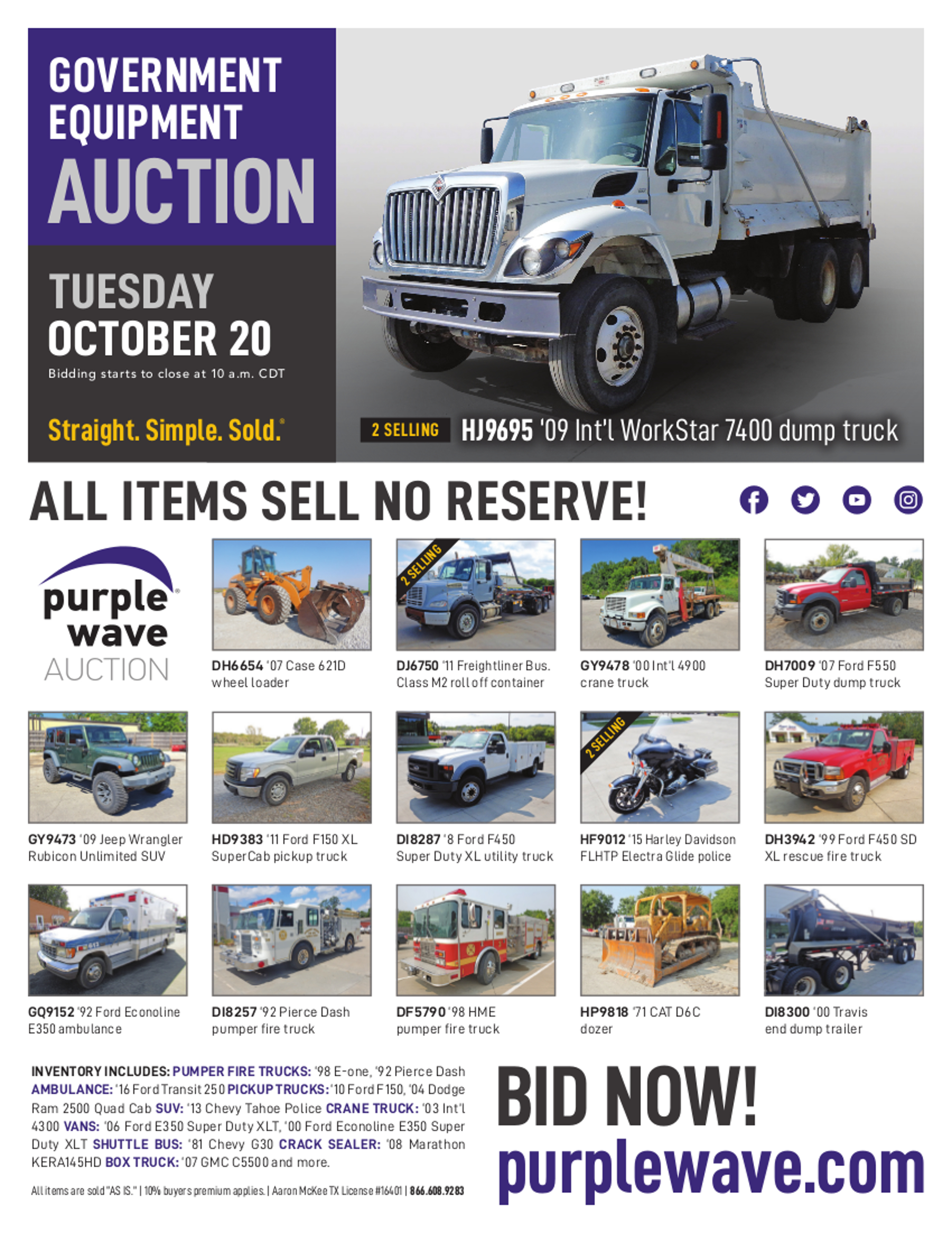 This auction is conducted by Purple Wave, Inc., whose home office is 825 Levee Drive, Manhattan, Kansas. Aaron McKee, Texas auctioneer license # 16401, operates Purple Wave, Inc. Complaints against us may be directed to the Texas Department of Licensing and Regulation, P.O. Box 12157, Austin, Texas 78711, (512) 463-6599. For additional required information, see the attached document.