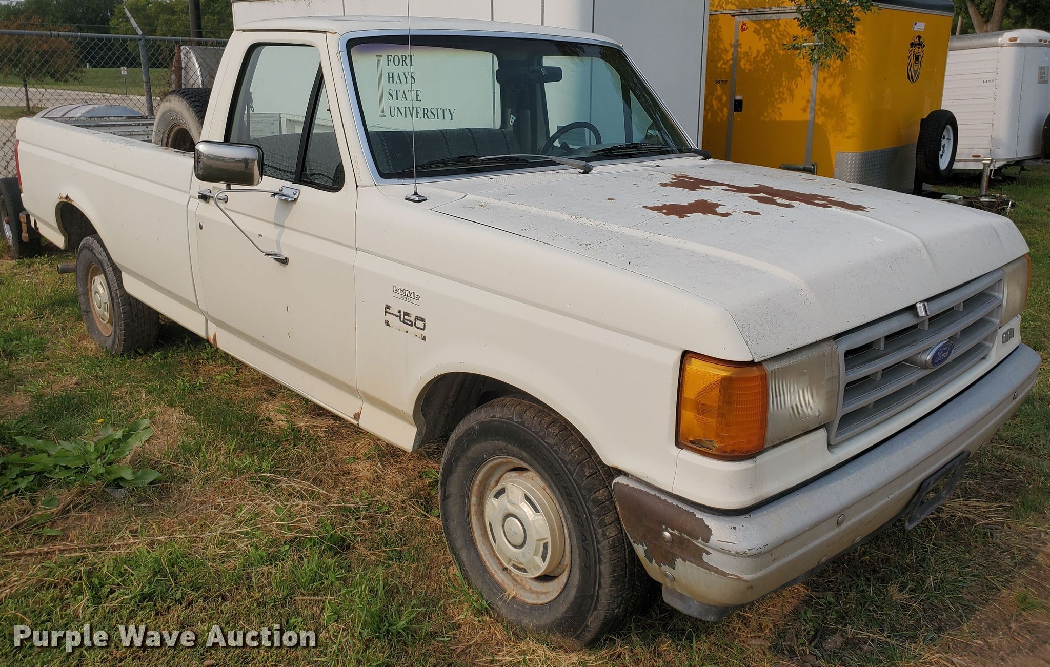 1990 Ford F150 Custom pickup truck. 159,794 miles on odometer. Engine Displacement: 4.9L L6 OHV 12V, Cylinders: 6, Fuel type: Gas. Transmission Automatic. Interior AC, Heat. Tires Size: 235/75R15. Notes Dash warning indicator: Check engine. Kansas title. Title distribution may be delayed up to 30 days from verification of funds. 1FTEF15Y8LKA97661. Fort Hays State University. 600 Park St. Hays, KS 67601