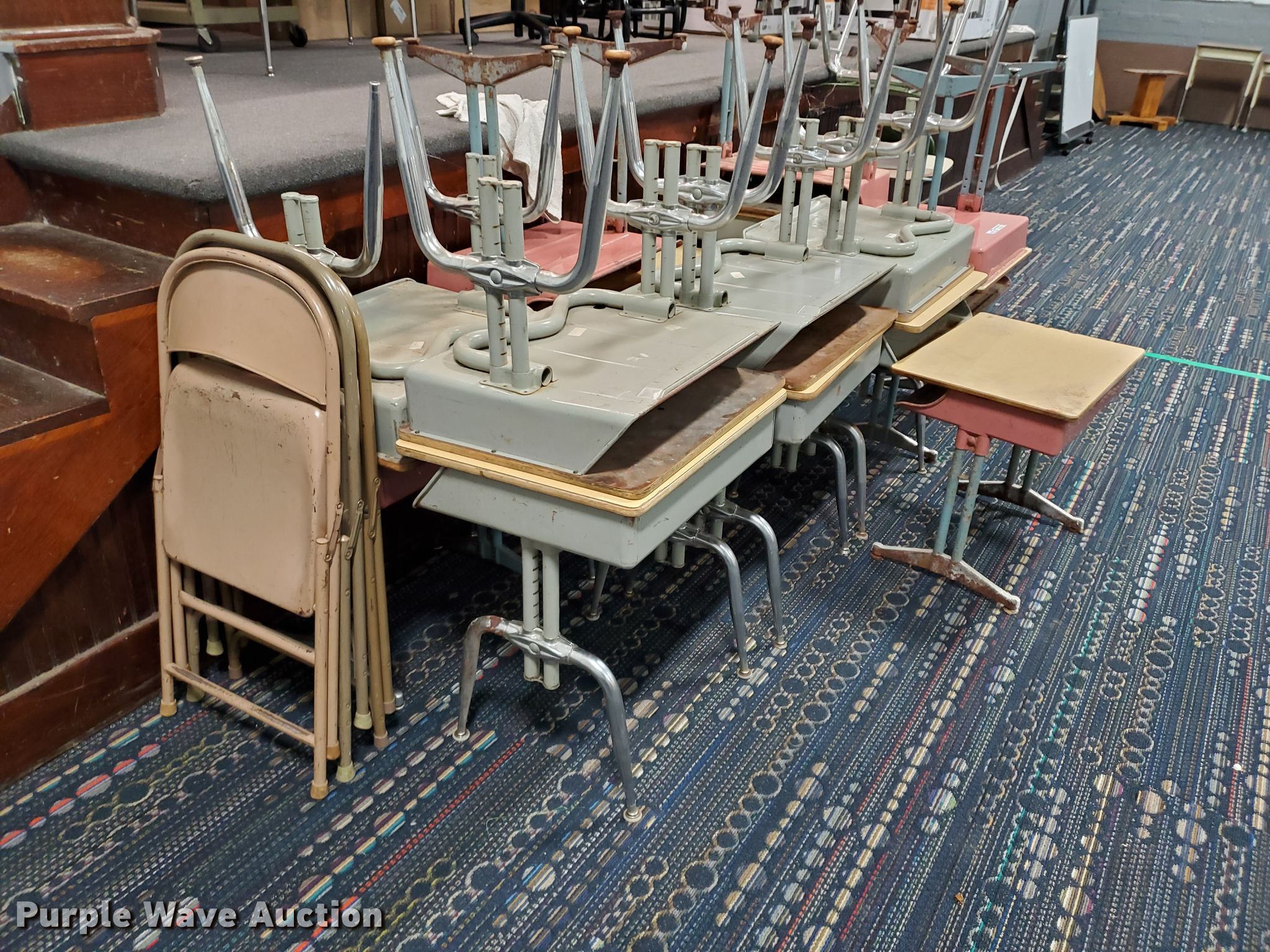 Purple Wave is selling a used Furniture in Kansas. This item is a Furniture with the following: Approx. 18 student desks, (3) metal folding chairs
