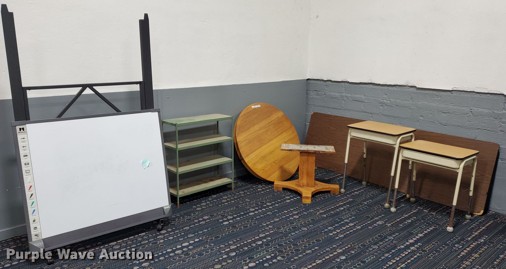 Purple Wave is selling a used Furniture in Kansas. This item is a Furniture with the following: 47" x 40" smartboard, Non-operational unit, 40" round table, 8' folding table, (2) student desks, 3' x 7' wood door