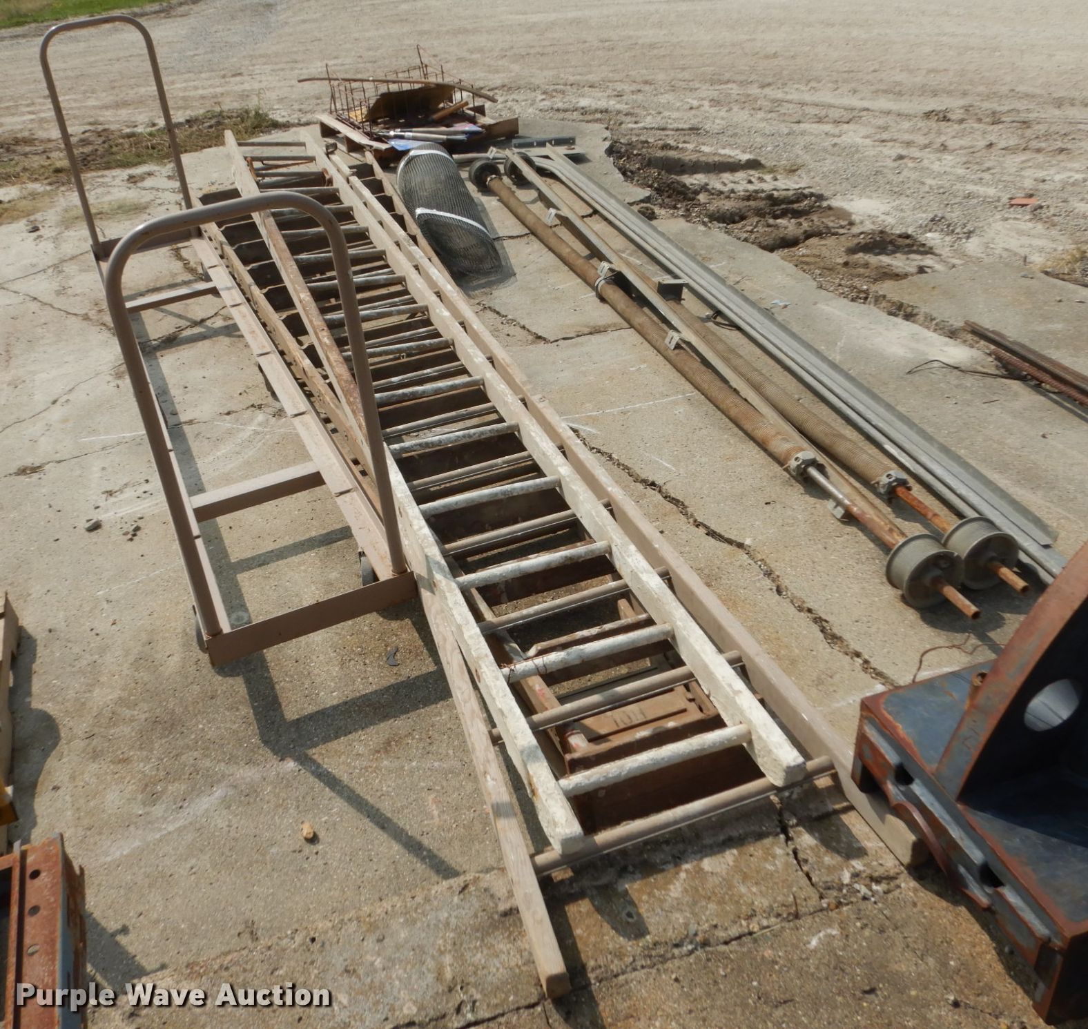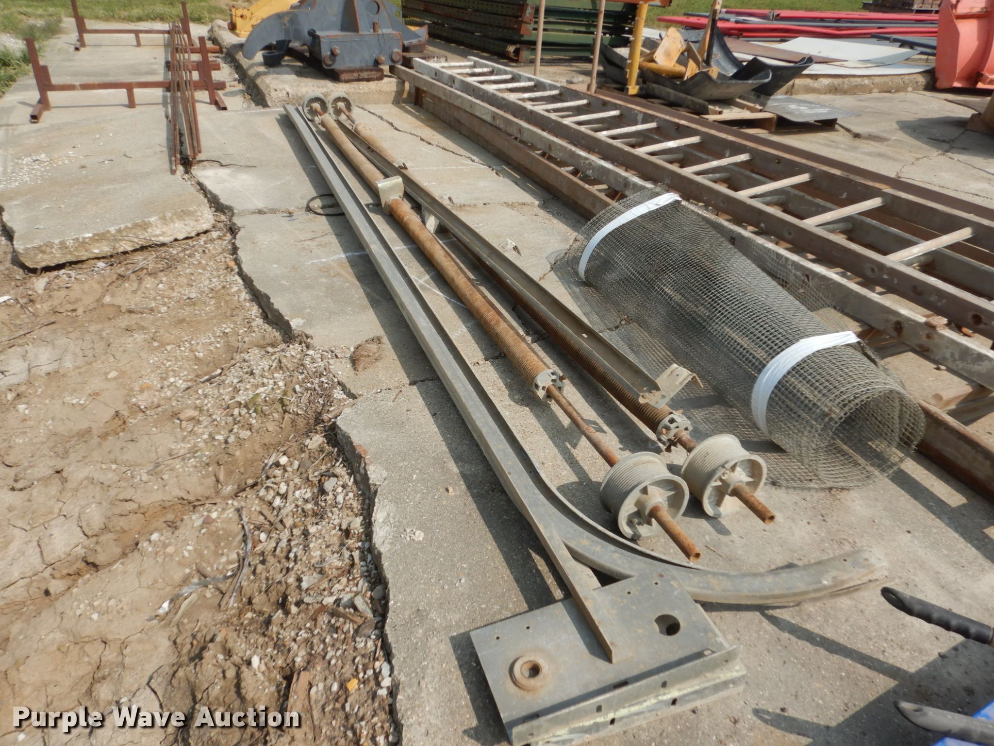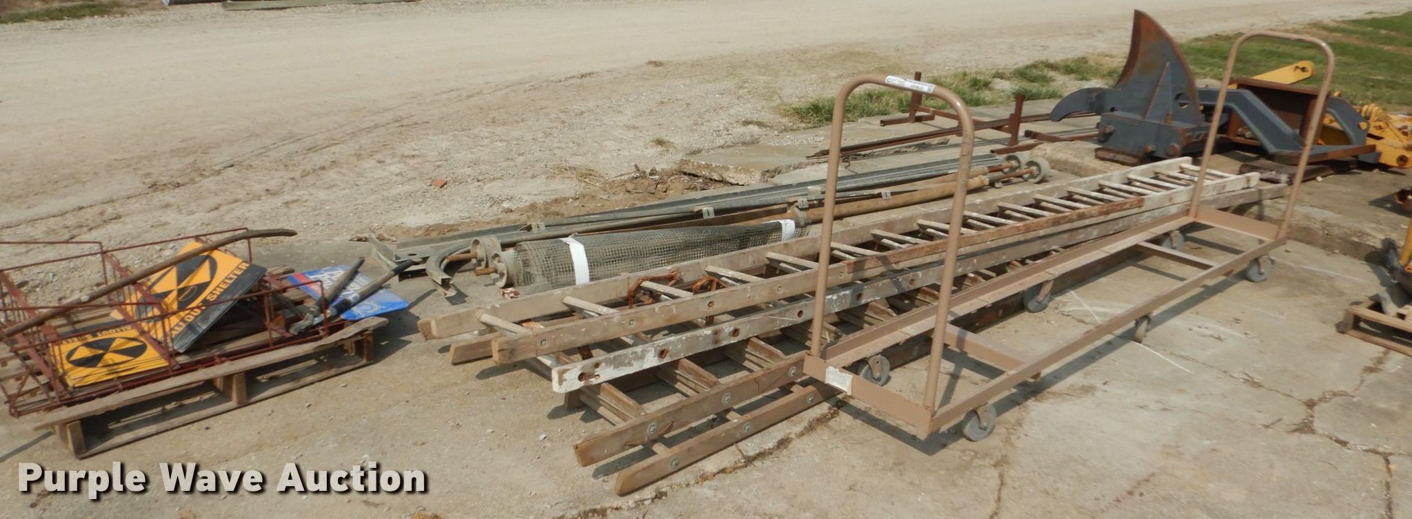 Purple Wave is selling a used Tools in Iowa. This item is a Tools with the following: (2) ladders, 16' step, 16' extension, Roll up door tracks and springs, 12' chair rack, Signs and screen, Rolling stairs