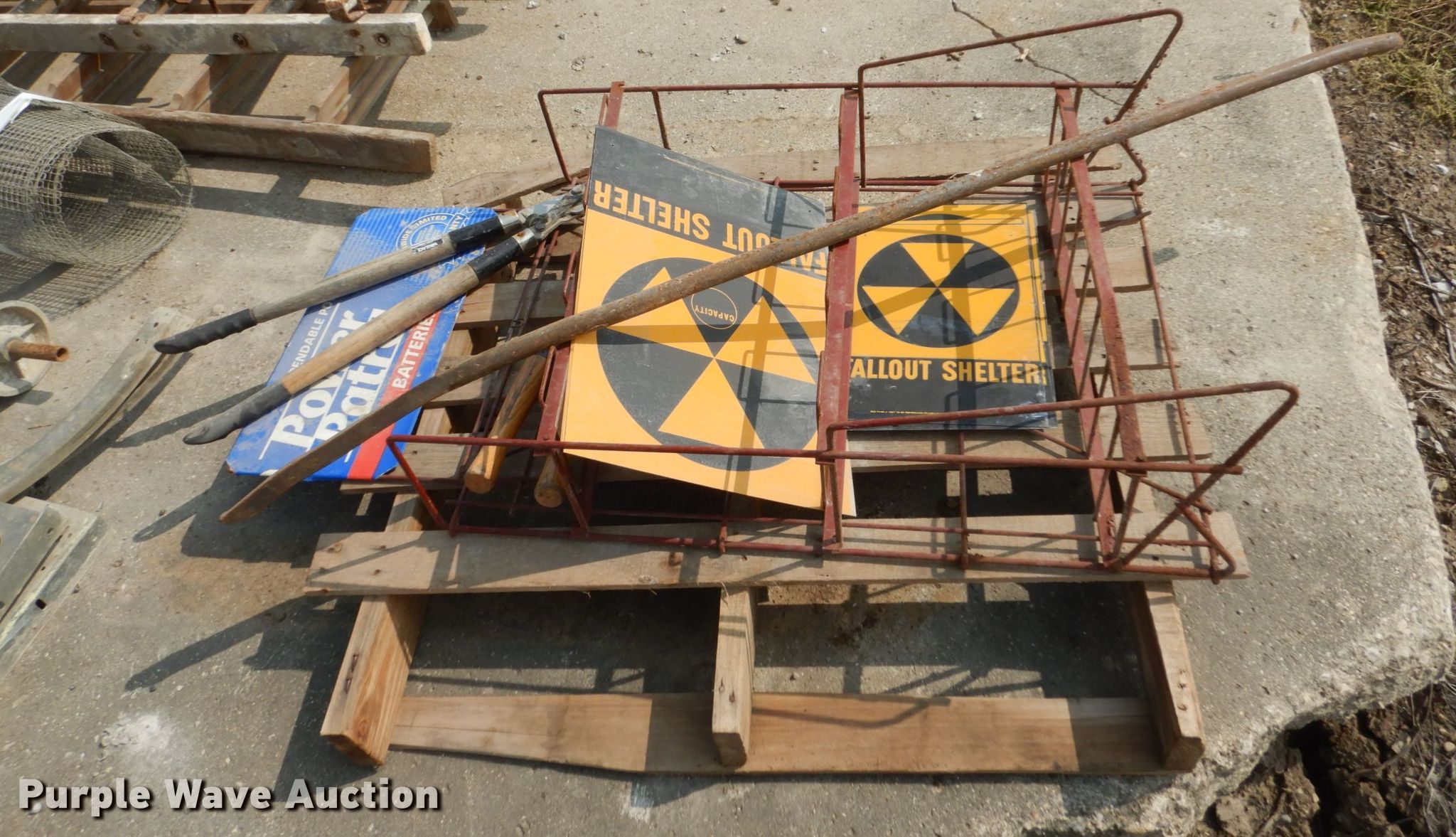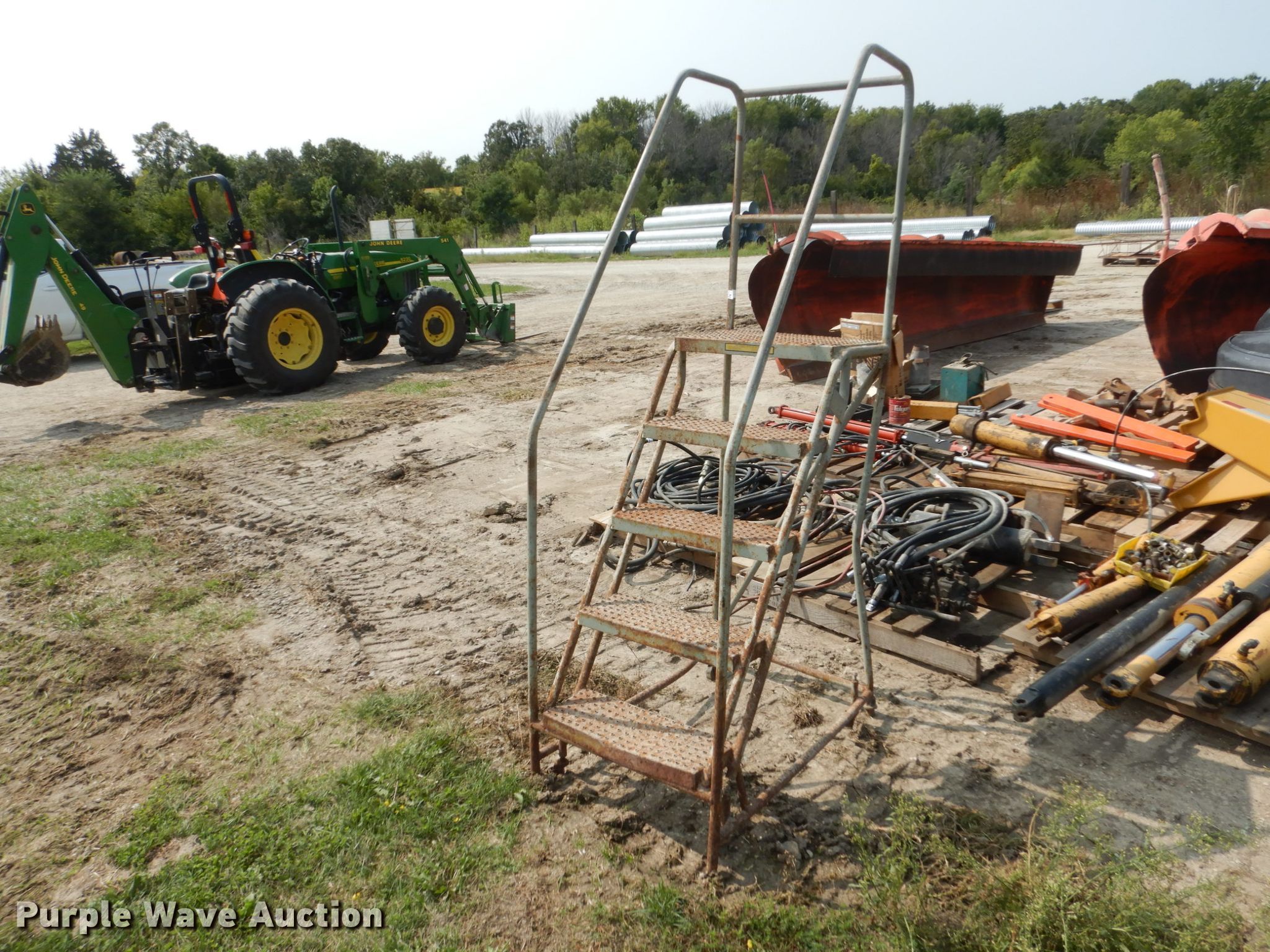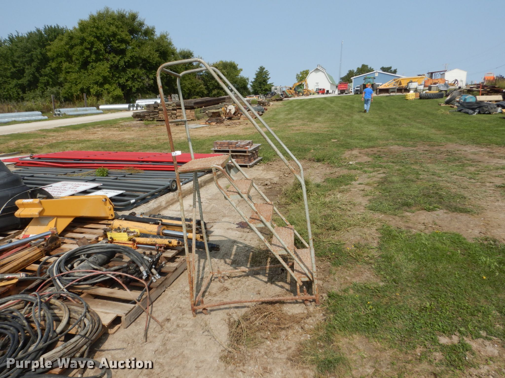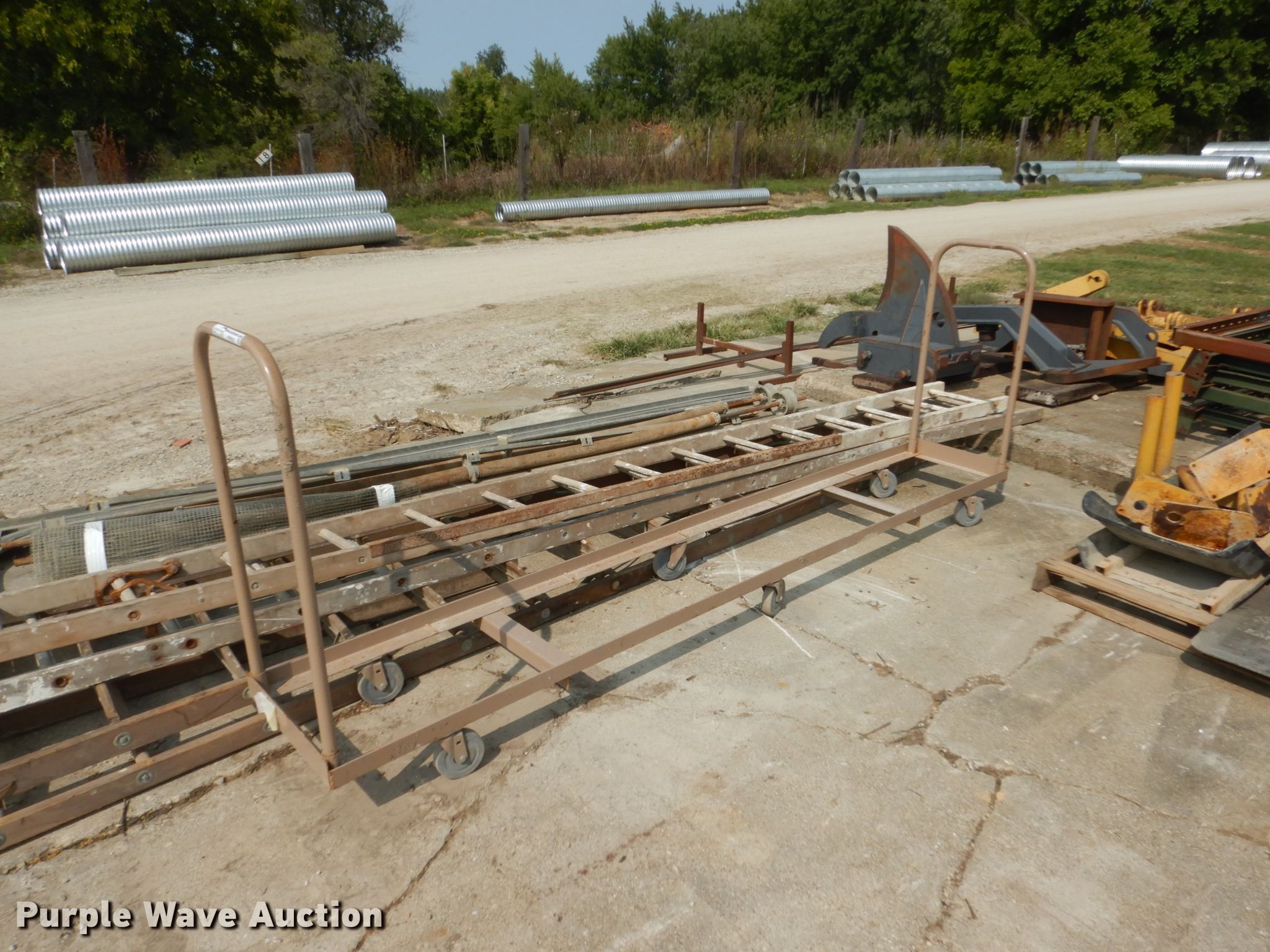 Purple Wave is selling a used Tools in Iowa. This item is a Tools with the following: (2) ladders, 16' step, 16' extension, Roll up door tracks and springs, 12' chair rack, Signs and screen, Rolling stairs