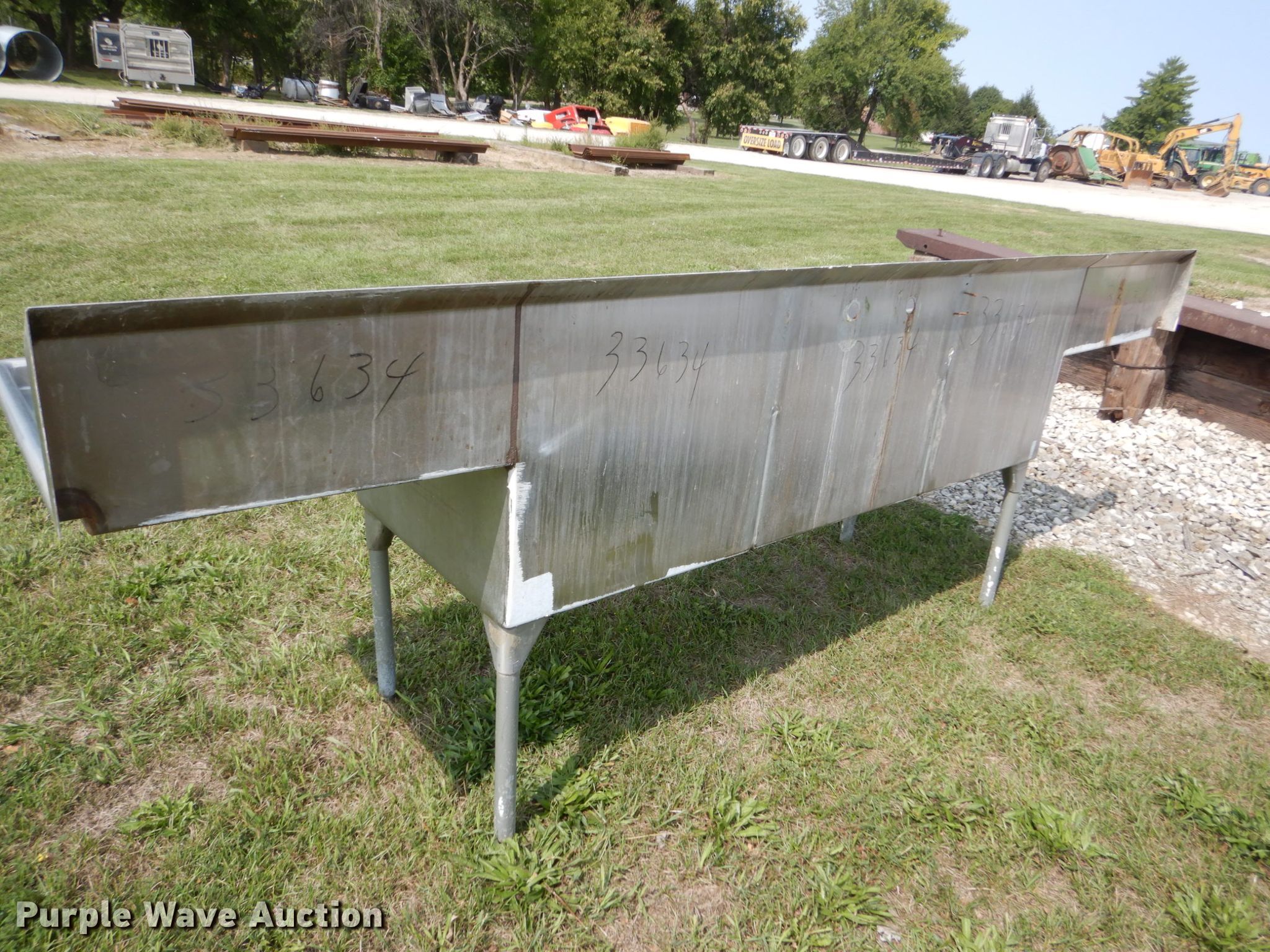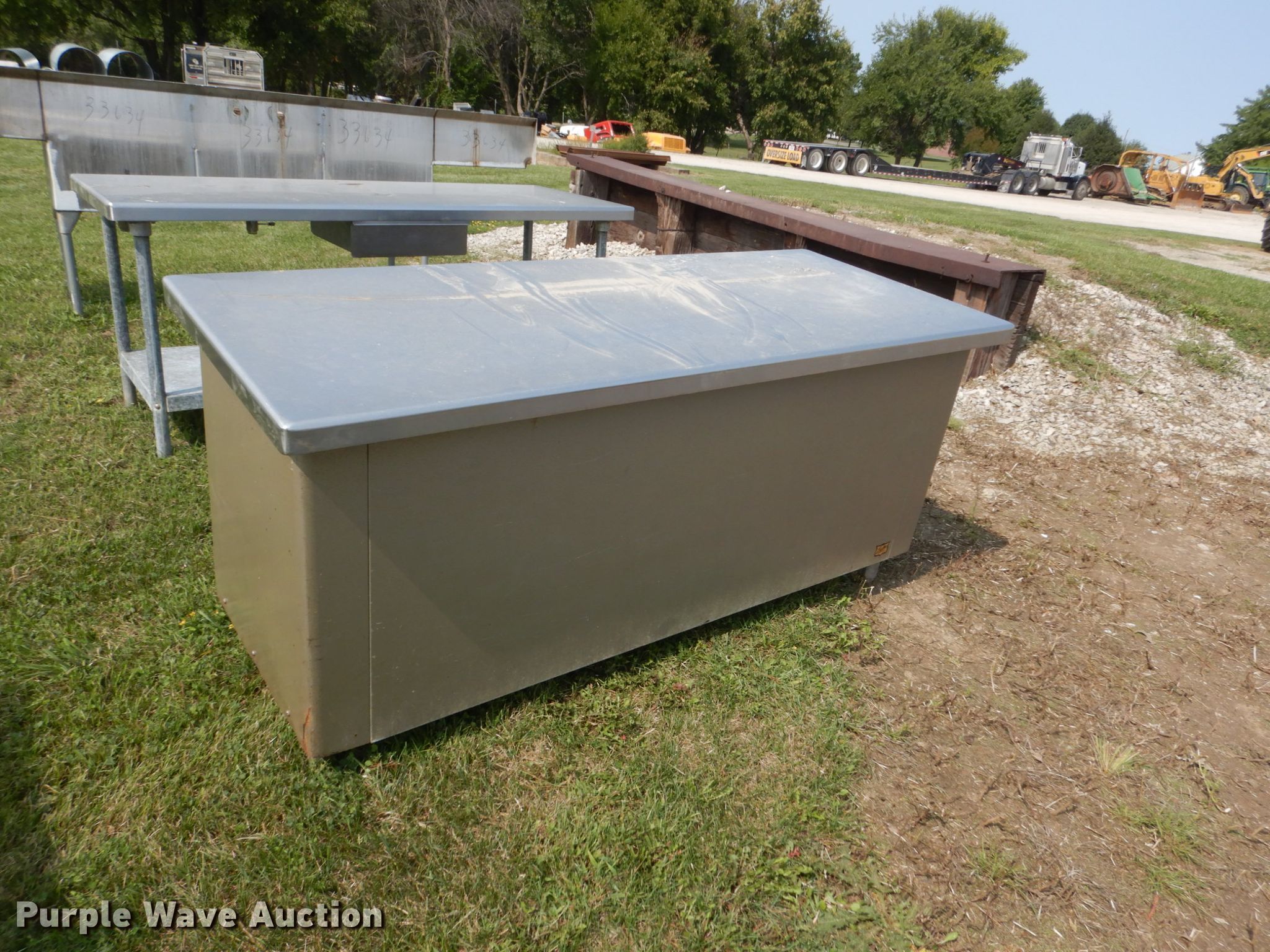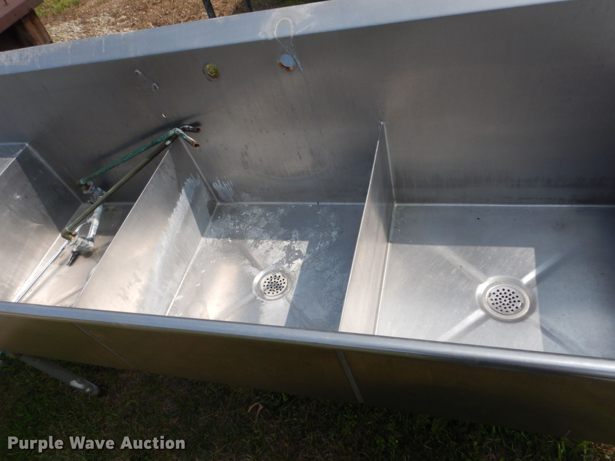 Purple Wave is selling a used Furniture in Iowa. This item is a Furniture with the following: (3) stainless steel sinks, 10' x 27", Stainless steel table, 6'L x 30"W x 33"H, Desk