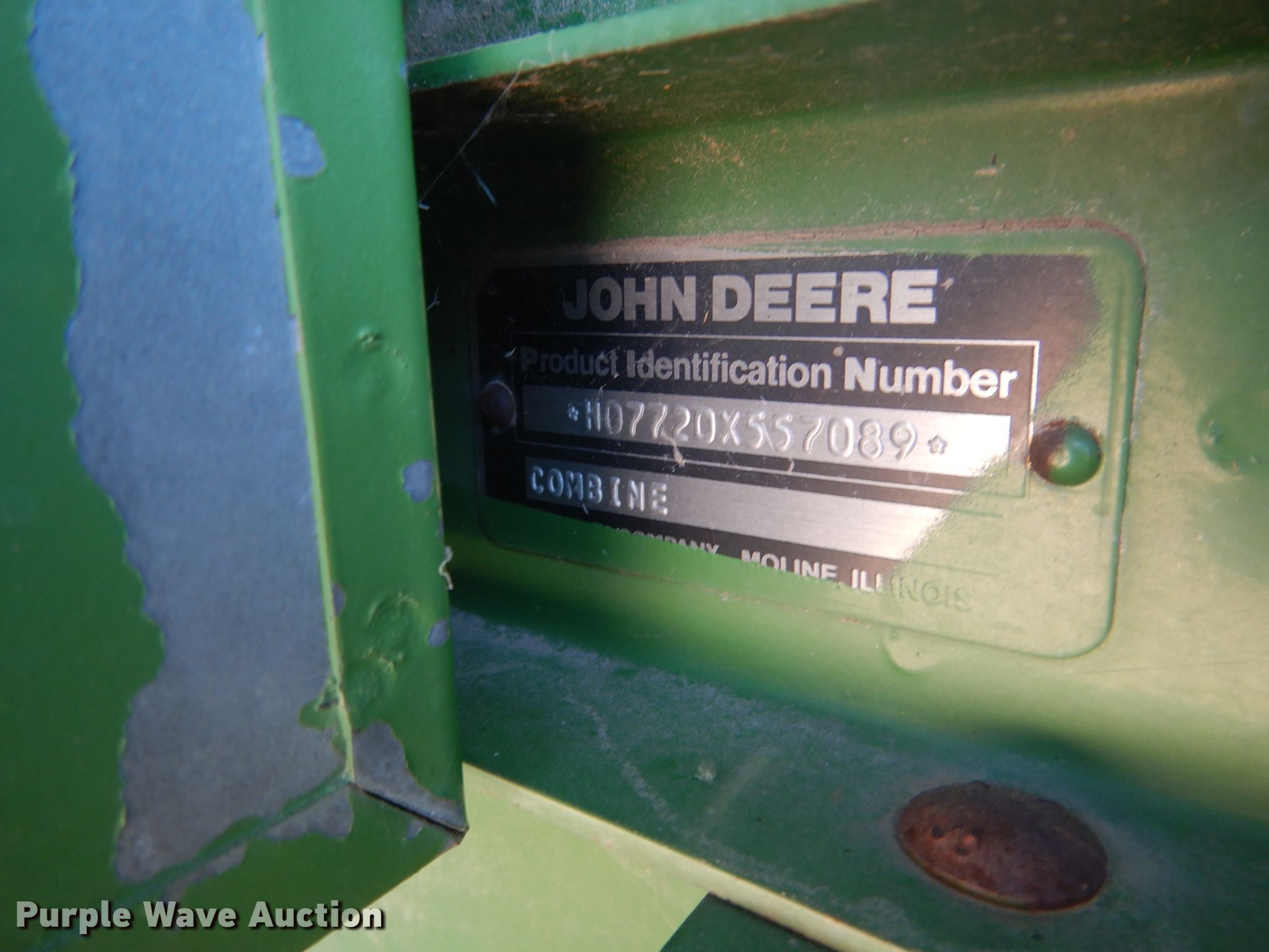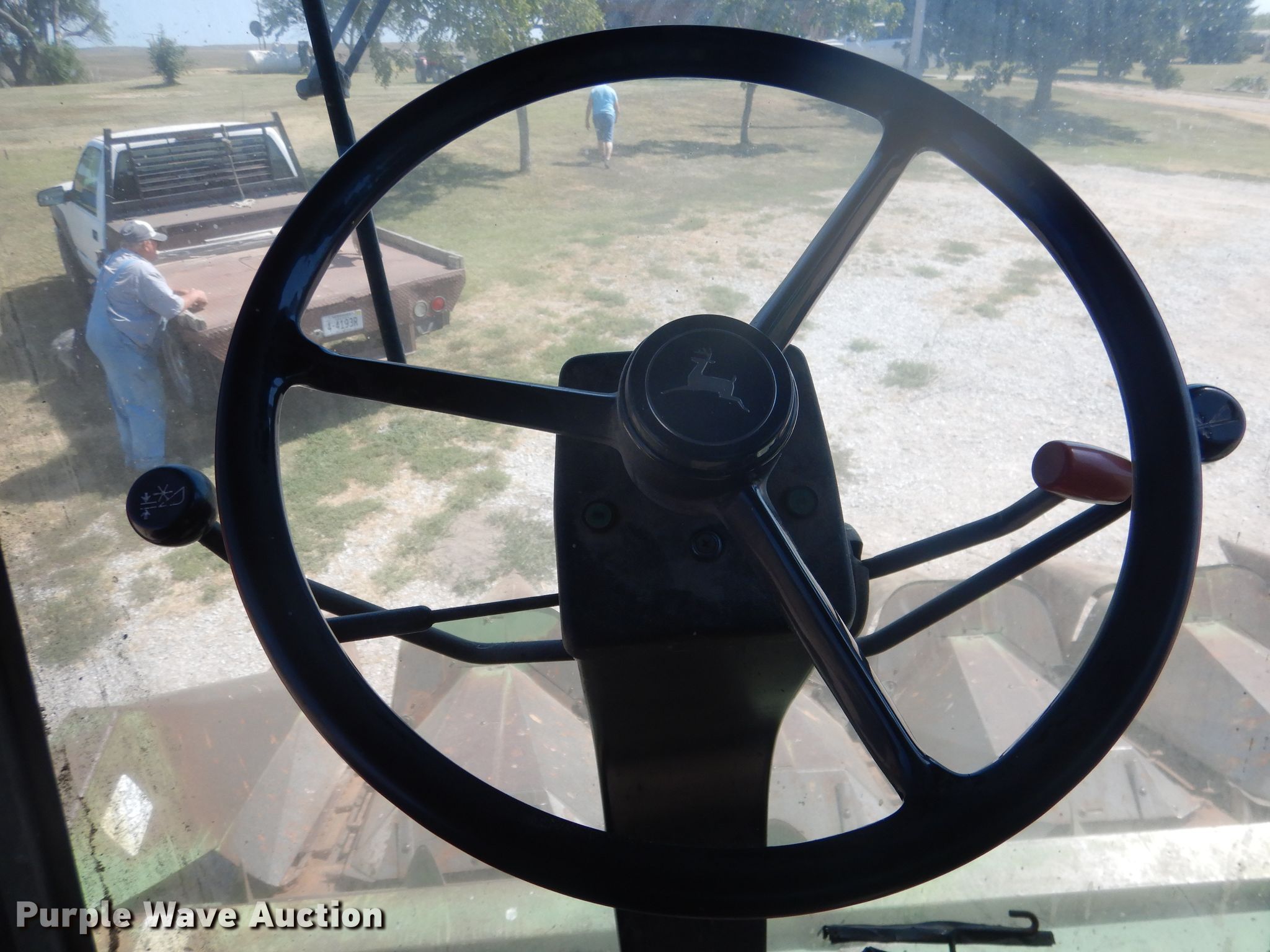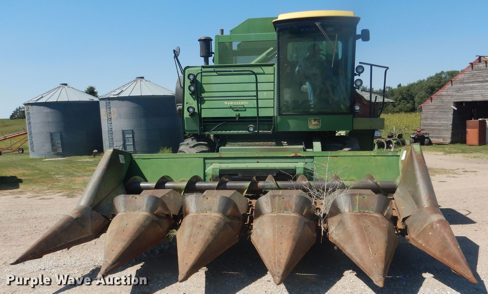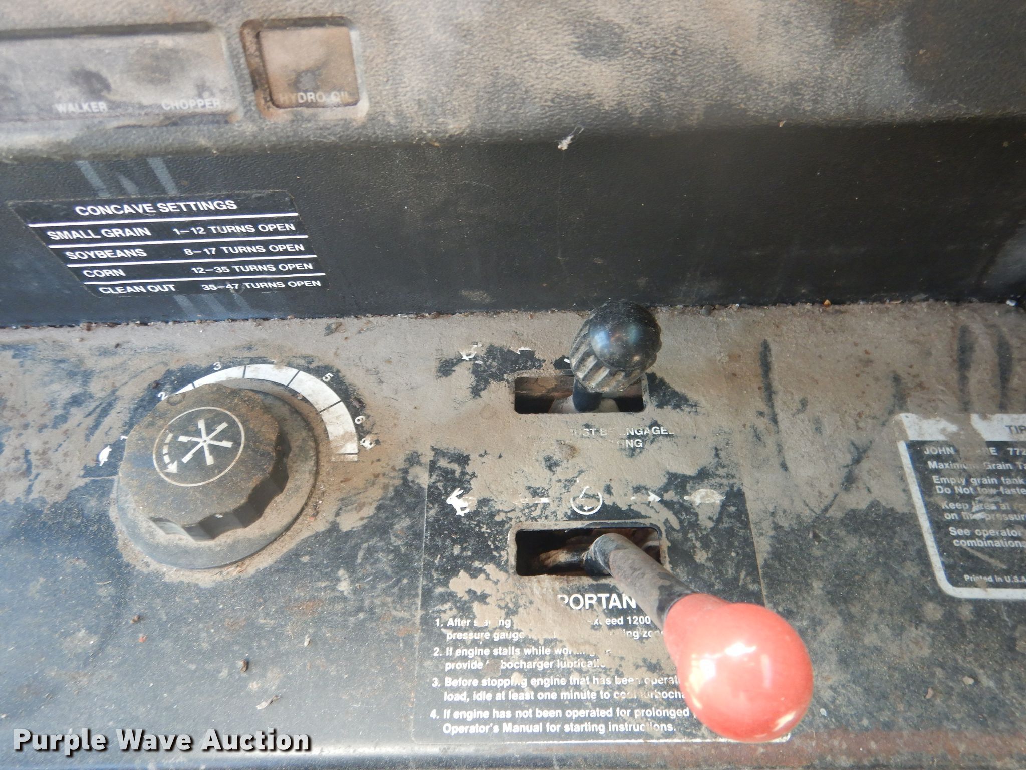 Purple Wave is selling a used Combine in Nebraska. This item is a John Deere 7720 combine with the following: 3,474 engine hours on meter, John Deere 6466TH-02 six cylinder diesel engine, Serial RG6466T240661, Hydrostatic transmission, 4F-4R gears, Feederhouse, Lateral tilt, Variable speed, Reverser, AC and heat, Round concaves, Two speed rotor, Chaff spreader, 12'L unloading auger, Operator manual, John Deere corn head, Five rows, 36" row spacing, Dual drivelines, Serial 142119H, 24.5-32 front tires, 14.9-24 rear tires, Tire spacer, Spreader drive belt is off wheel, Serial H07720X557089