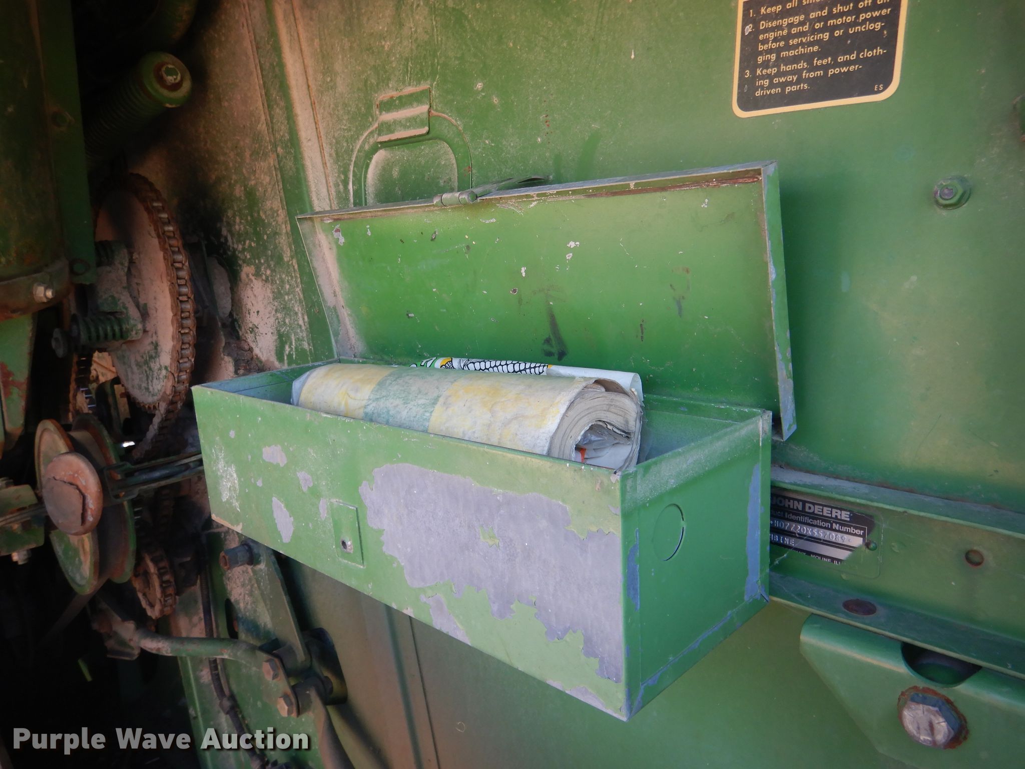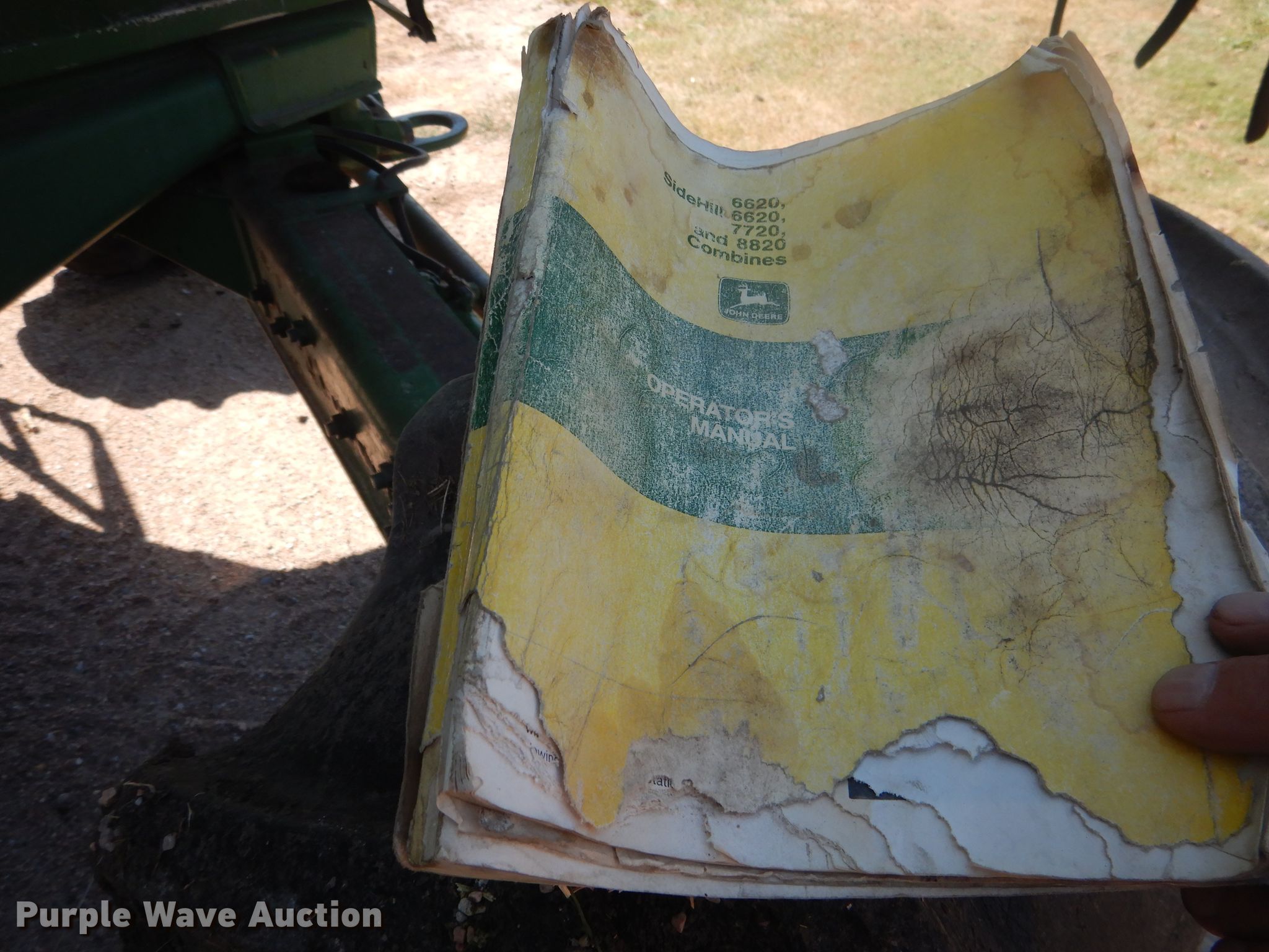 John Deere 7720 combine. 3,474 engine hours on meter, John Deere 6466TH-02 six cylinder diesel engine Serial RG6466T240661, Hydrostatic transmission 4F-4R gears, Feederhouse Lateral tilt, Variable speed, Reverser, AC and heat, Round concaves, Two speed rotor, Chaff spreader, 12'L unloading auger, Operator manual, John Deere corn head Five rows, 36" row spacing, Dual drivelines, Serial 142119H, 24.5-32 front tires, 14.9-24 rear tires, Tire spacer, Spreader drive belt is off wheel, Serial H07720X557089. Oconto, NE 68860