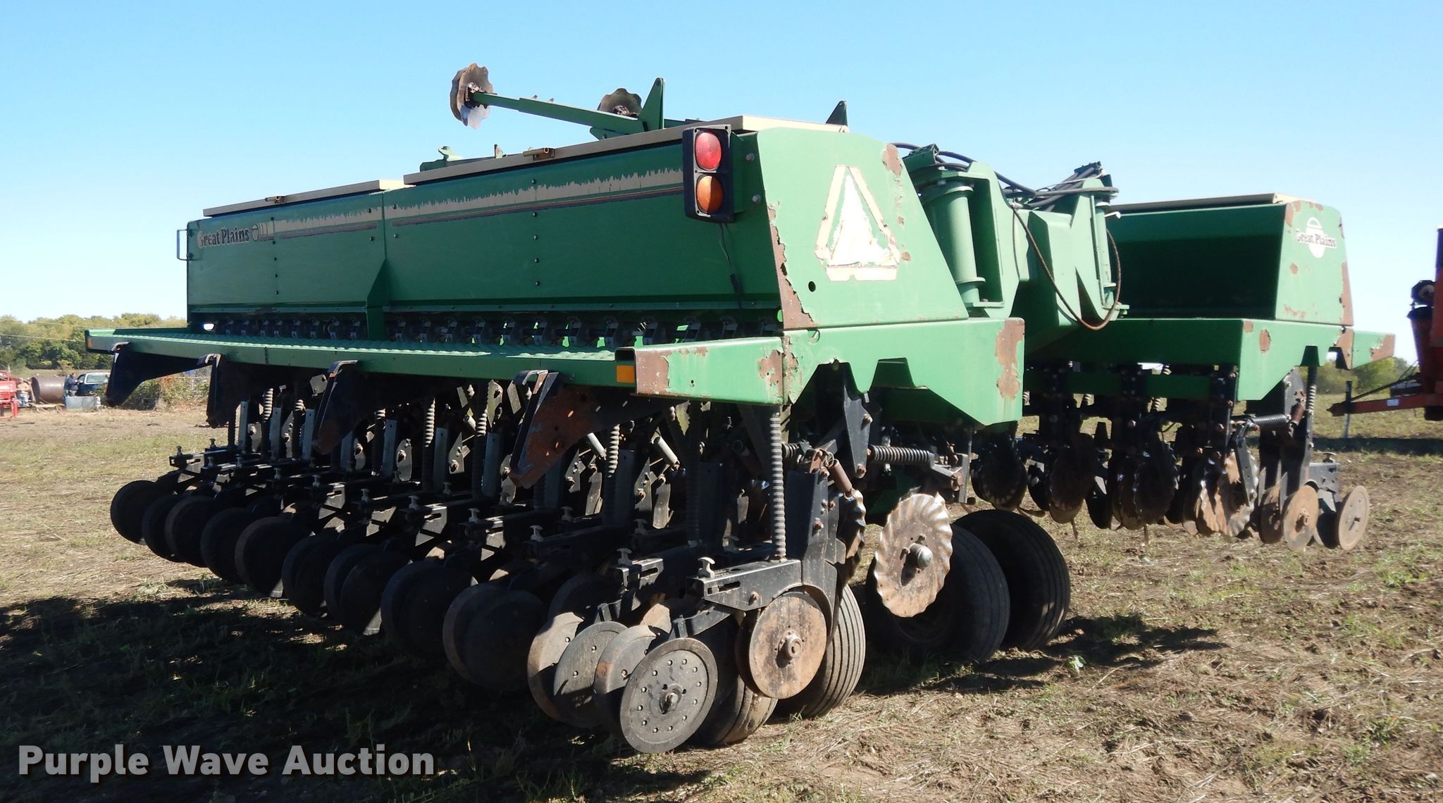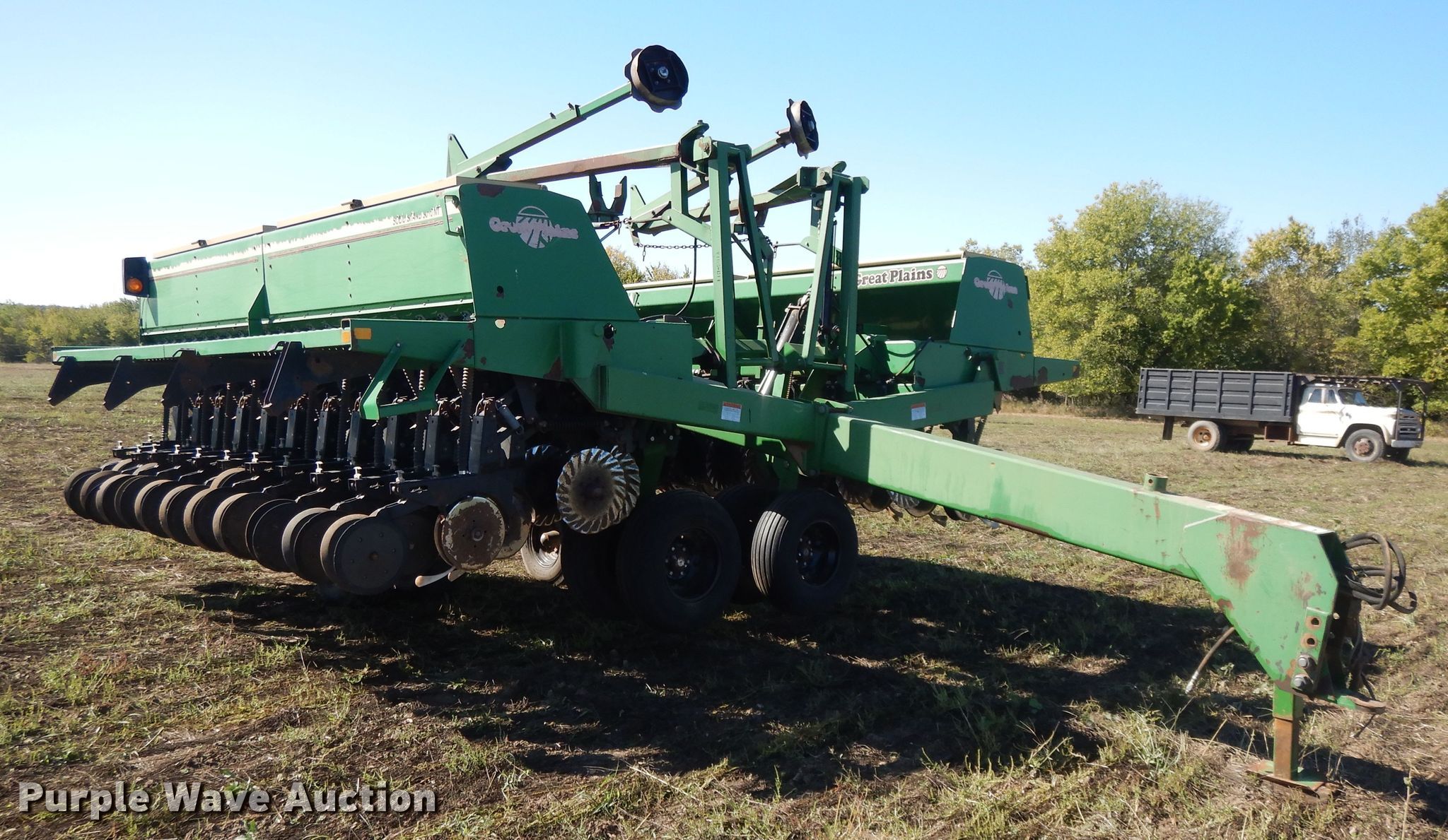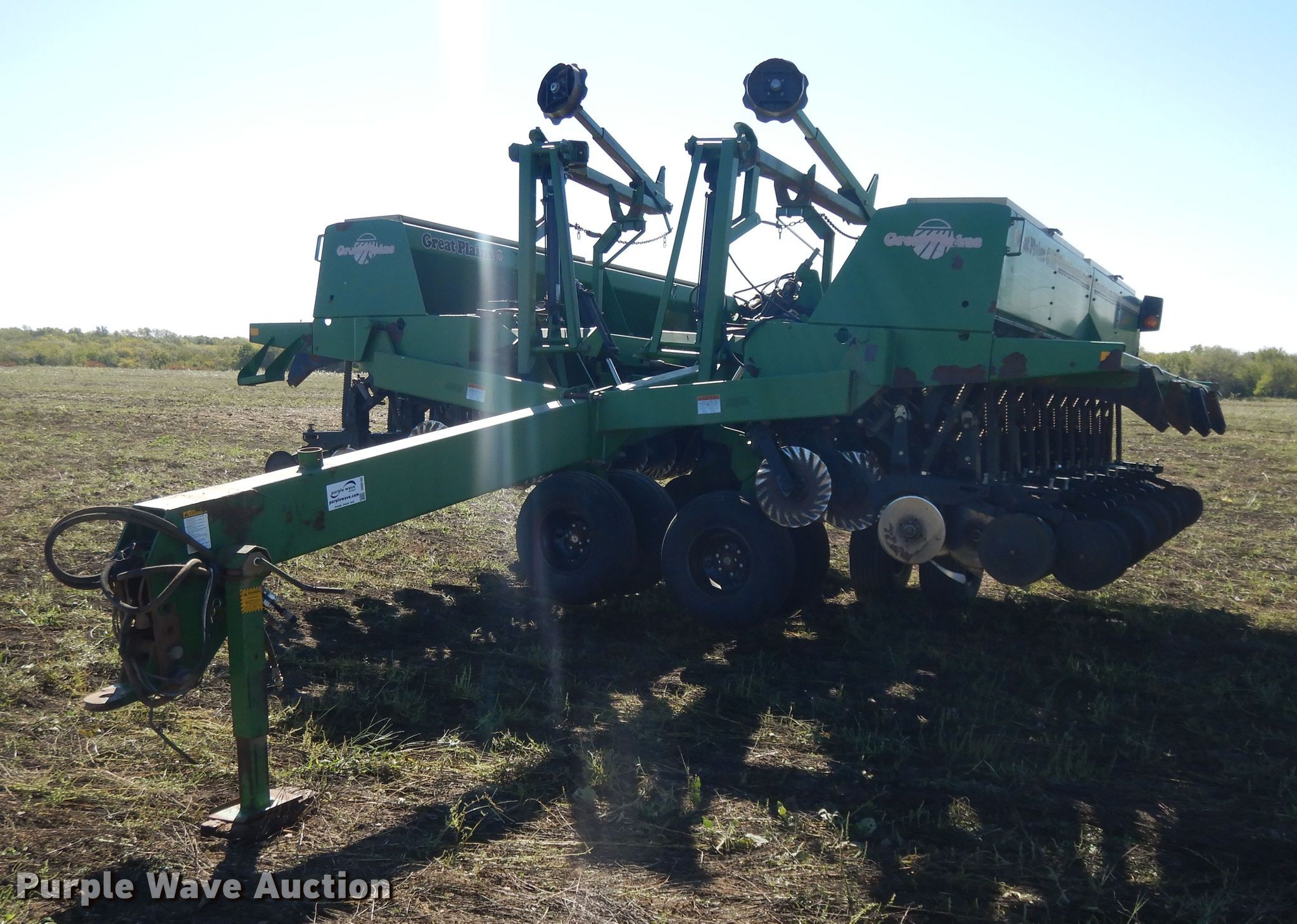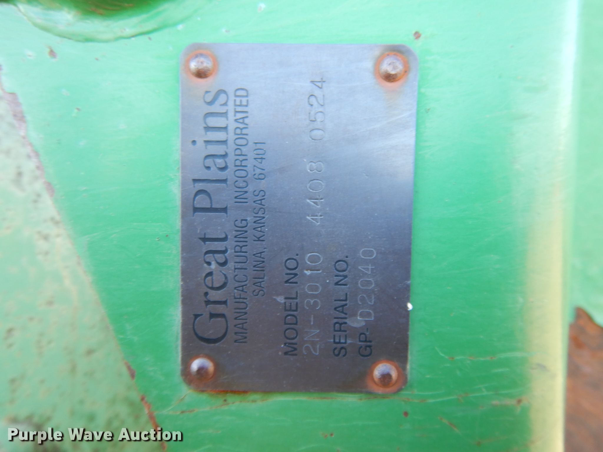 Purple Wave is selling a used Grain Drill or Seeder in Kansas. This item is a 1998 Great Plains 2N-3010 grain drill with the following: 30'W, 44 row units, 7.5" row spacing, Marker arms, Hydraulic front fold, Bulk fill system, Spring down pressure, No-till coulters, Seed firmers, Double disk openers, Double rubber closing system, (4) 12.5x15 transport tires, (4) 12.5x15 drive/outside tires, Left transport tire tread missing, Serial 02040