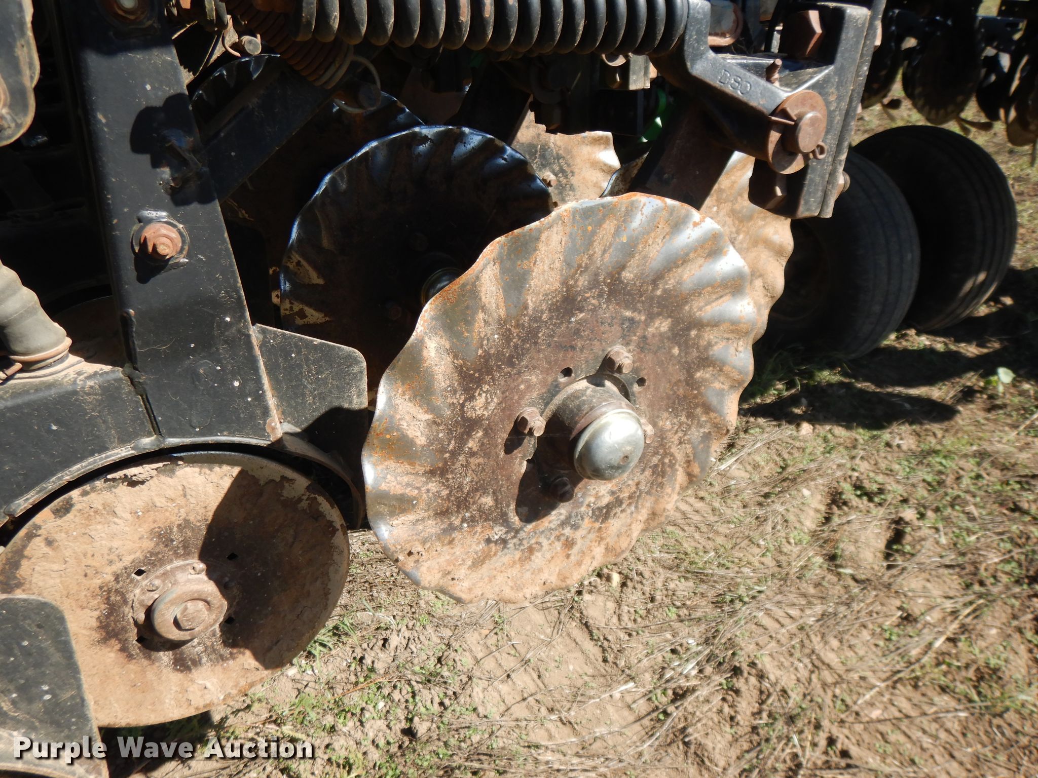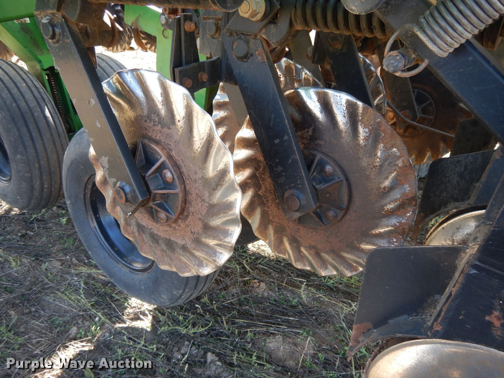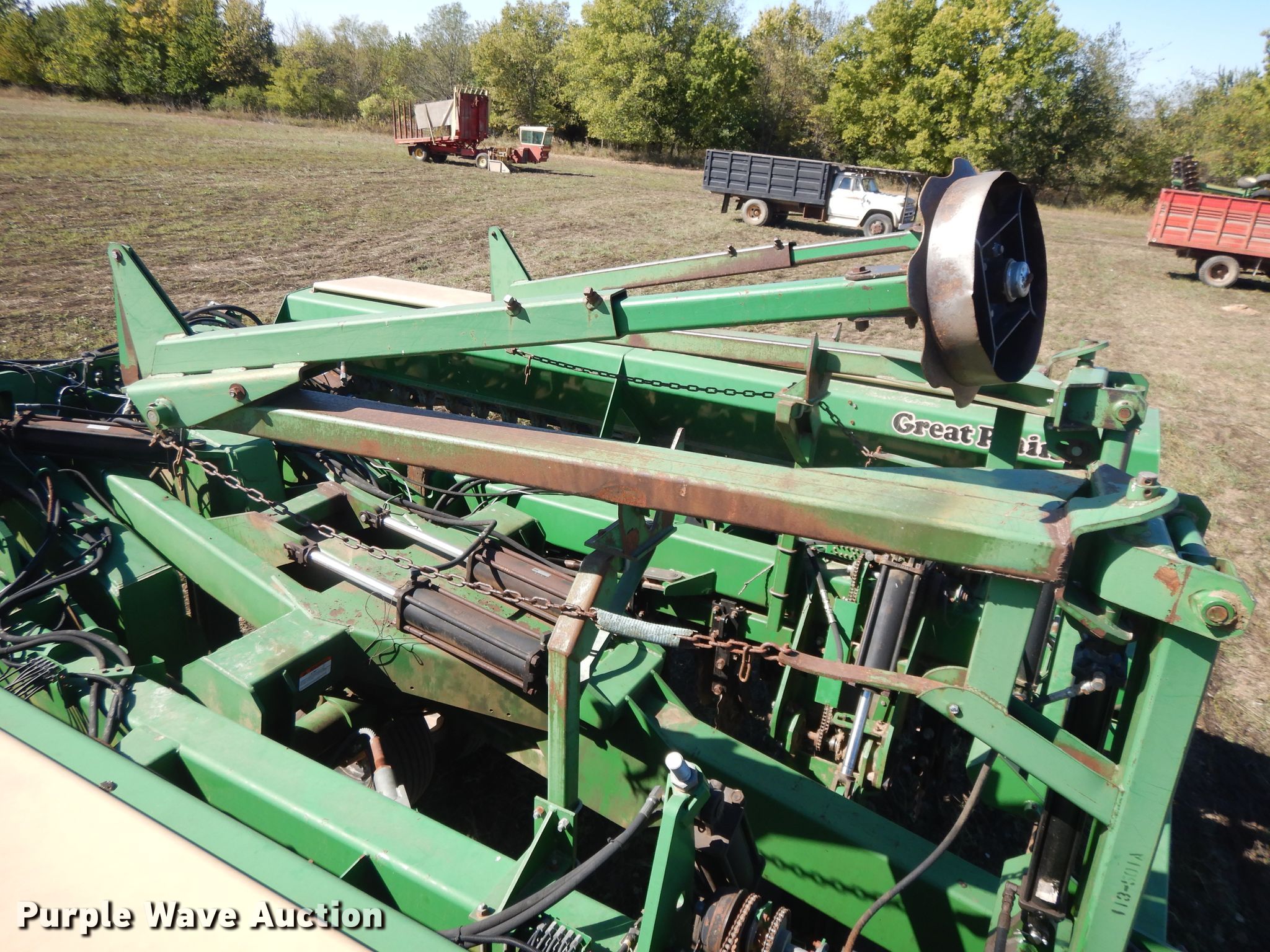Purple Wave is selling a used Grain Drill or Seeder in Kansas. This item is a 1998 Great Plains 2N-3010 grain drill with the following: 30'W, 44 row units, 7.5" row spacing, Marker arms, Hydraulic front fold, Bulk fill system, Spring down pressure, No-till coulters, Seed firmers, Double disk openers, Double rubber closing system, (4) 12.5x15 transport tires, (4) 12.5x15 drive/outside tires, Left transport tire tread missing, Serial 02040