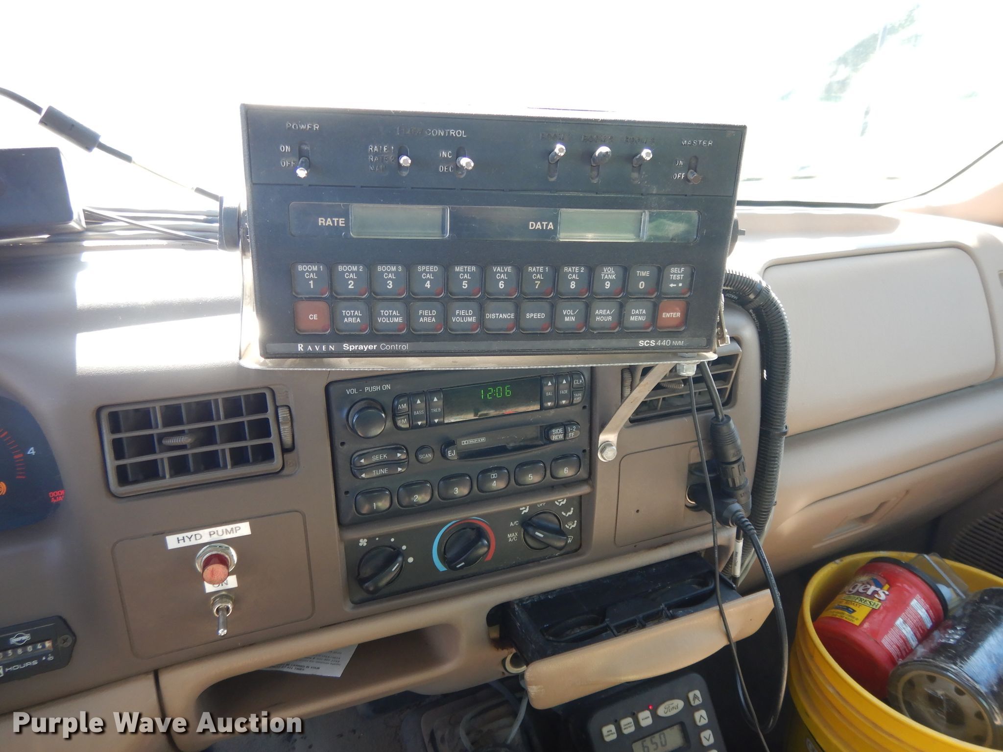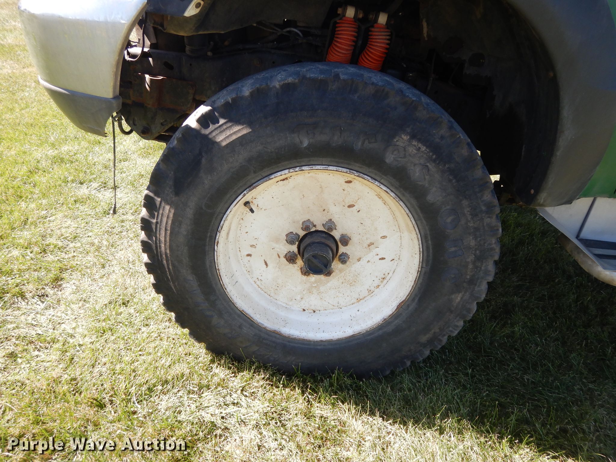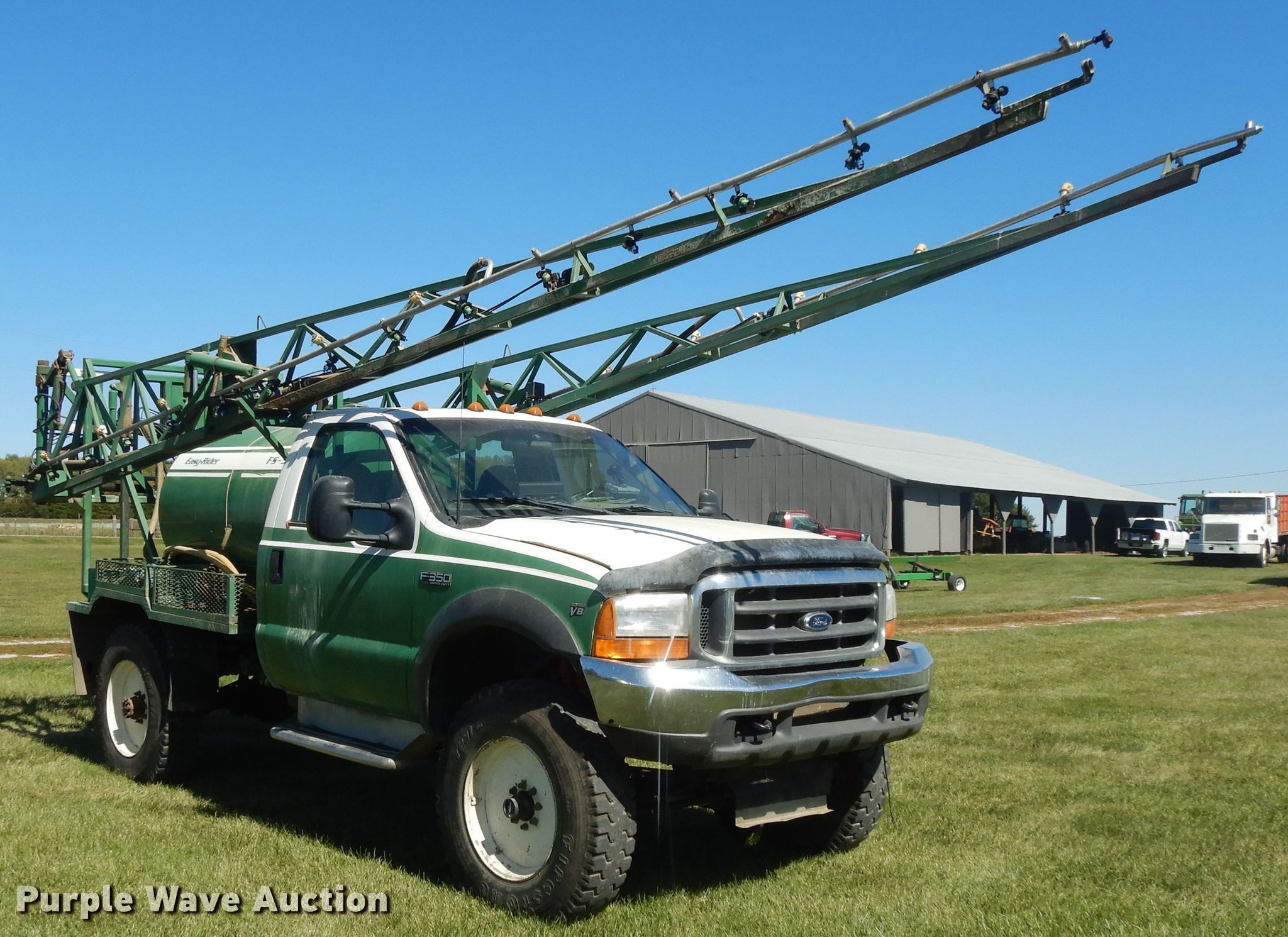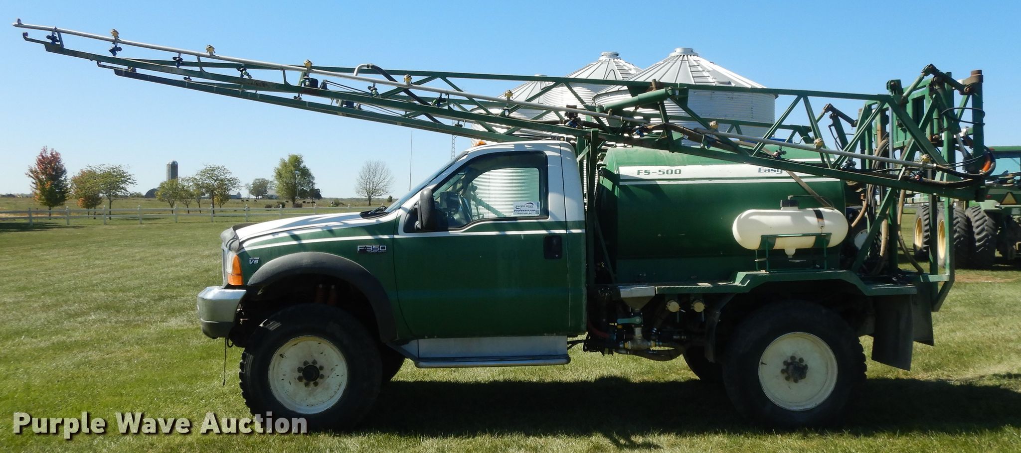 Purple Wave is selling a used Applicator Truck in Kansas. This item is a 1999 Ford F350 Super Duty applicator truck with the following: 40,111 miles on odometer, 7.3L V8 OHV 16V diesel engine, Five speed manual transmission, Four wheel drive, AC, 500 gallon solution tank, One gallon stainless steel chemical eductor tank, 25 gallon foam marker tank, 53'W boom, Hydraulic boom fold, Hydraulic height control, 20" nozzle spacing, Four-way nozzle bodies, 11R22.5 row crop tires, Some nozzle tips missing, Power steering pump is weak