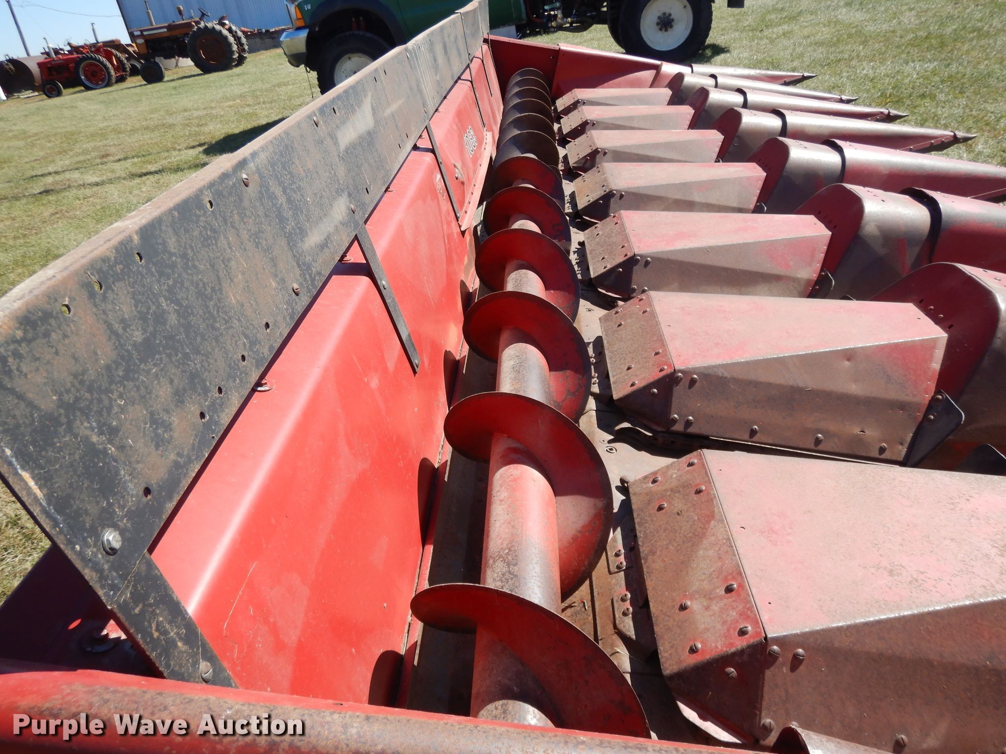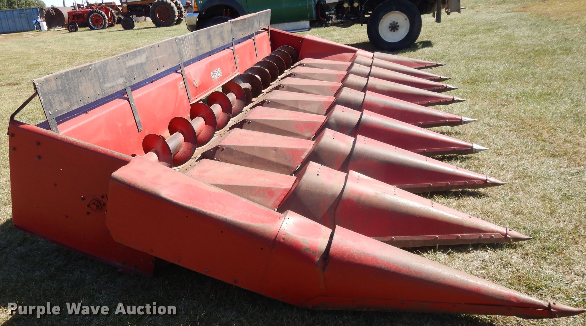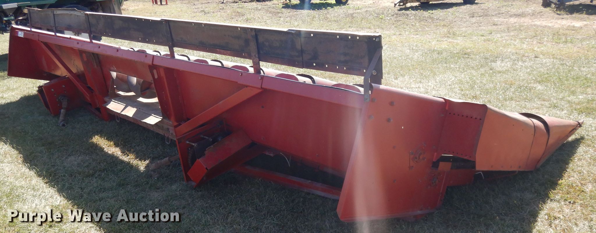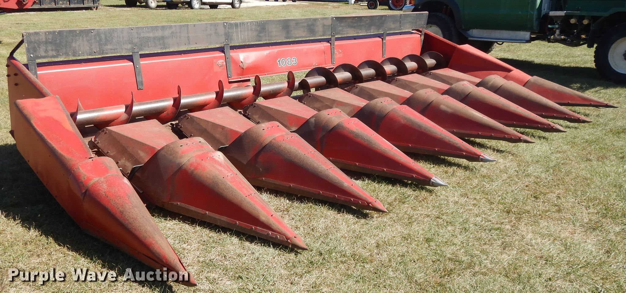 Purple Wave is selling a used Corn or Row Head in Kansas. This item is a Case 1083 corn head with the following: Eight row units, 30" row spacing, Knife rollers, Dual drivelines, Single point coupler, Serial JJC0144261