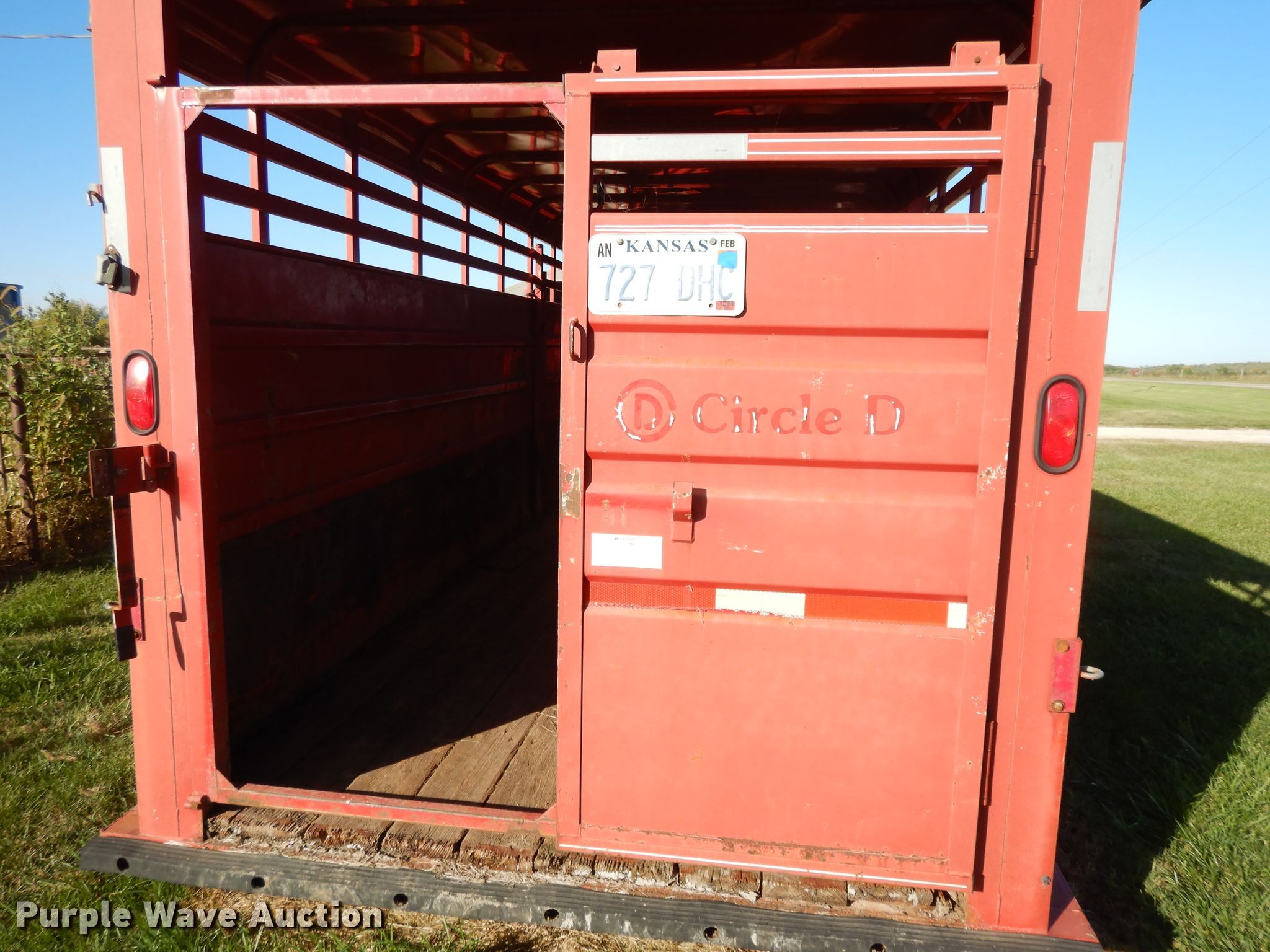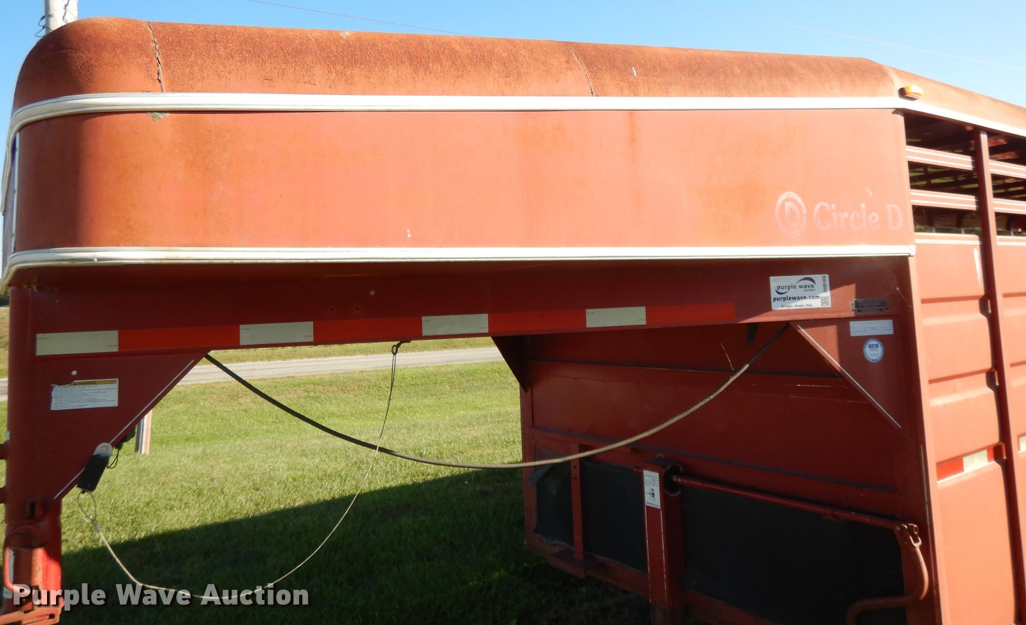 2005 Circle D livestock trailer. 31'L x 8'W overall, 24'L x 78"W body, Center gate, Spring suspension, Electric brakes, Tandem axle, Steel wheels, 7.5-16 tires, GVWR 14,315 lbs, GAWR 7,000 lbs, Rust holes in lower corners. Kansas title. 4D3SG322951011249. Katzer Estate. 33800 NE 1800. Centerville, KS 66014