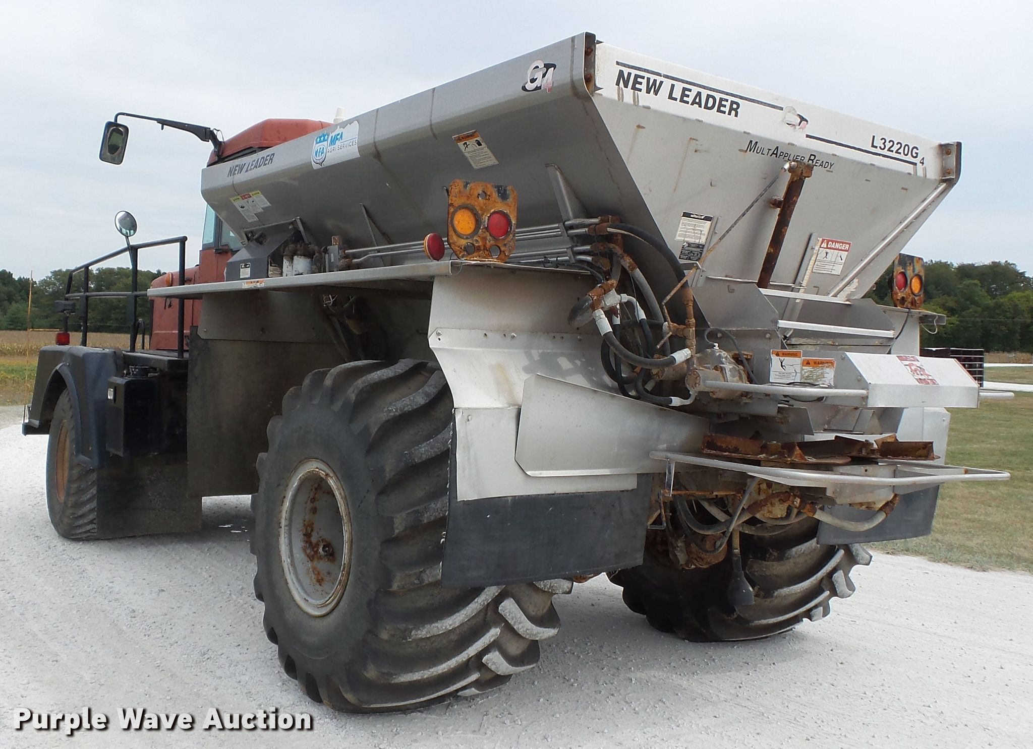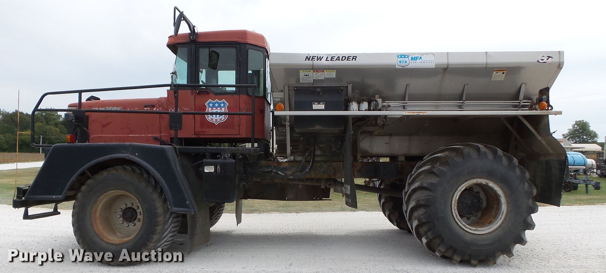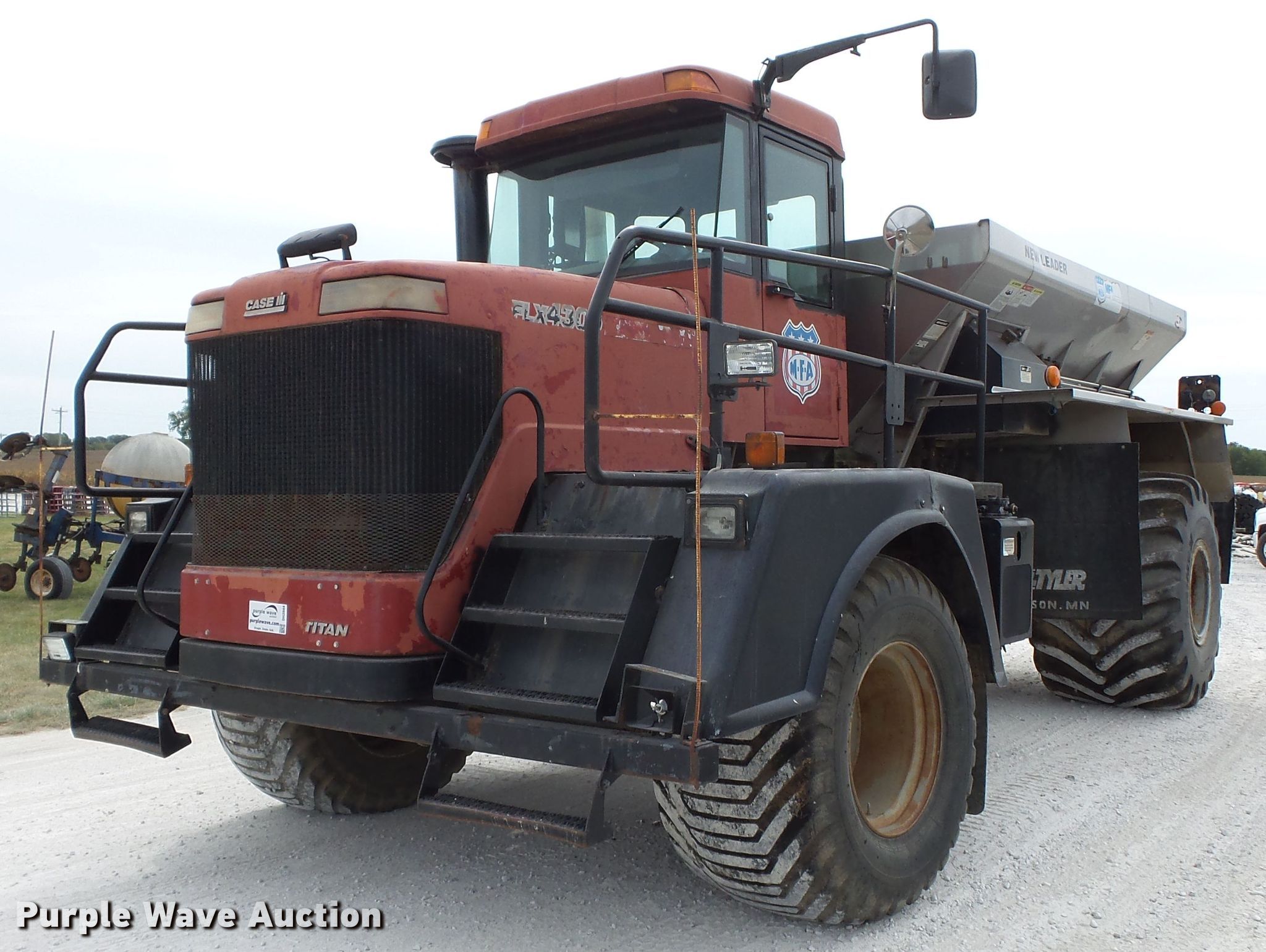 2002 Case IH Titan FLX4375 applicator. 70,939 miles on odometer, Engine hours: 7,044, Case six cylinder diesel engine, Allison automatic transmission, AC and heat, Light bar, New Leader L3220G4 stainless steel dry fertilizer spreader bed 14'L, Dual spinners, 30"W conveyor belt, 5' multi-applier bin, 800/45-26.5 front flotation tires, 66x43.00-25 rear flotation tires, Serial 22610, Unit# 51934000. MFA Inc.. 3501 US-61. Perryville, MO 63775