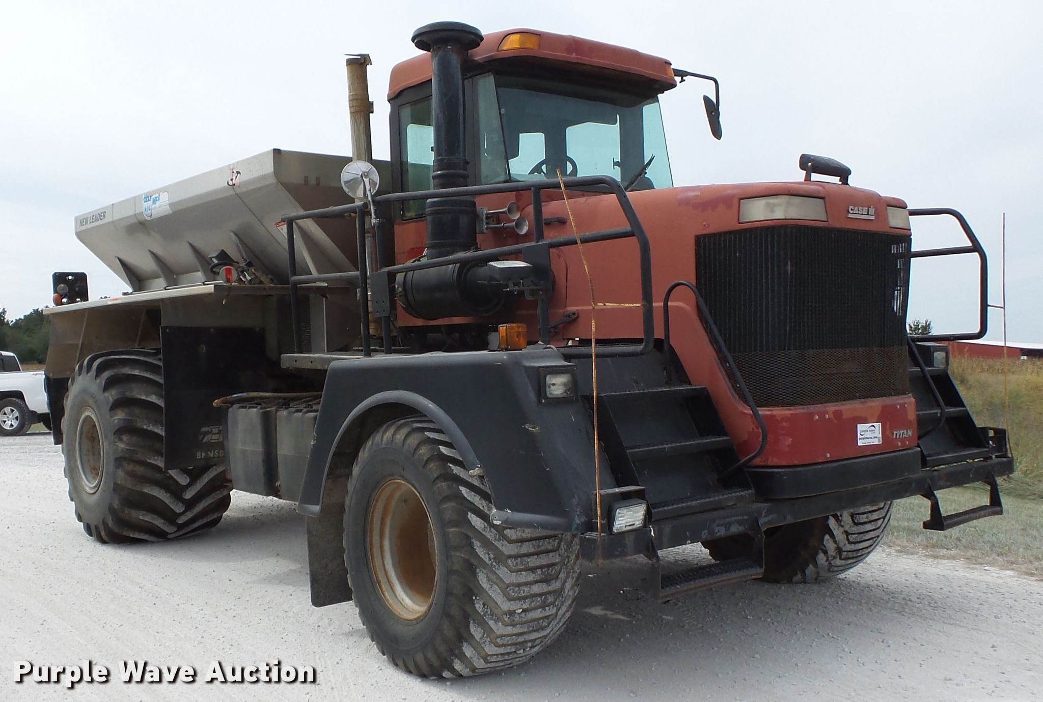 Purple Wave is selling a used Applicator Self Propelled in Missouri. This item is a 2002 Case IH Titan FLX4375 applicator with the following: 70,939 miles on odometer, Engine hours: 7,044, Case six cylinder diesel engine, Allison automatic transmission, AC and heat, Light bar, New Leader L3220G4 stainless steel dry fertilizer spreader bed, 14'L, Dual spinners, 30"W conveyor belt, 5' multi-applier bin, 800/45-26.5 front flotation tires, 66x43.00-25 rear flotation tires, Serial 22610, Unit# 51934000