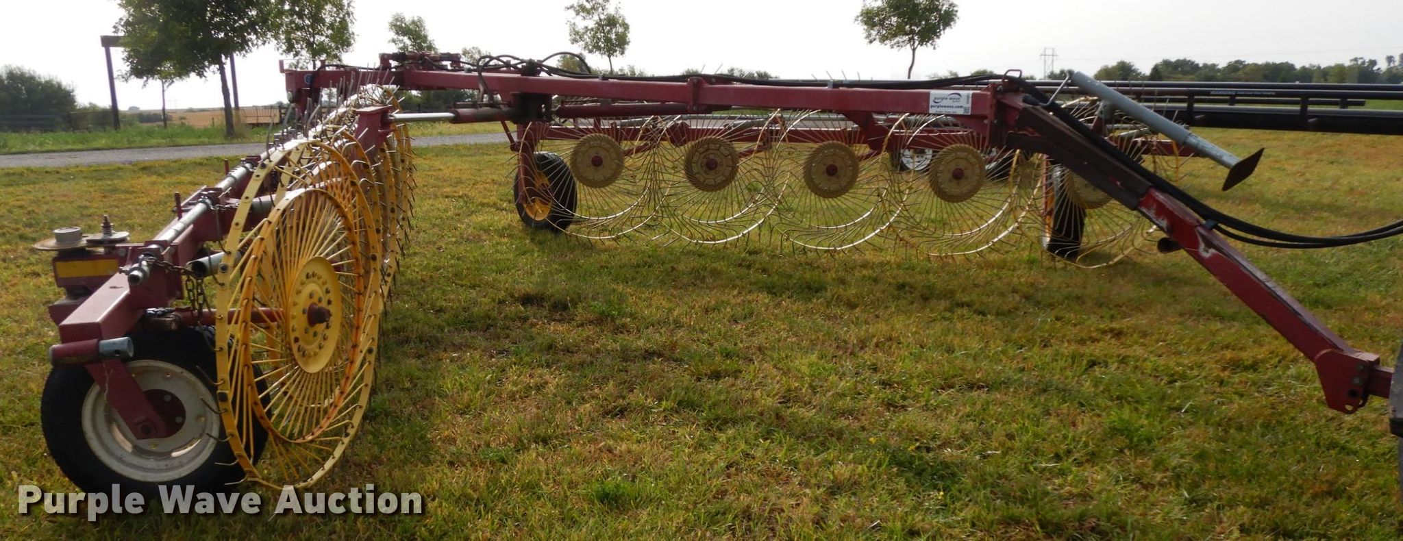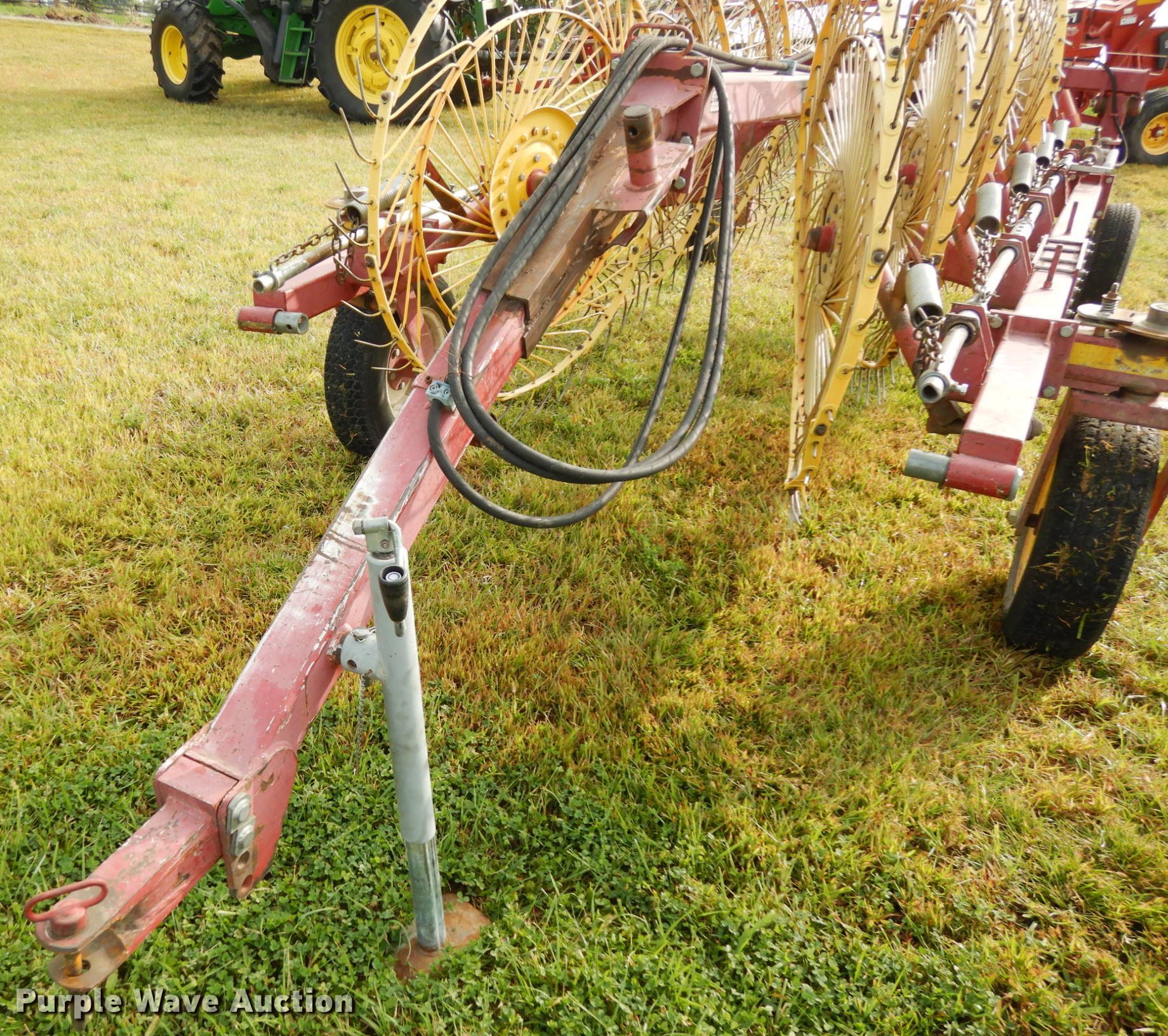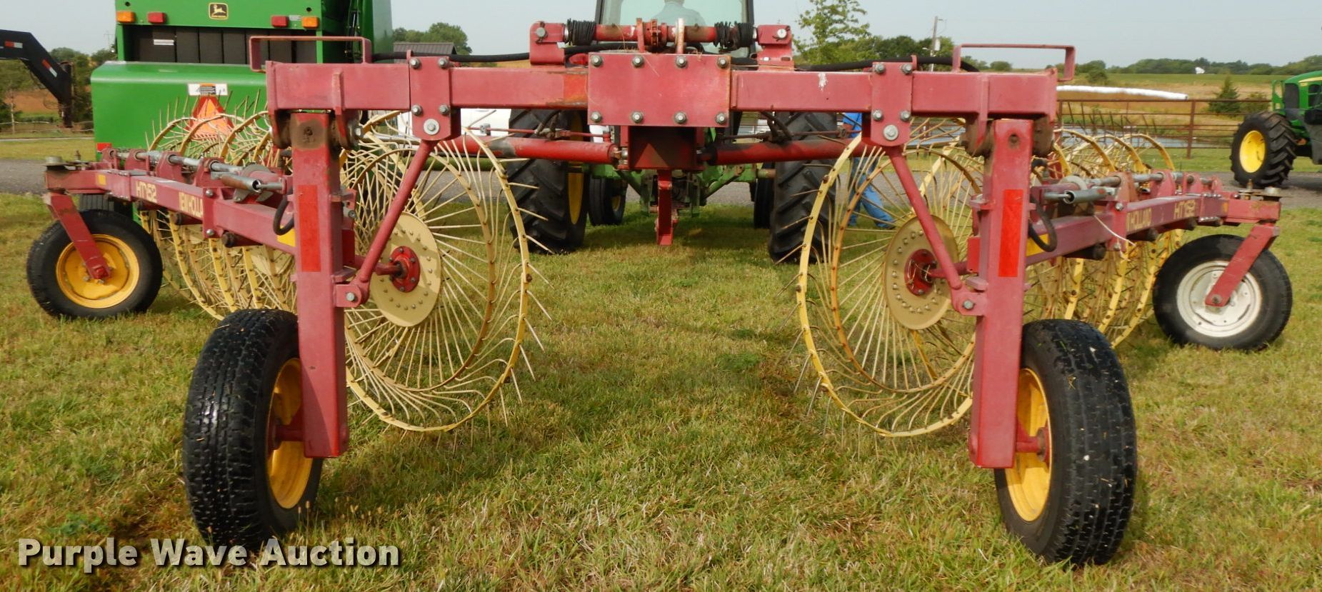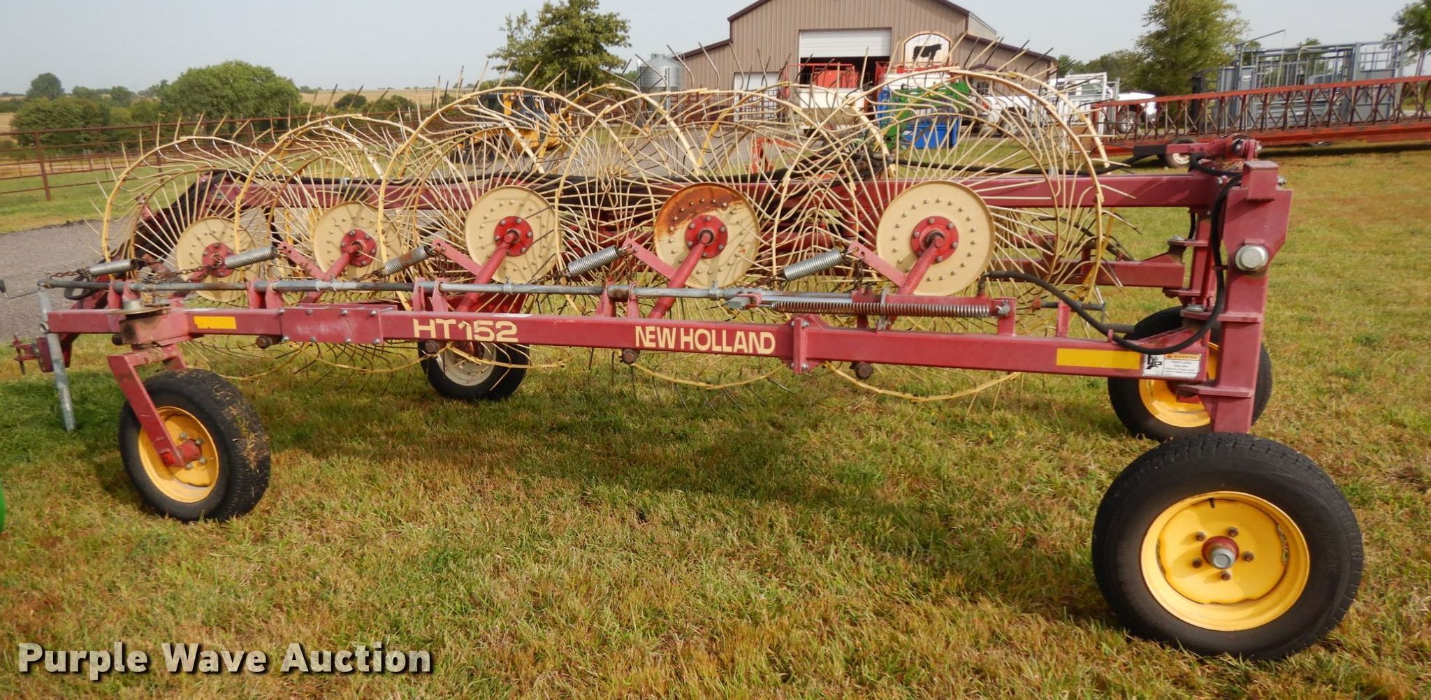 Purple Wave is selling a used Hay Rake in Nebraska. This item is a New Holland HT152 hay rake with the following: (10) wheels, Hydraulic lift and fold, ST205/75R15 tires, Tongue has been reinforced, plates welded on, Serial 142578