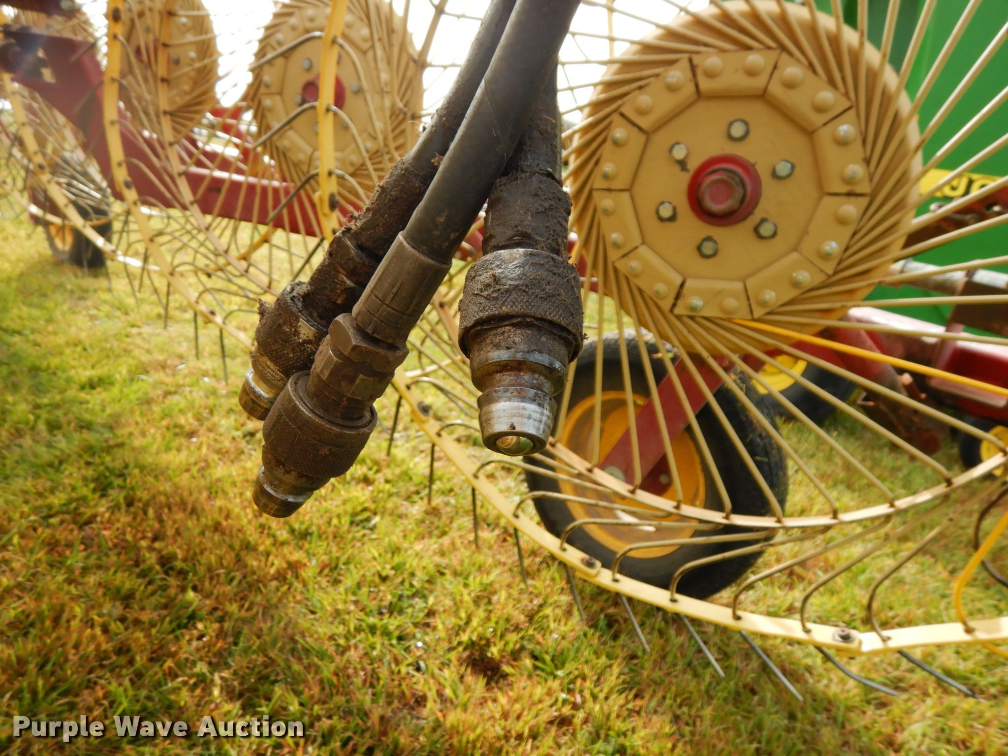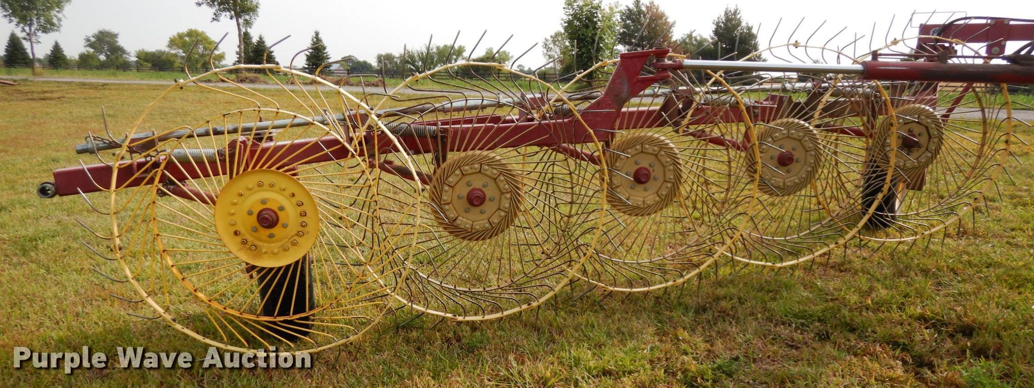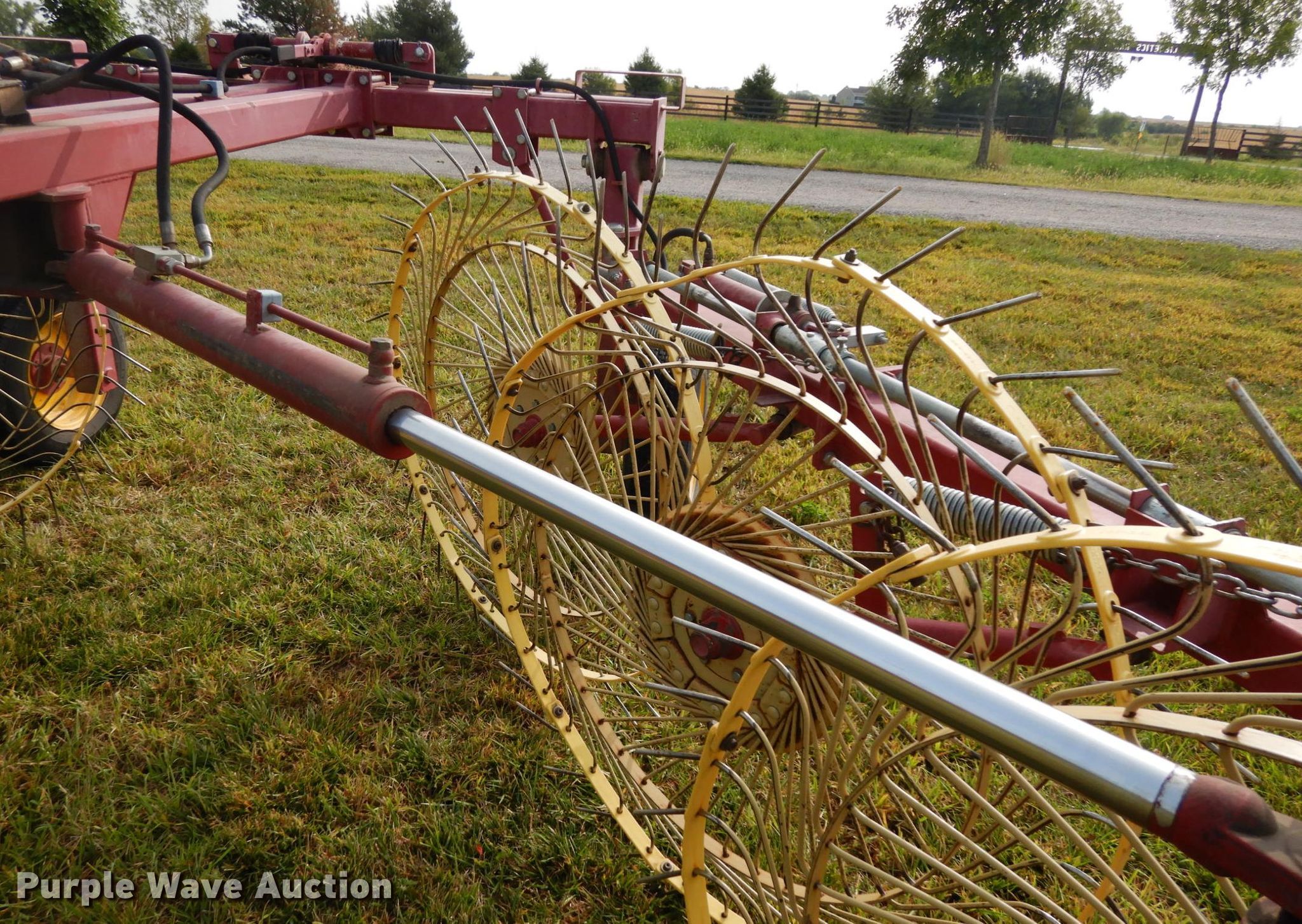 Purple Wave is selling a used Hay Rake in Nebraska. This item is a New Holland HT152 hay rake with the following: (10) wheels, Hydraulic lift and fold, ST205/75R15 tires, Tongue has been reinforced, plates welded on, Serial 142578