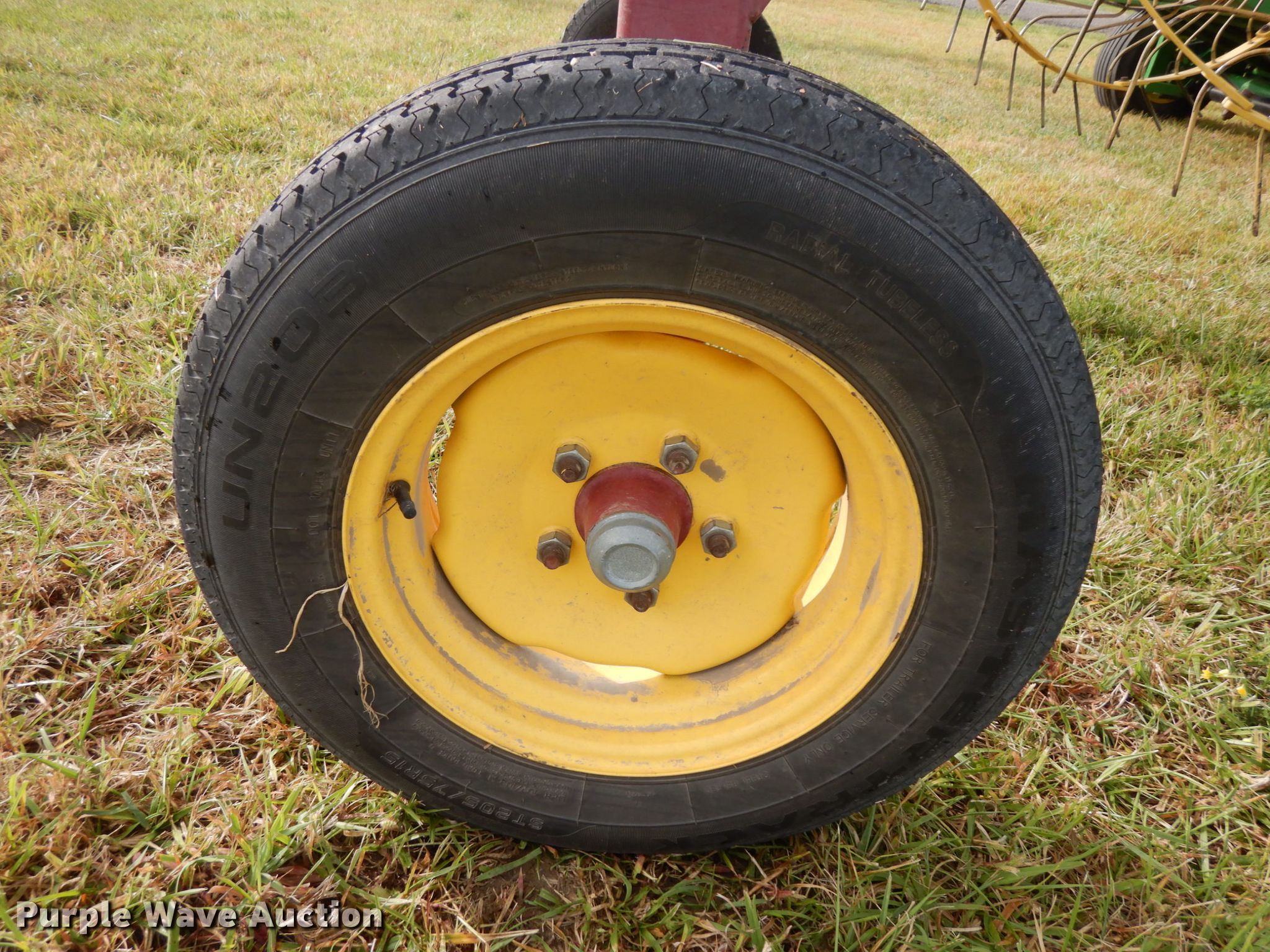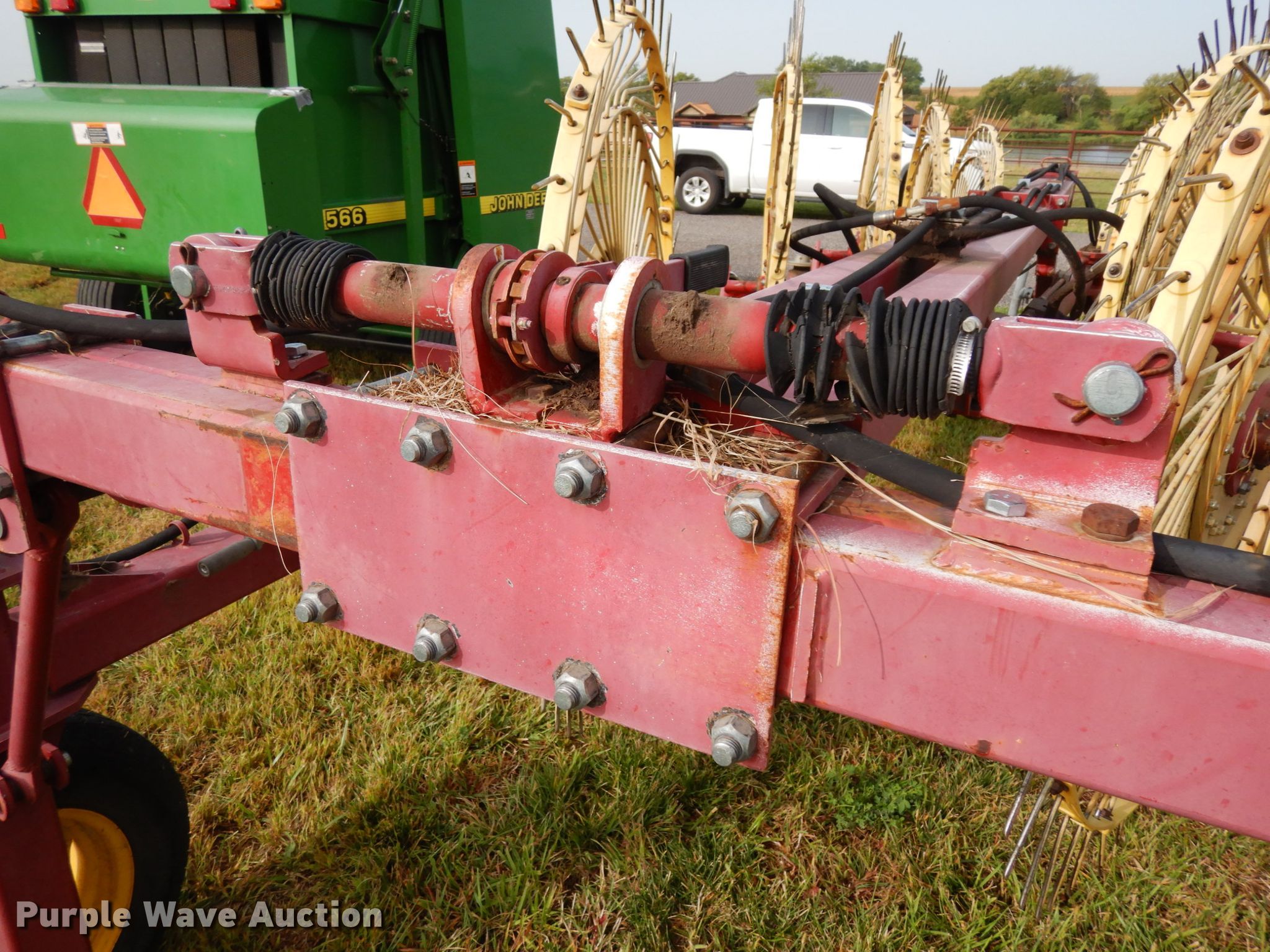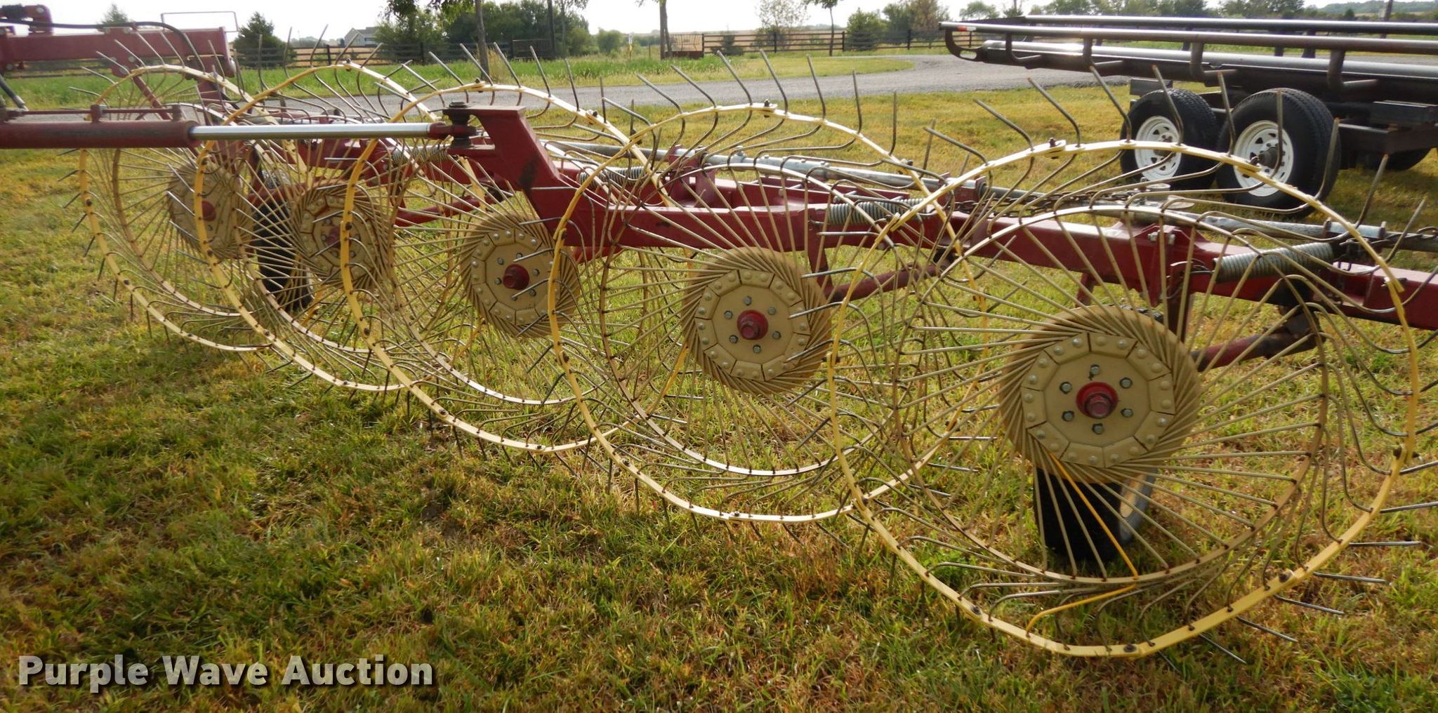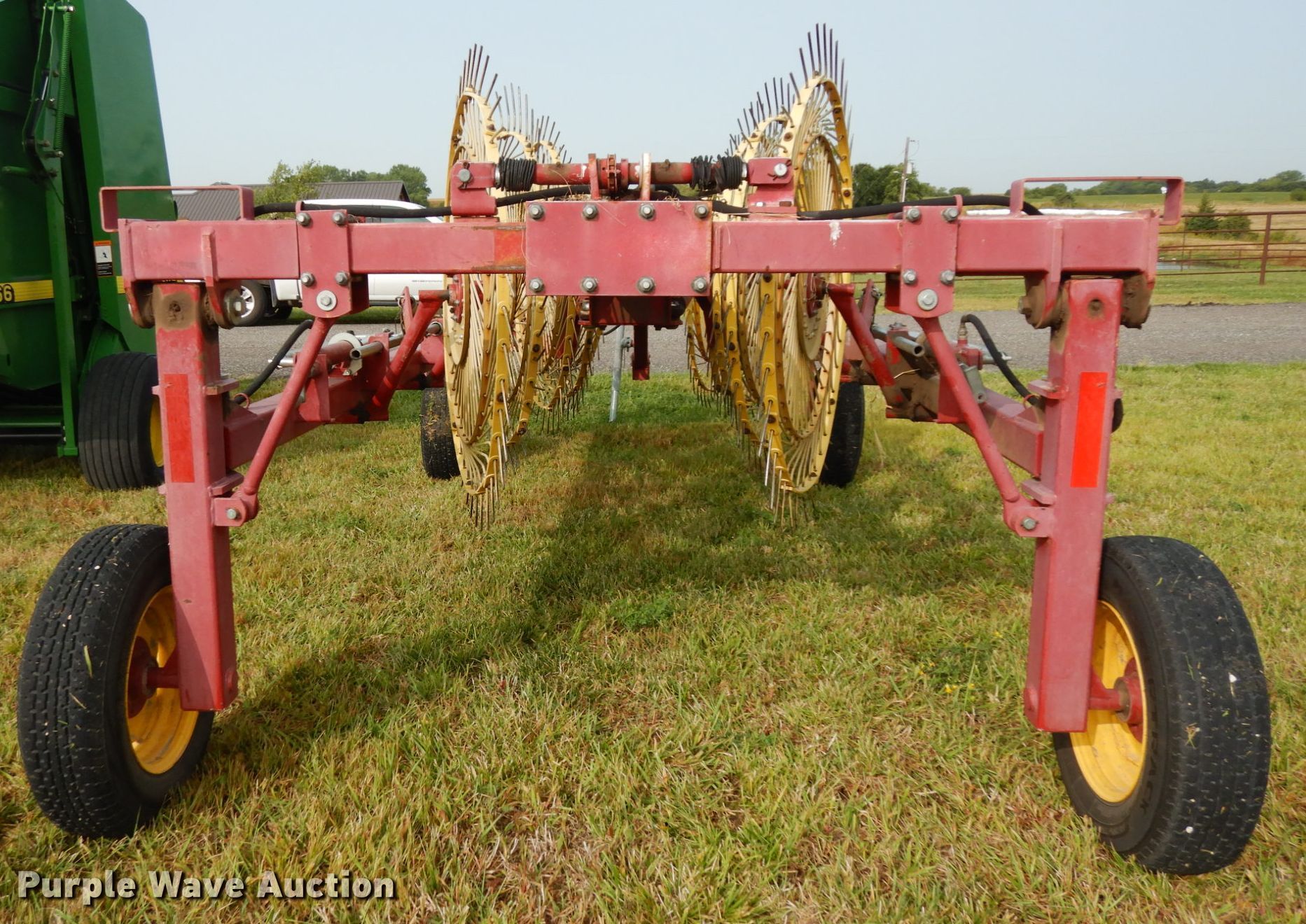 Purple Wave is selling a used Hay Rake in Nebraska. This item is a New Holland HT152 hay rake with the following: (10) wheels, Hydraulic lift and fold, ST205/75R15 tires, Tongue has been reinforced, plates welded on, Serial 142578