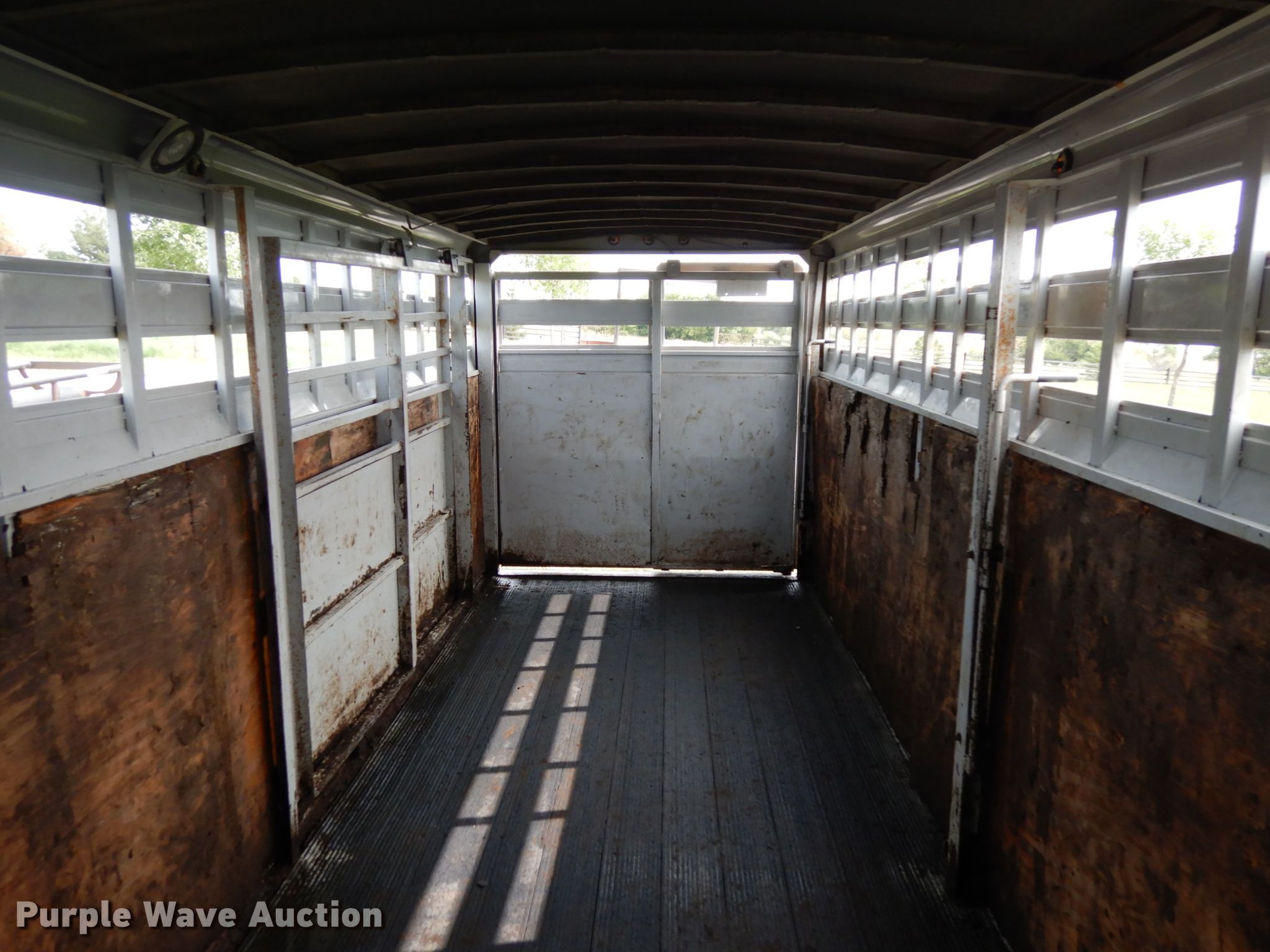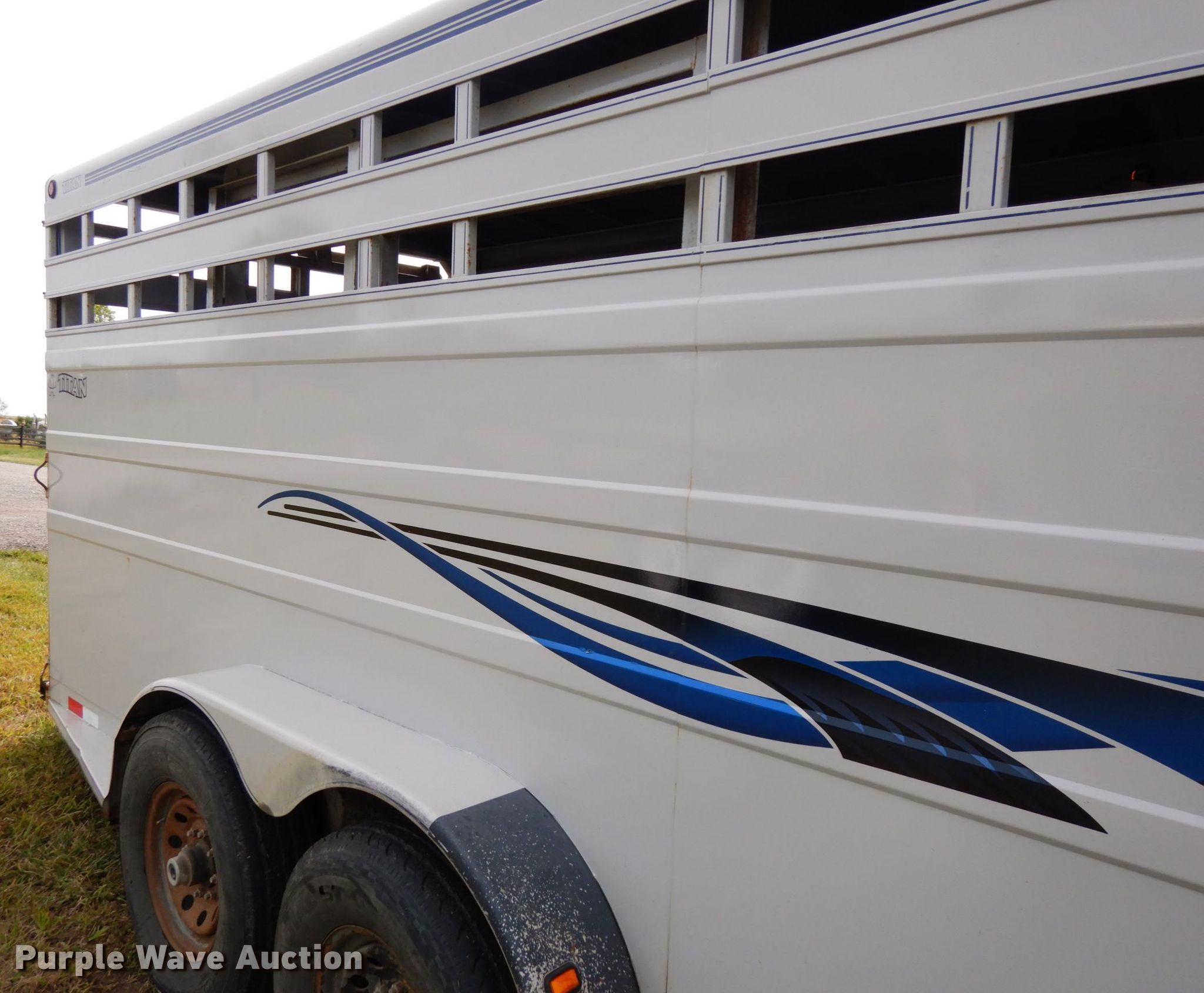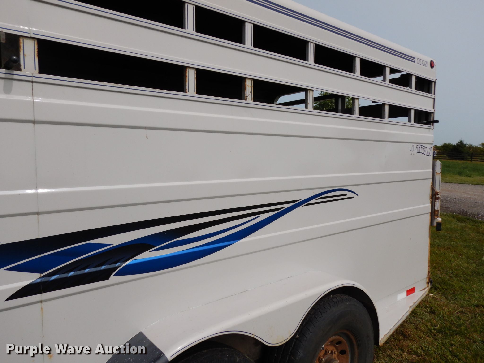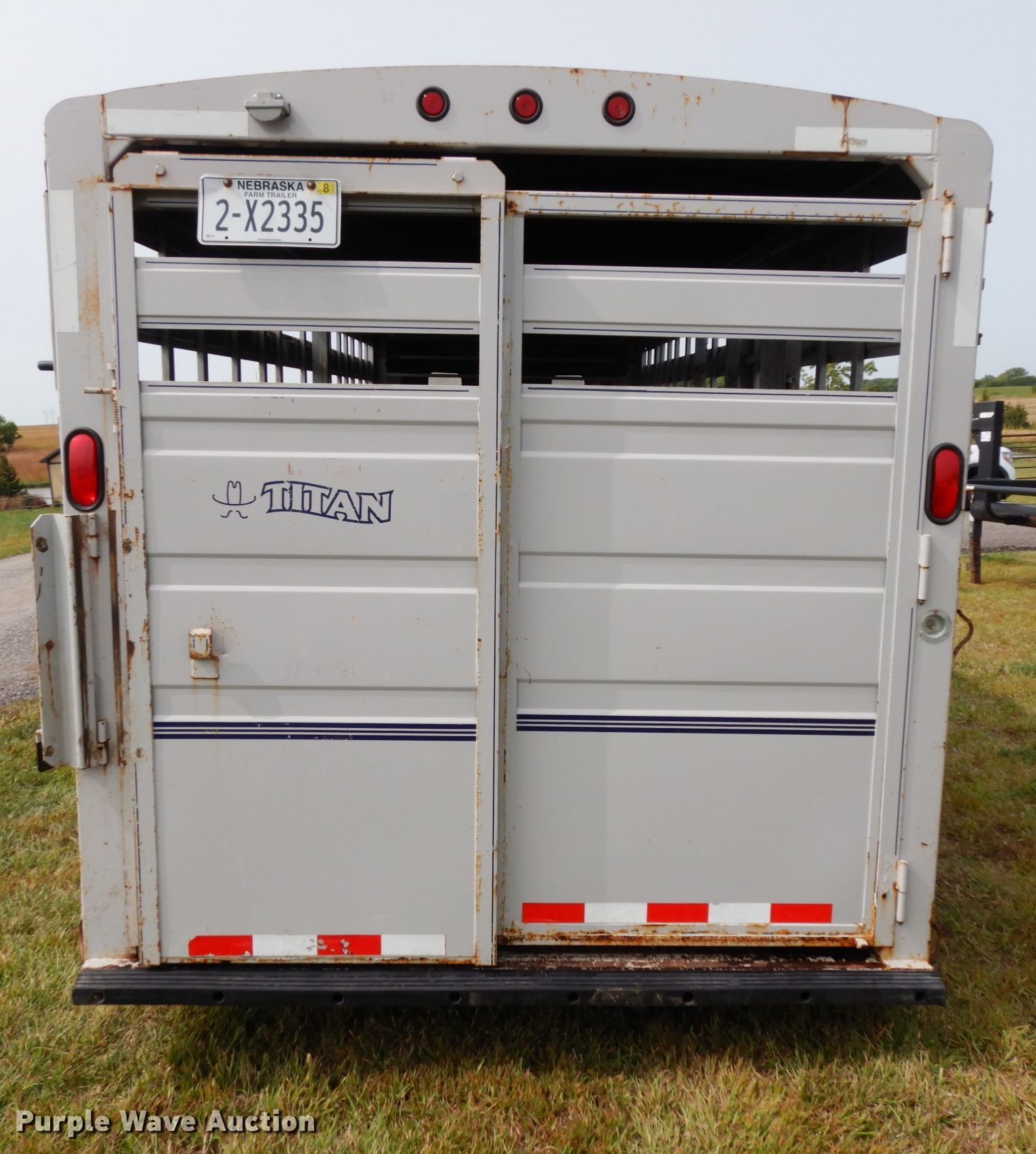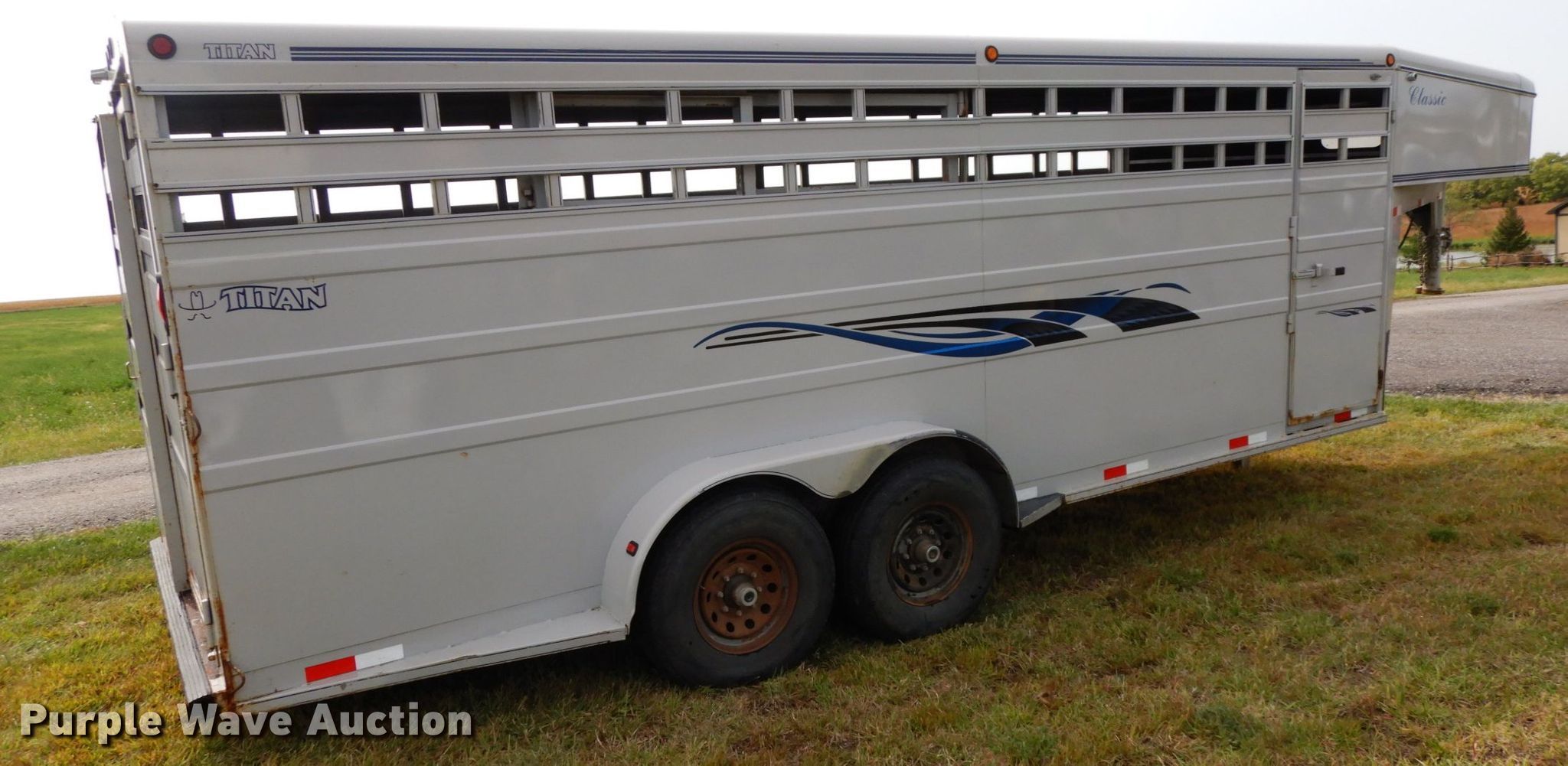 Purple Wave is selling a used Livestock Trailer in Nebraska. This item is a 2001 Titan Classic livestock trailer with the following: 27.5'L x 82"W overall, 20'L x 76"W body, Center gate, Single leg landing gear, Torsion suspension, Electric brakes, Tandem axle, Steel wheels, ST235/85R16 tires, GVWR 9,760 lbs, GAWR 4,880 lbs, Interior wood panels need to be replaced, Side door lower hinge rusted off