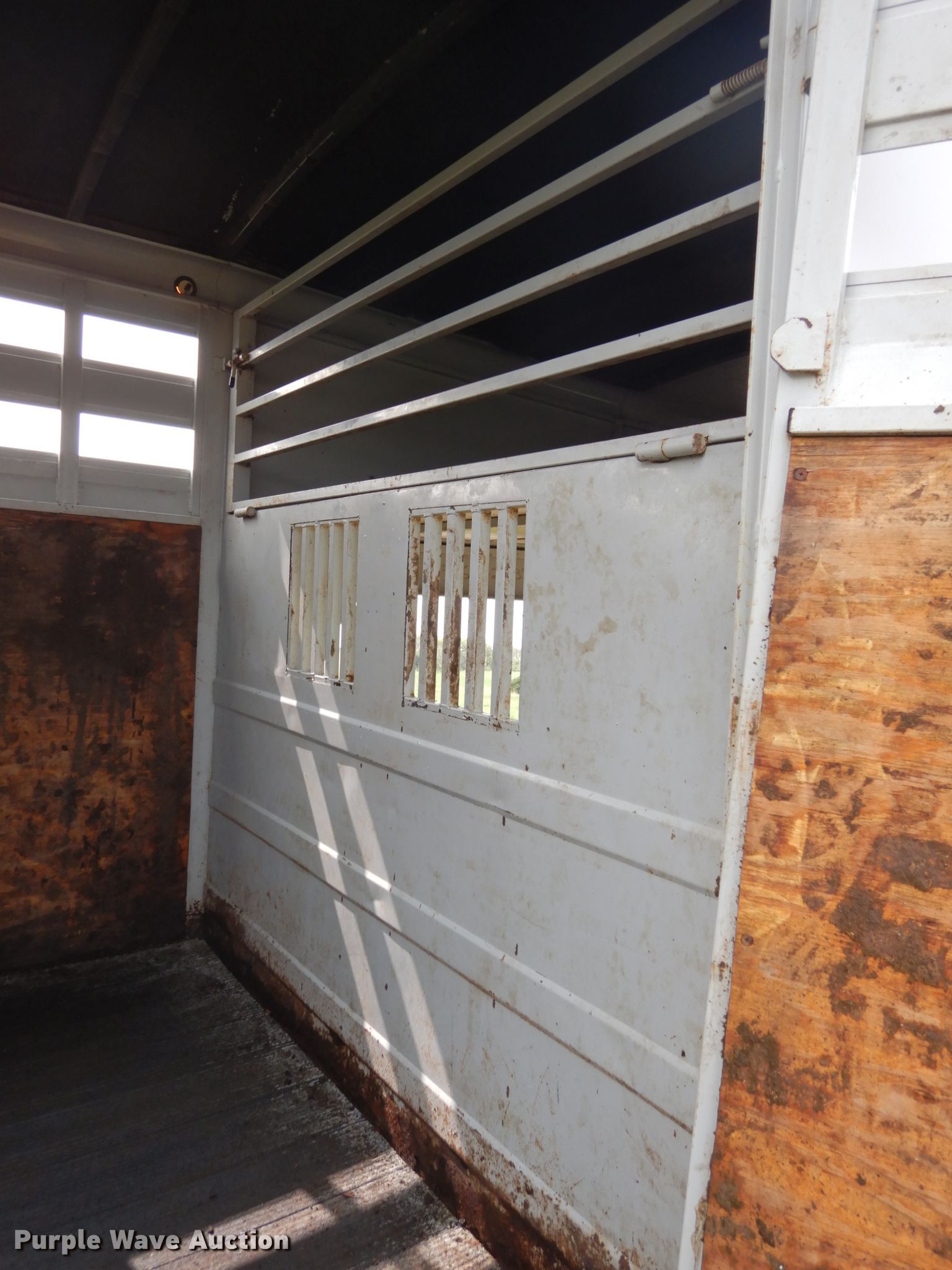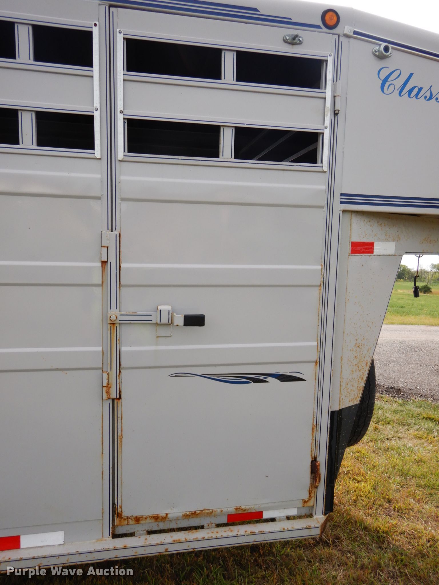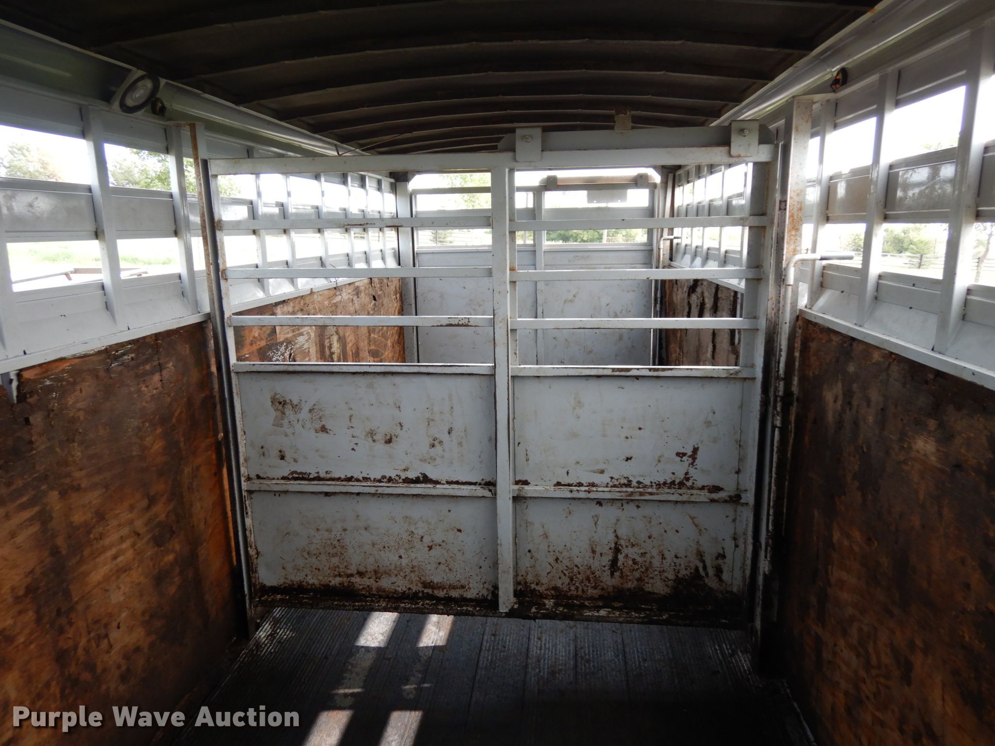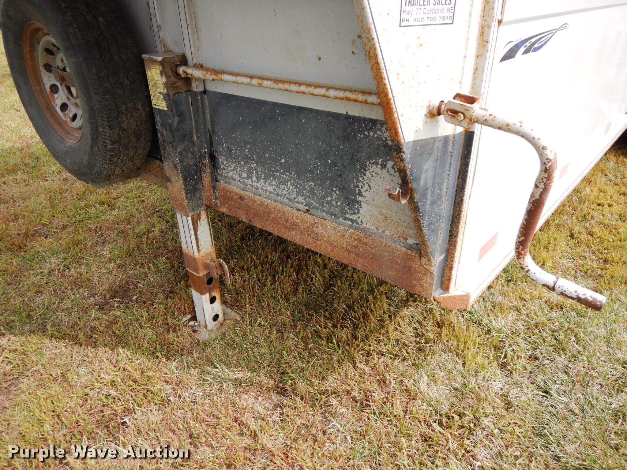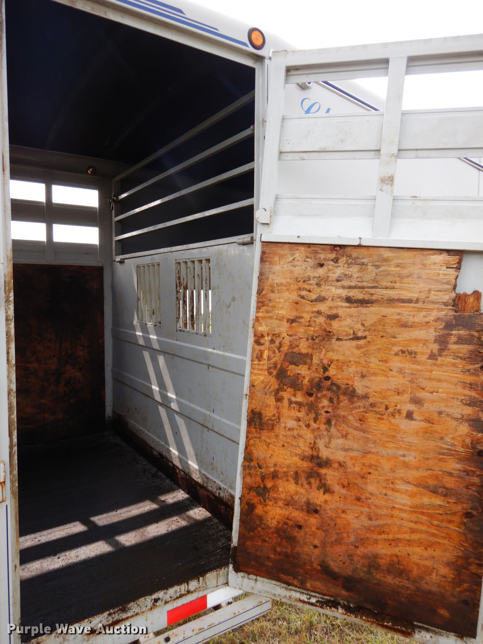 Purple Wave is selling a used Livestock Trailer in Nebraska. This item is a 2001 Titan Classic livestock trailer with the following: 27.5'L x 82"W overall, 20'L x 76"W body, Center gate, Single leg landing gear, Torsion suspension, Electric brakes, Tandem axle, Steel wheels, ST235/85R16 tires, GVWR 9,760 lbs, GAWR 4,880 lbs, Interior wood panels need to be replaced, Side door lower hinge rusted off