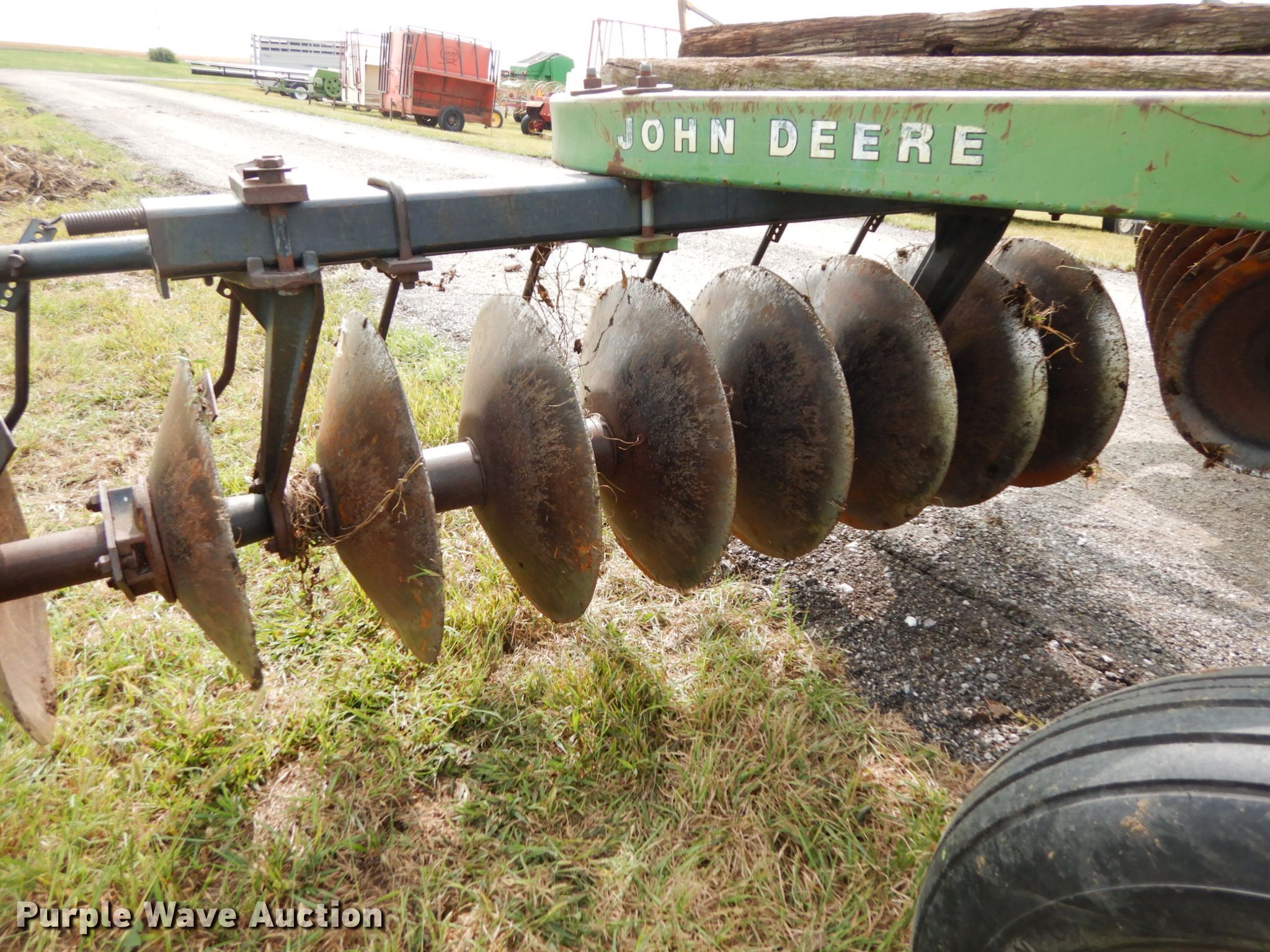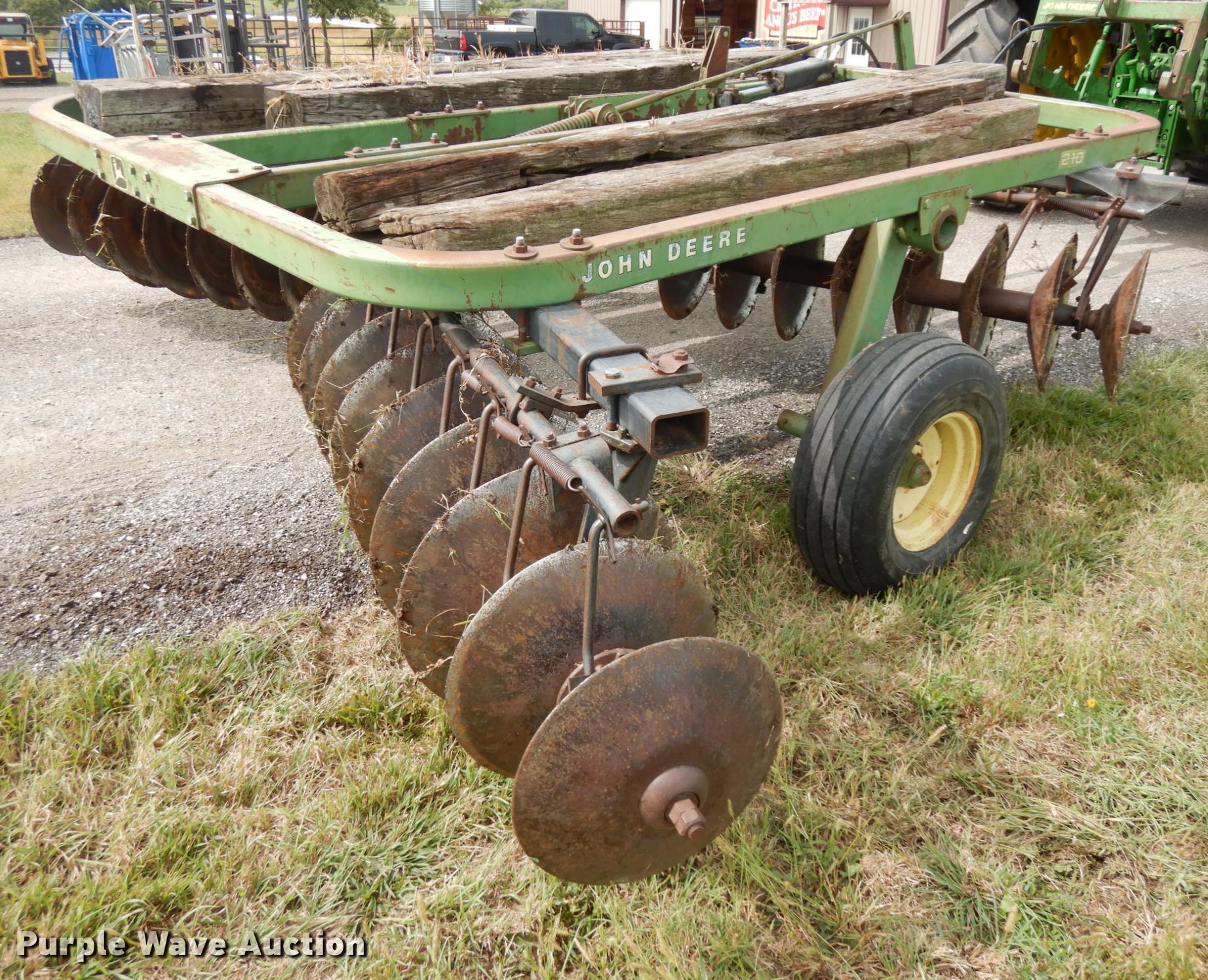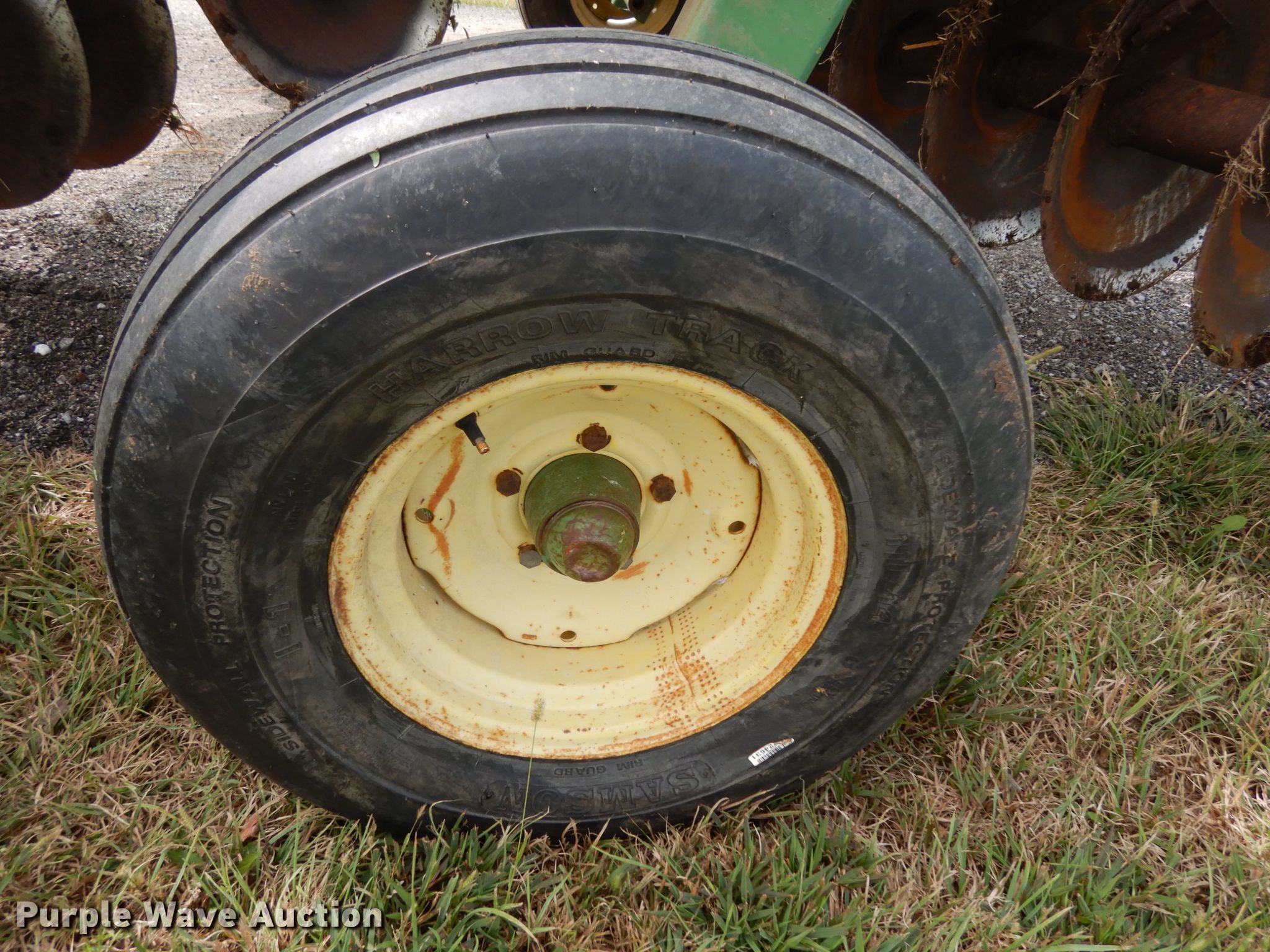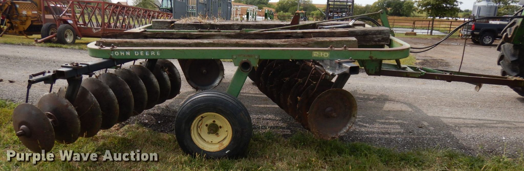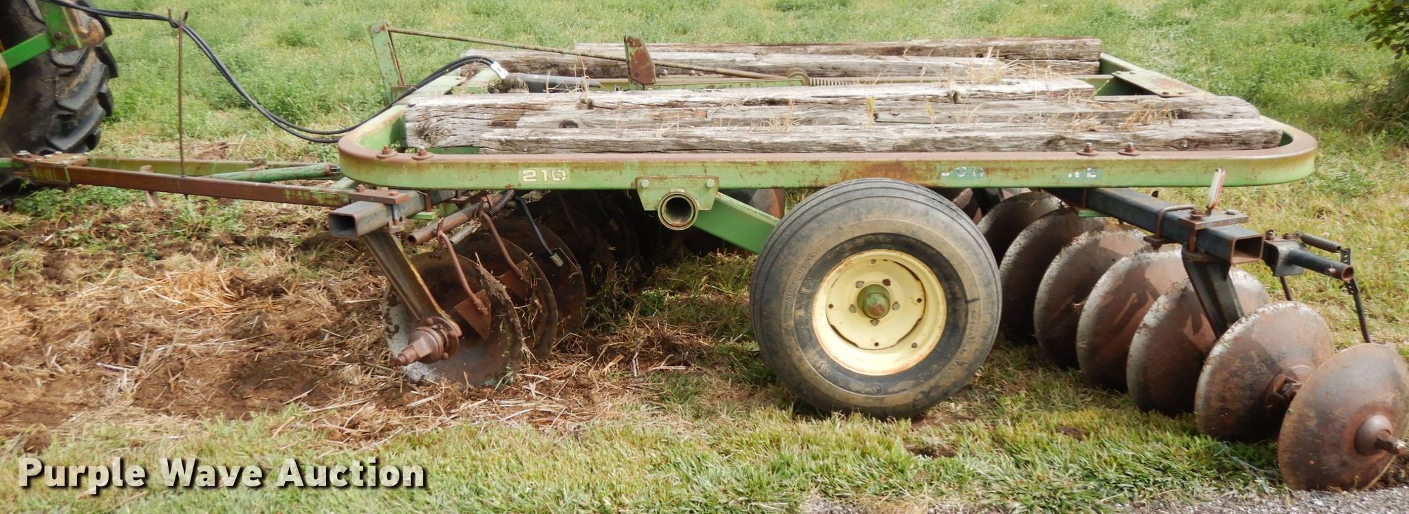 Purple Wave is selling a used Disk in Nebraska. This item is a John Deere 210 tandem disk with the following: Approx. 13'W, Approx. 20" diameter front disks, Approx. 21" diameter rear disks, 9" spacing, Disk scrapers, Manual leveler, Hydraulic lift, 11L-14 tires