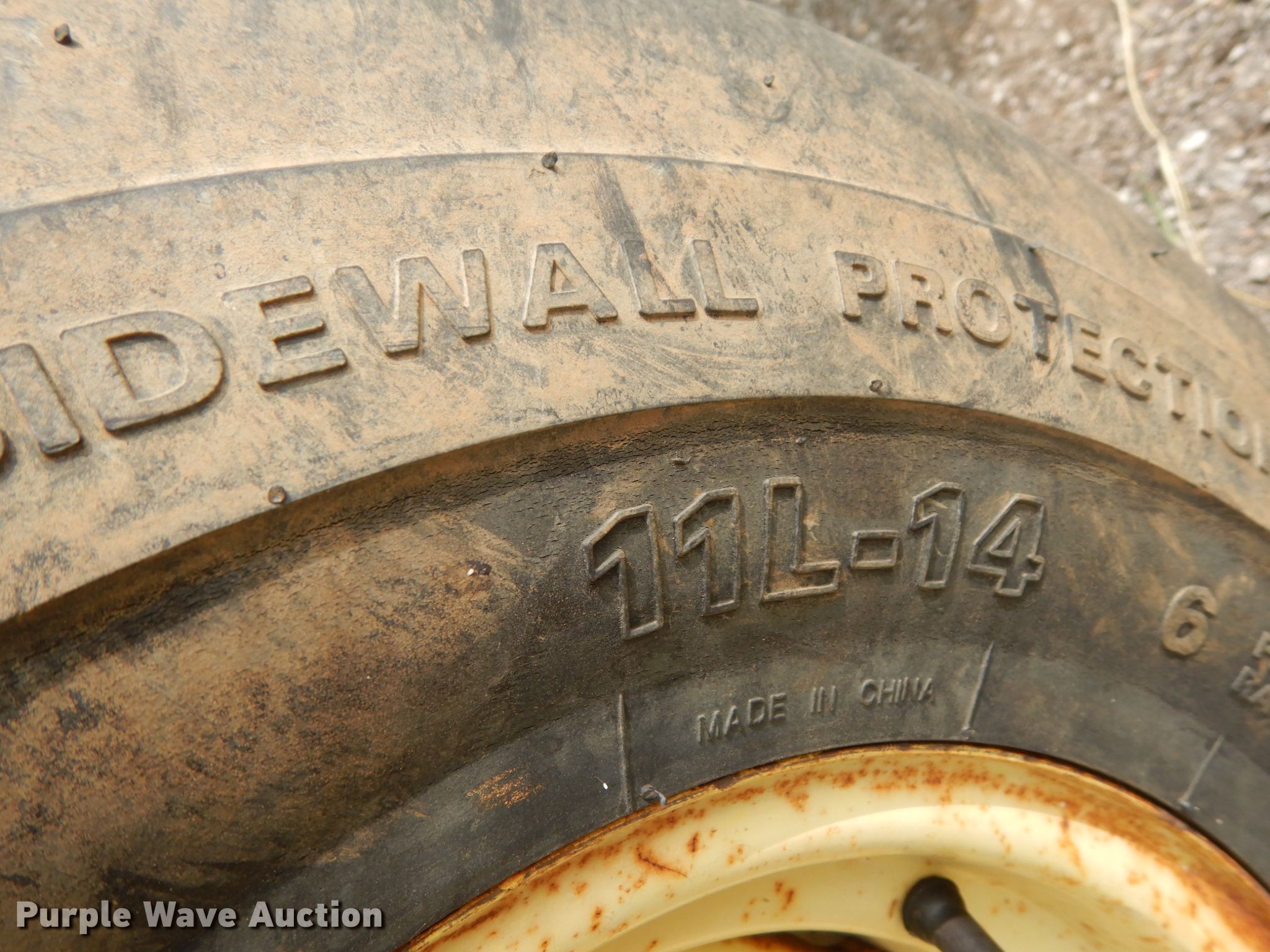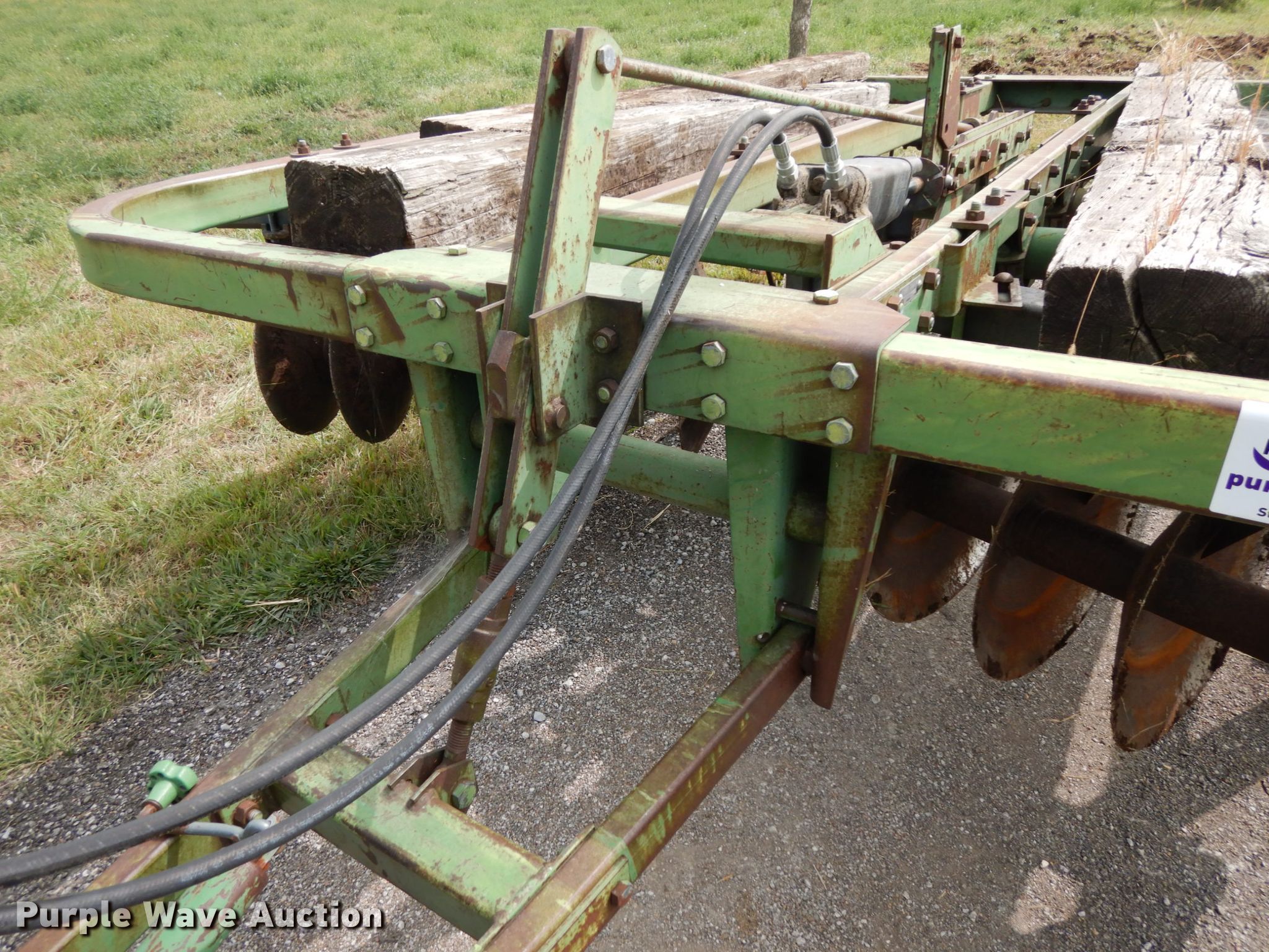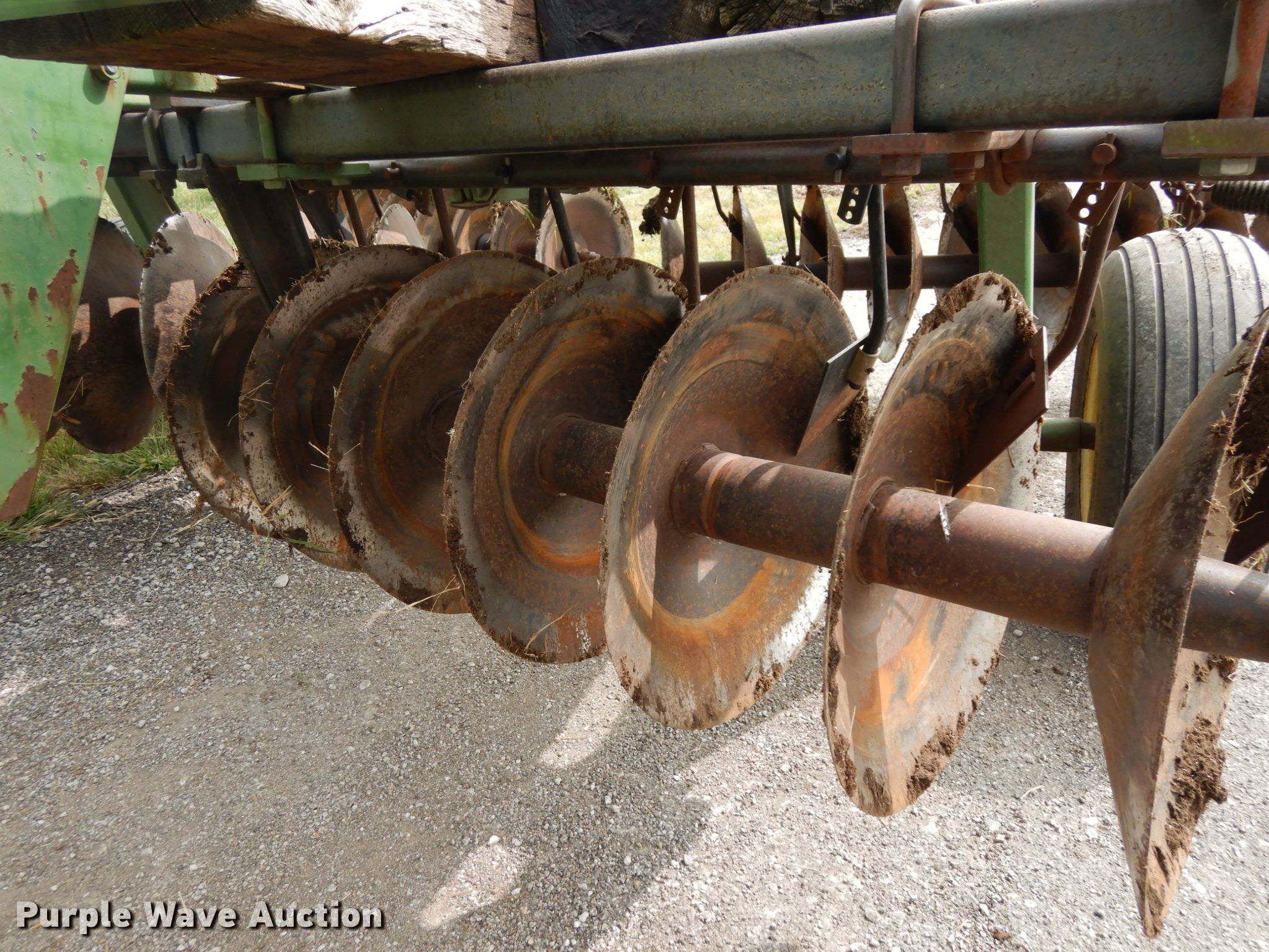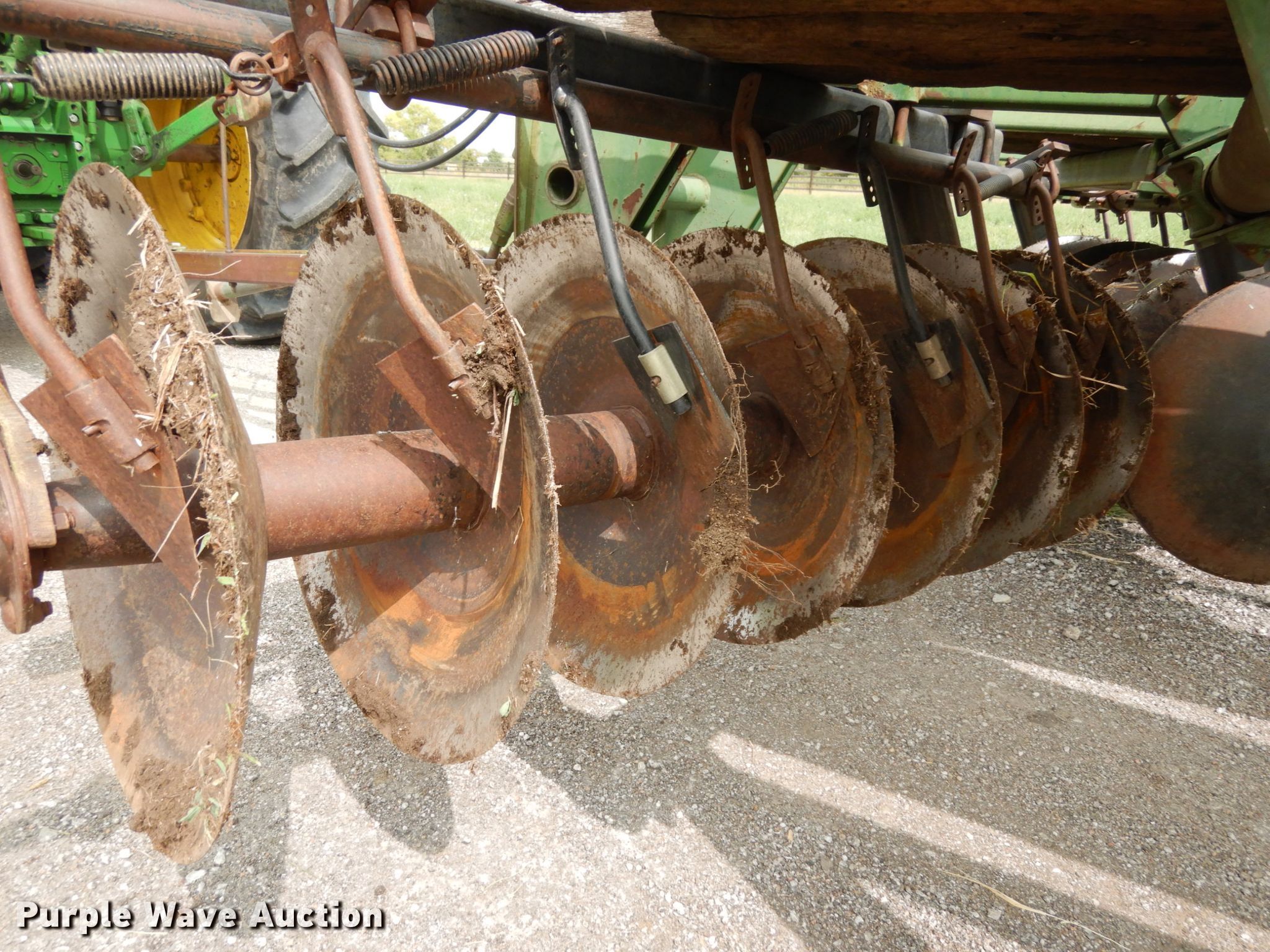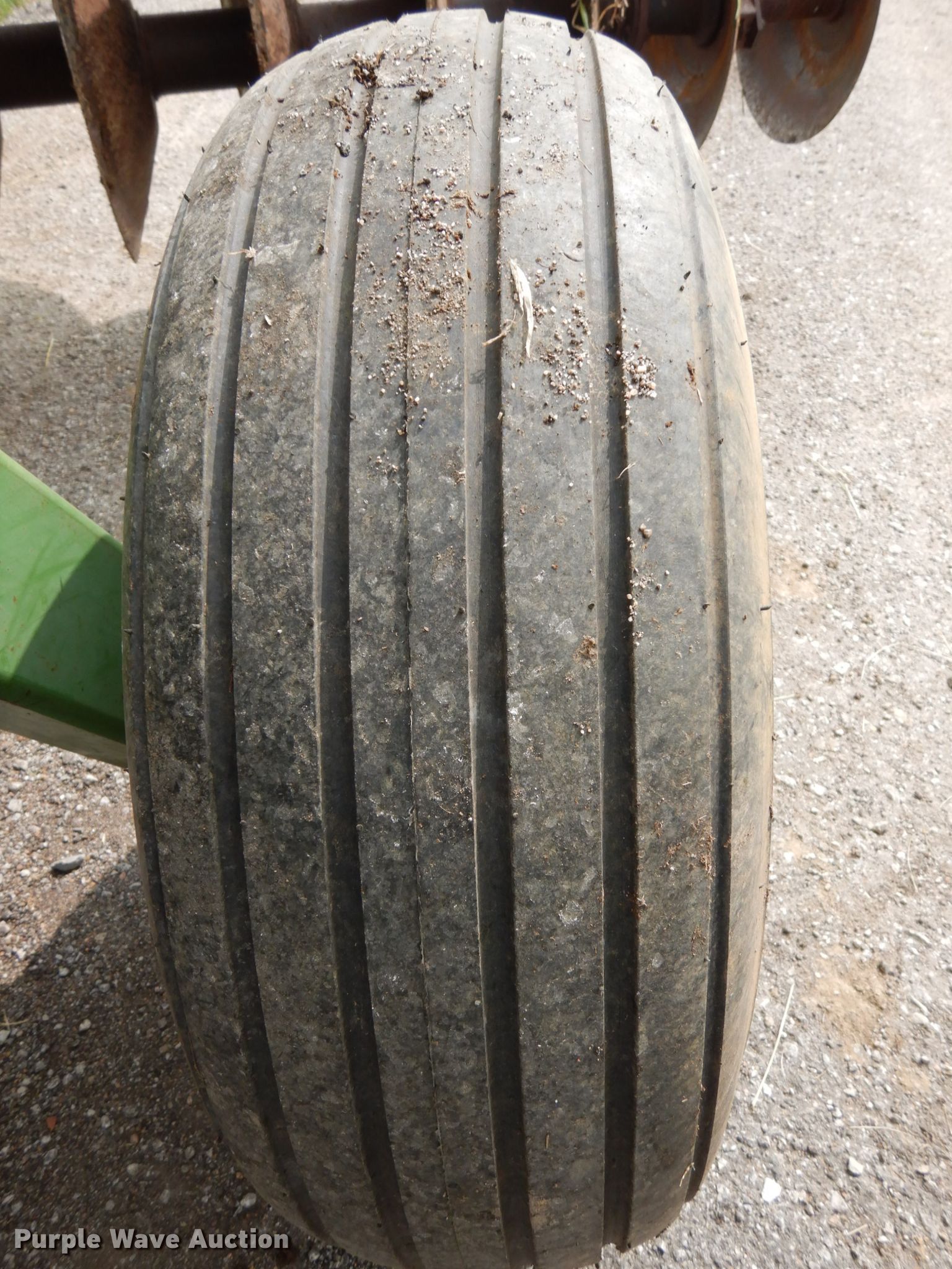 Purple Wave is selling a used Disk in Nebraska. This item is a John Deere 210 tandem disk with the following: Approx. 13'W, Approx. 20" diameter front disks, Approx. 21" diameter rear disks, 9" spacing, Disk scrapers, Manual leveler, Hydraulic lift, 11L-14 tires