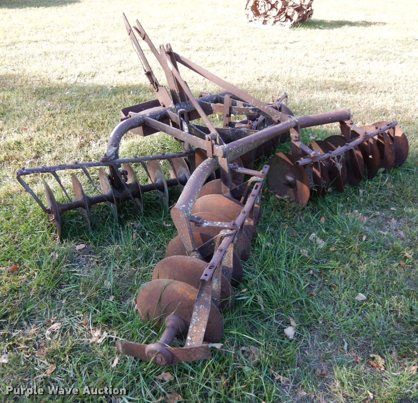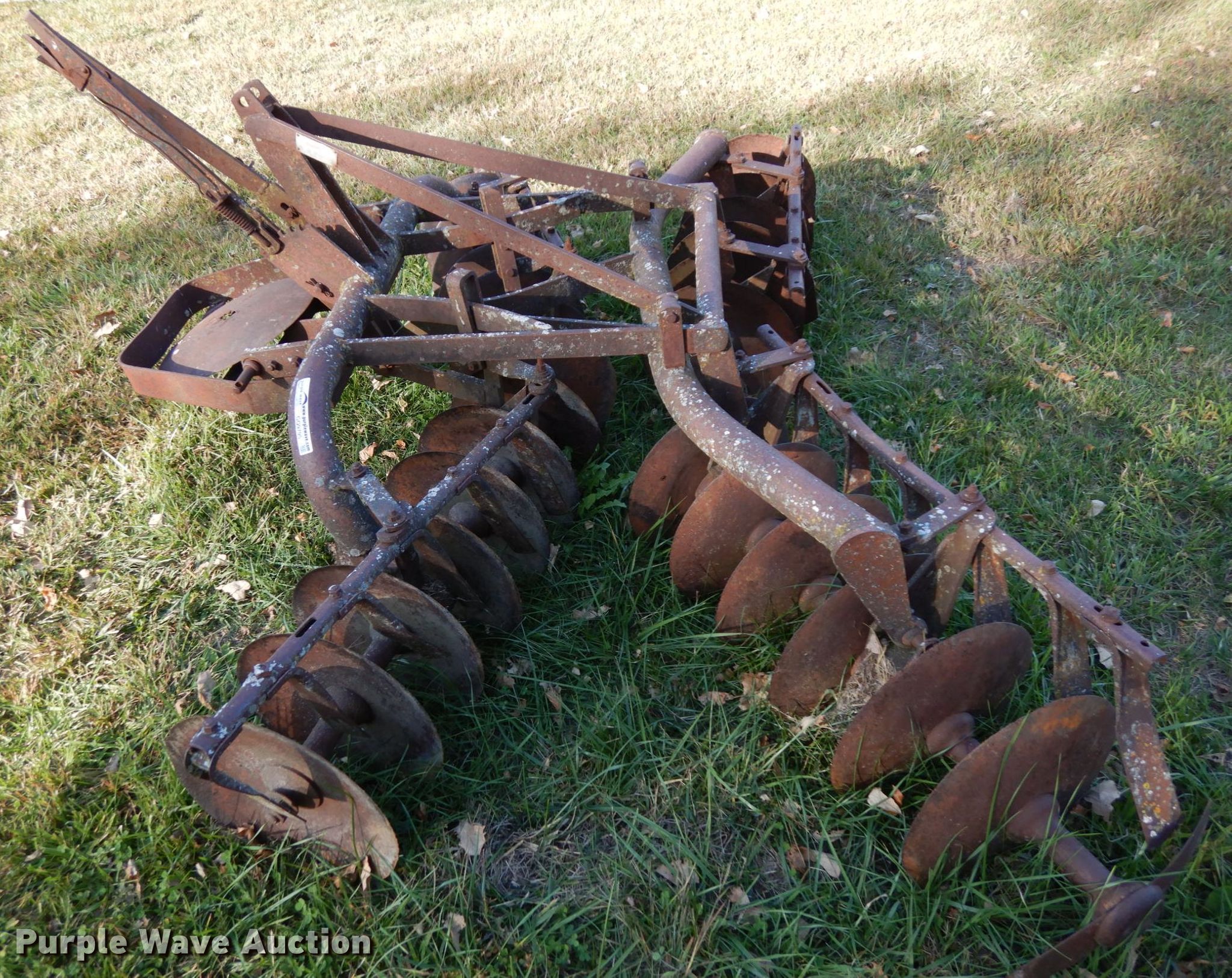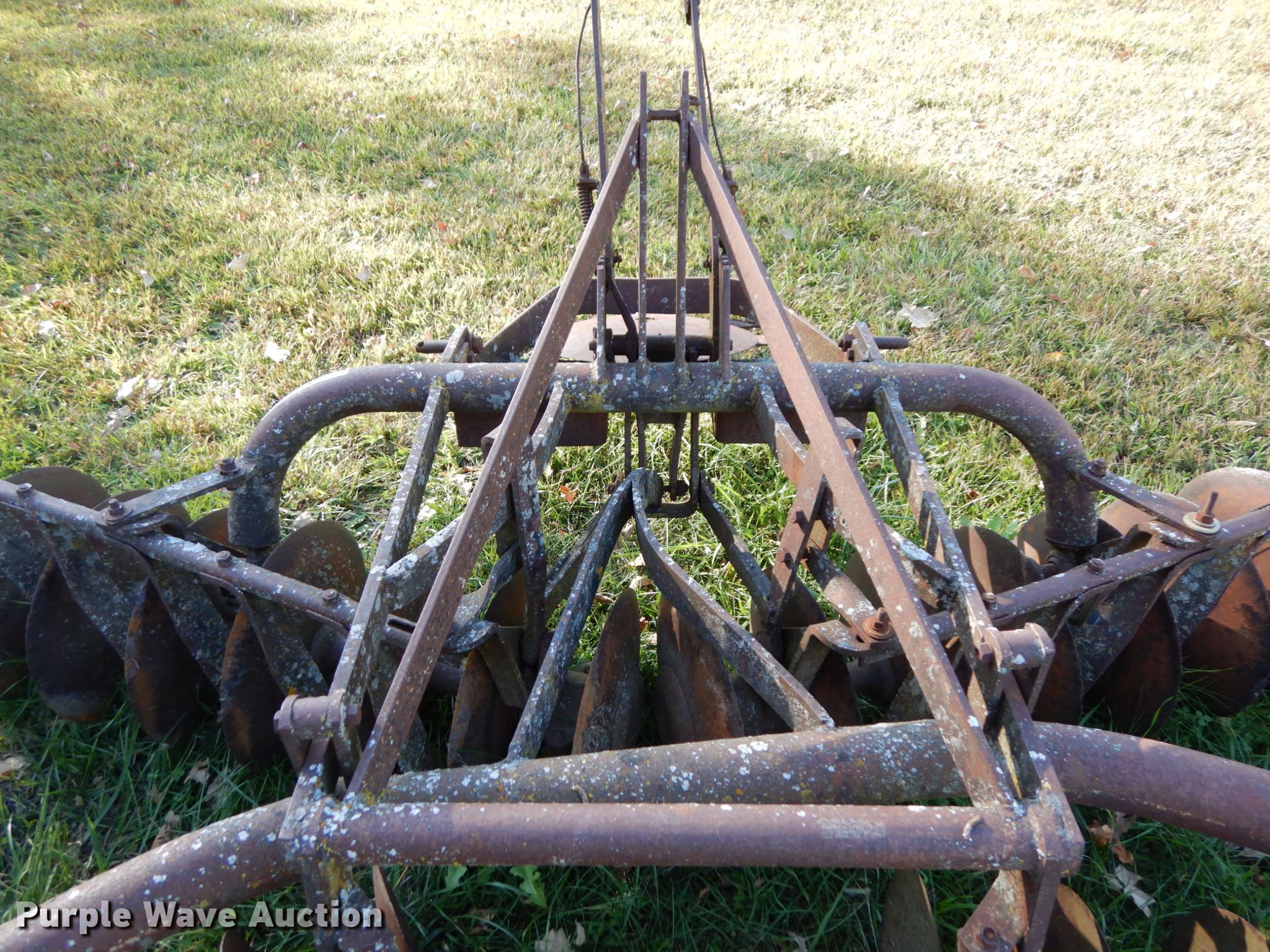 Purple Wave is selling a used Disk in Iowa. This item is a Ferguson ABO-22 tandem disk with the following: 8'6"W, 14.75" diameter front disks, 16" diameter rear disks, 6.3" spacing, Disk scrapers, Adjustable pitch gangs, Manual leveler, Three point hitch, Serial 8455