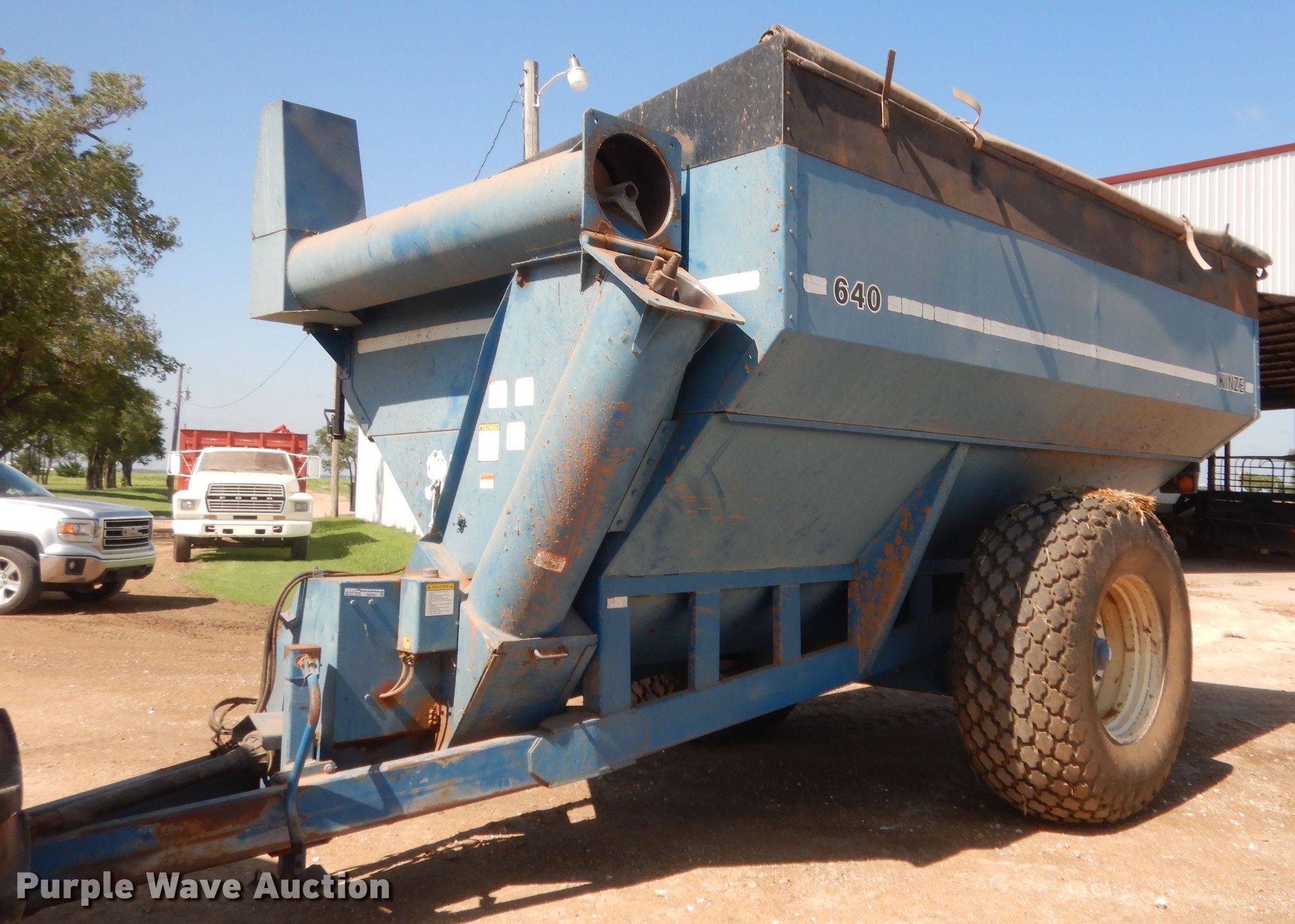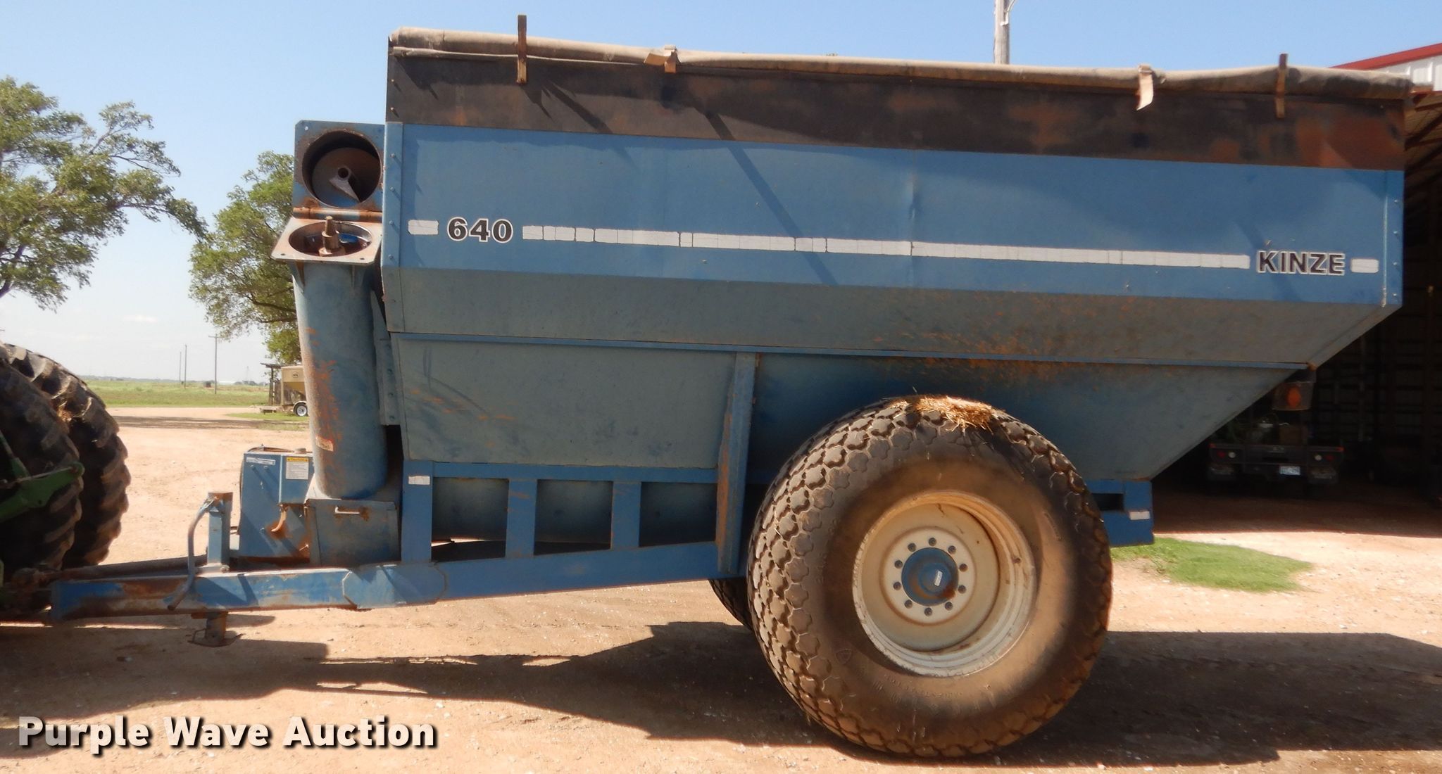 Purple Wave is selling a used Grain Cart or Gravity Wagon in Oklahoma. This item is a Kinze 640 grain cart with the following: 640 bushel capacity, 13'L discharge auger, 1000 PTO, 24.5-32 tires, Serial 500927