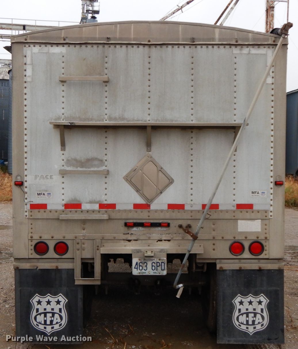 1988 Wilson DWH-200 double hopper bottom grain trailer. 41'L x 96"W overall, 66" side height, Manual trap gates, Aluminum construction, Dual leg two speed landing gear, Spring suspension, Air brakes, Tandem axle, Steel wheels, 11R22.5 tires. Missouri title. Title distribution may be delayed up to 14 days from verification of funds. 1W19AFY57J2212235. MFA, Inc.. 1035 Industrial Rd. Chillicothe, MO 64601
