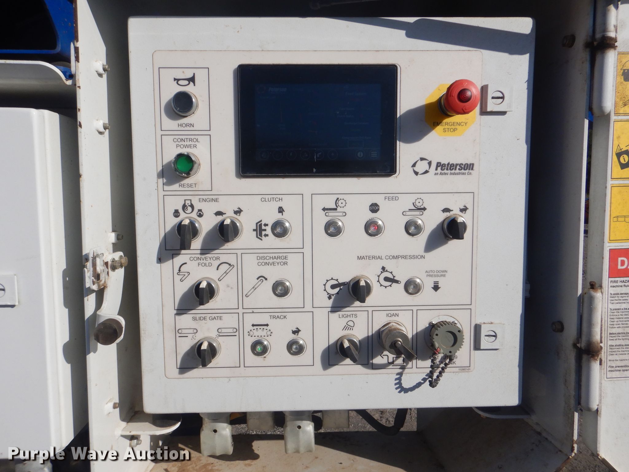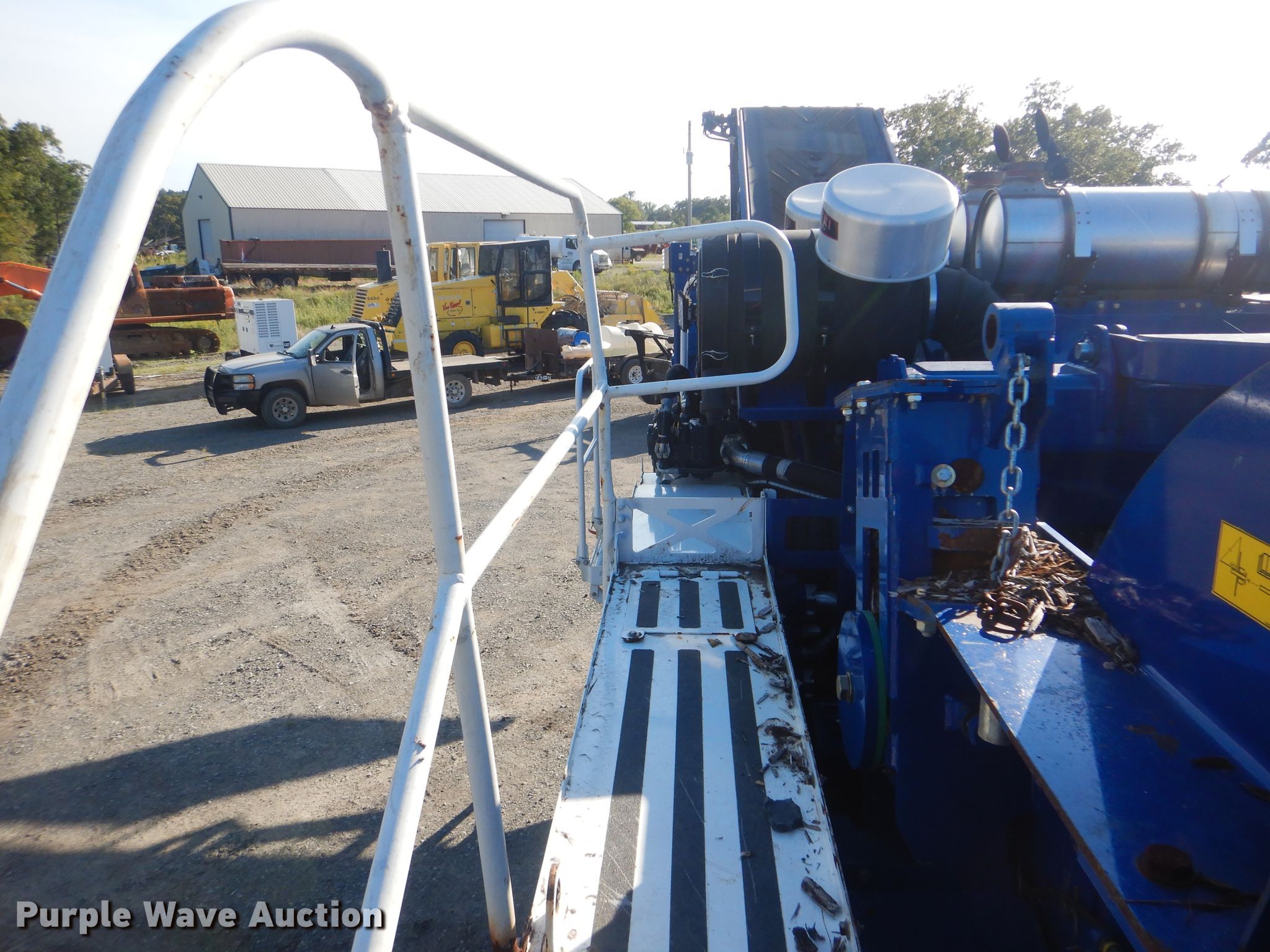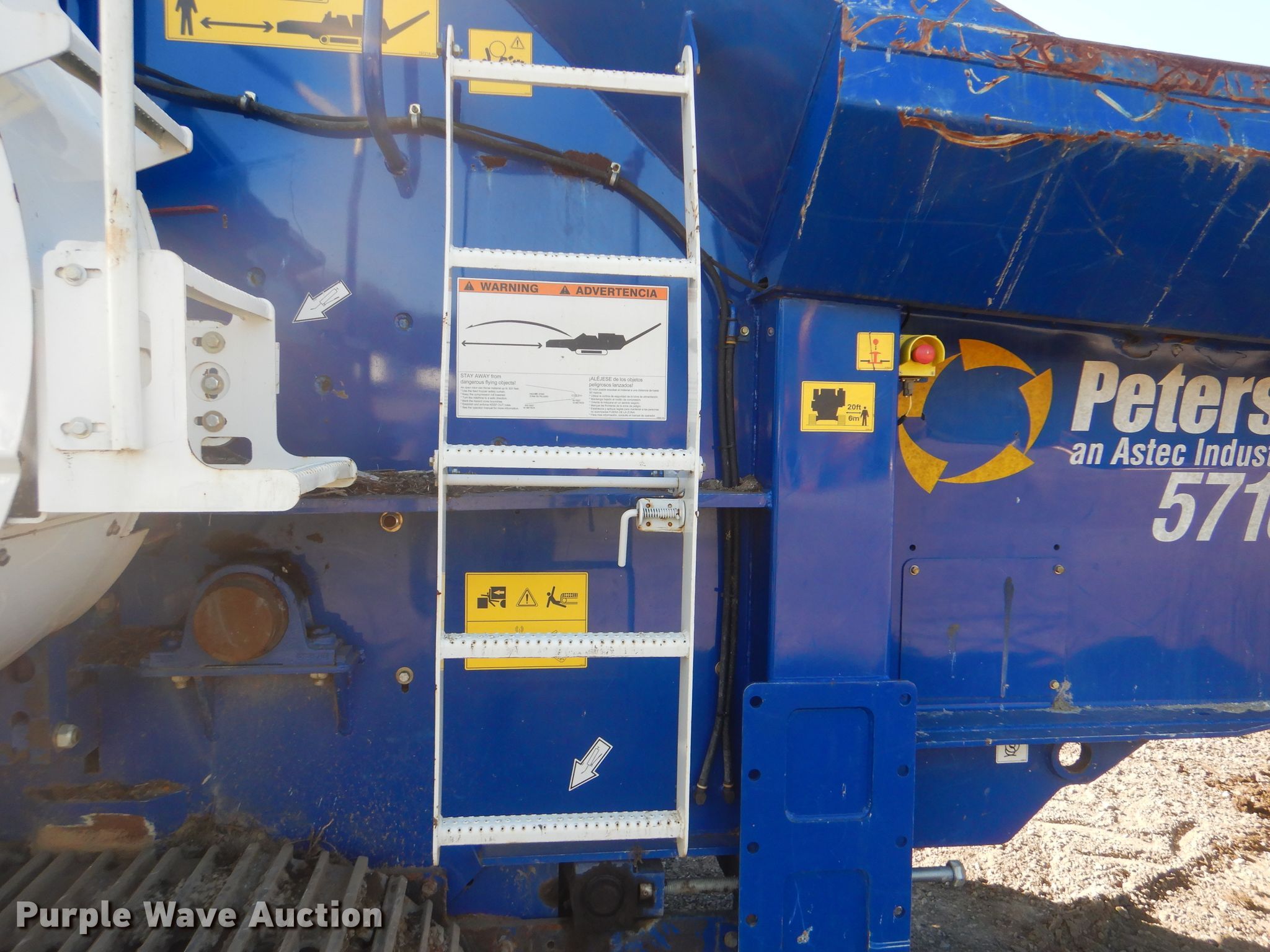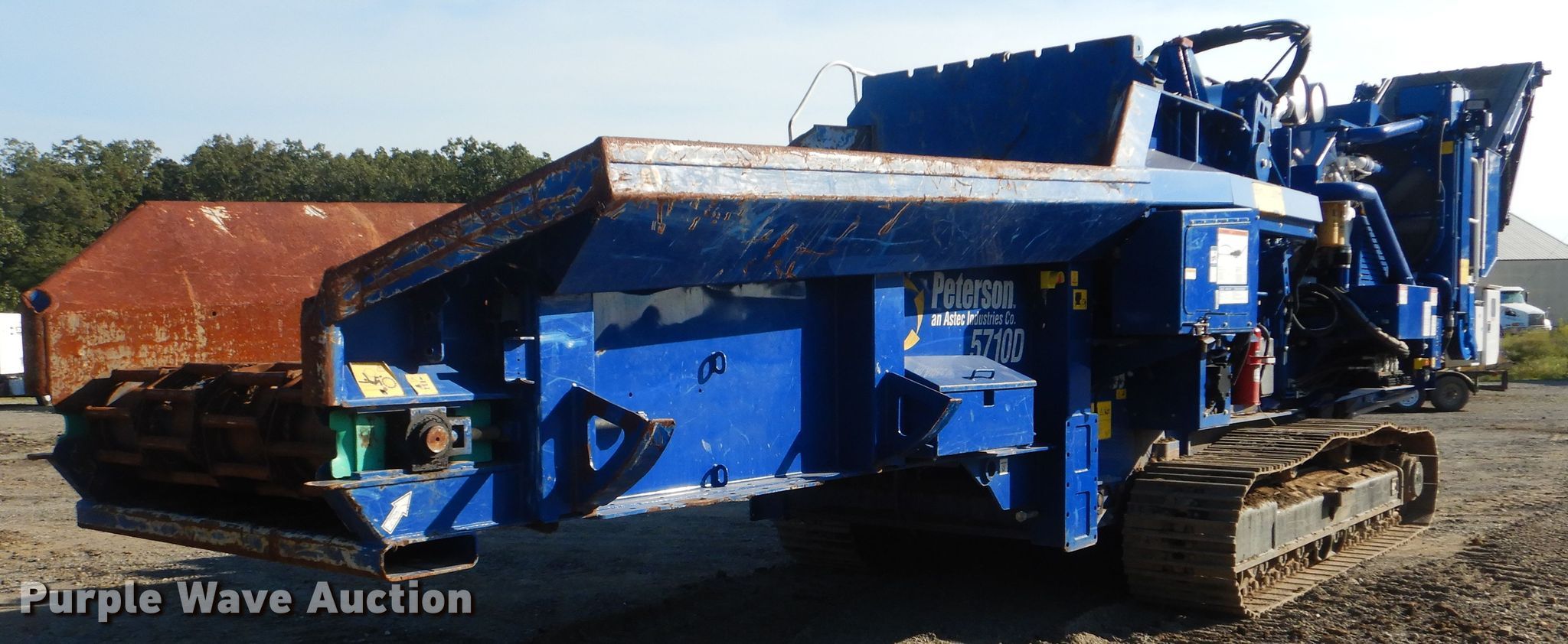 Purple Wave is selling a used Wood Grinder in Oklahoma. This item is a 2018 Peterson 5710D horizontal grinder with the following: 587 hours on meter, Caterpillar C27 27.0L 12 cylinder diesel engine, 57'10"L x 11'5"W x 16'10"H, 14'7"L x 5'W x 7'6"H hopper, 7 3/8" x 40" diameter rotor, (4) grates, 60"W discharge conveyor, Remote, 24"W triple grouser track pads, Serial 40D-195-2432