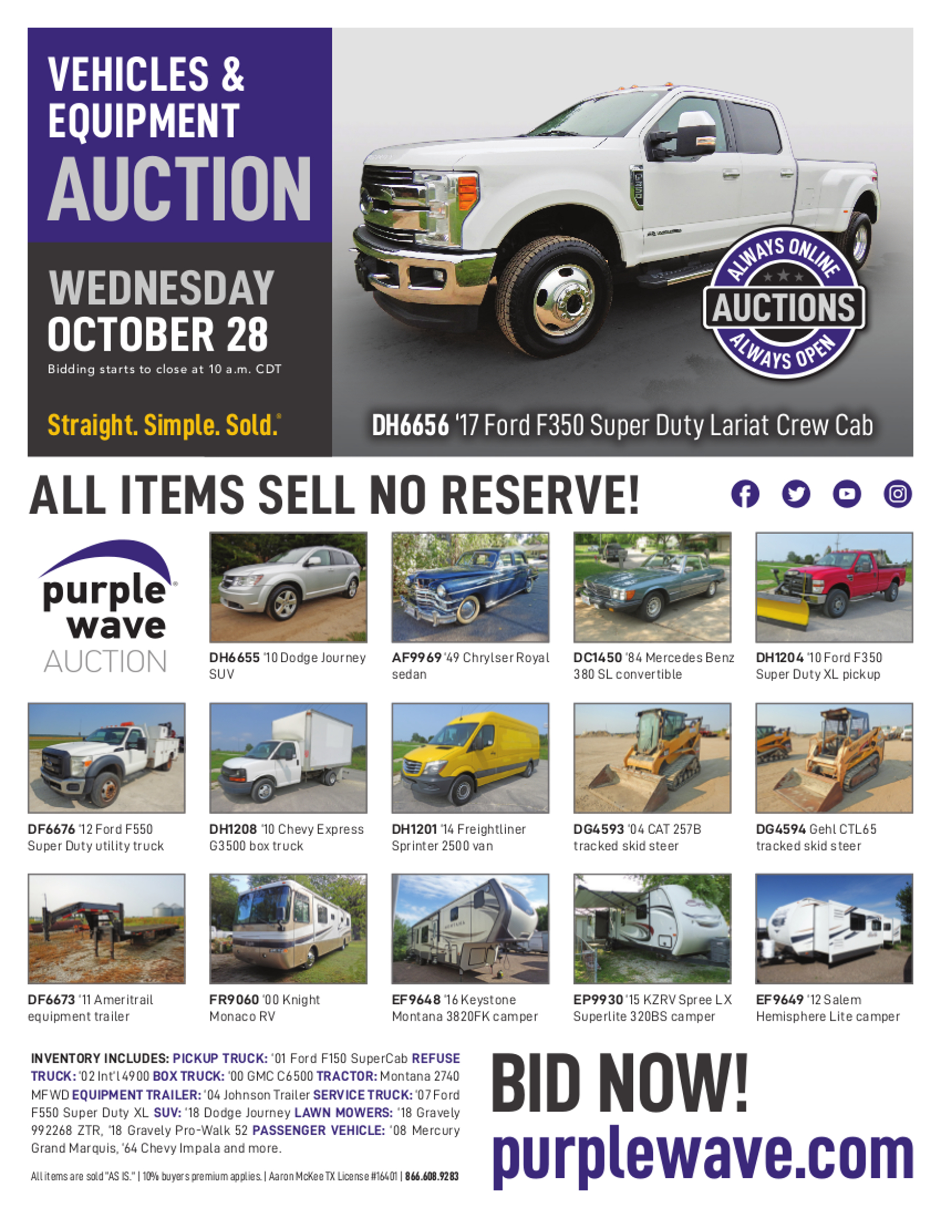 This auction is conducted by Purple Wave, Inc., whose home office is 825 Levee Drive, Manhattan, Kansas. Aaron McKee, Texas auctioneer license # 16401, operates Purple Wave, Inc. Complaints against us may be directed to the Texas Department of Licensing and Regulation, P.O. Box 12157, Austin, Texas 78711, (512) 463-6599. For additional required information, see the attached document.