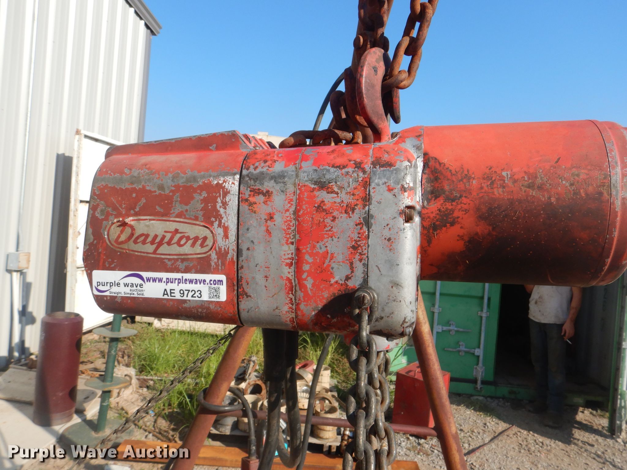 Purple Wave is selling a used Tools in Oklahoma. This item is a Dayton electric hoist with the following: Two ton capacity, Three phase, Remote control