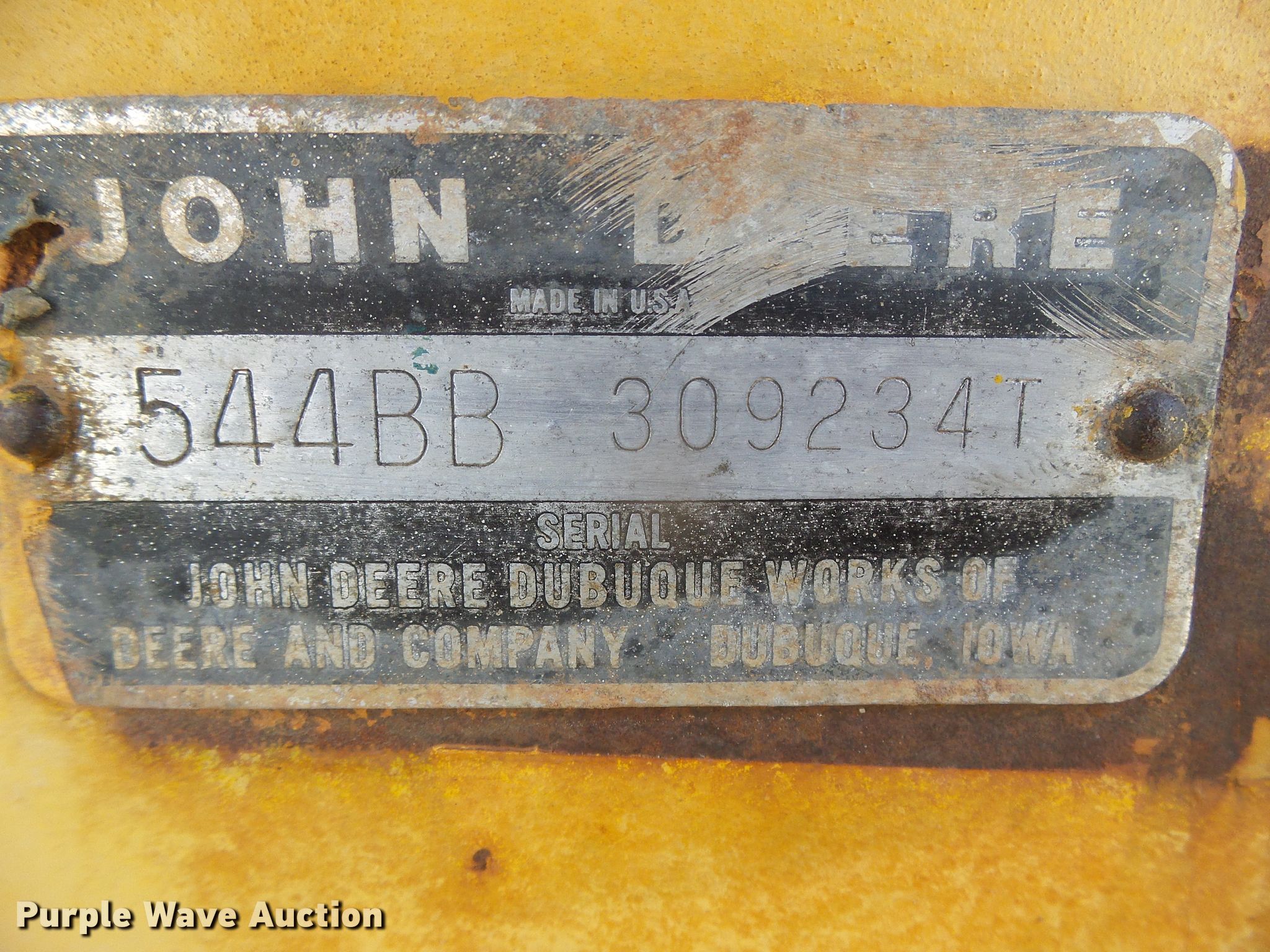 1976 John Deere 544B wheel loader. 139 hours on meter Hours may vary, still in use, Hour meter has been replaced, Serial: 309234T. Engine John Deere, Cylinders: 6, Fuel type: Diesel. Transmission Powershift, 2F - 1R. Operators station Bucket controls: Joystick. Operational Auxiliary hydraulics: Rear, Quick coupler: Hydraulic JRB, Counter weights, Bucket Make: John Deere, Capacity: 2 cu.yd., Width: 96", Cutting edge: Bolt-on. Tires Size: 17.5-25. Notes Engine issues, misfires. 1204 Minneola Rd. Dodge City, KS 67801