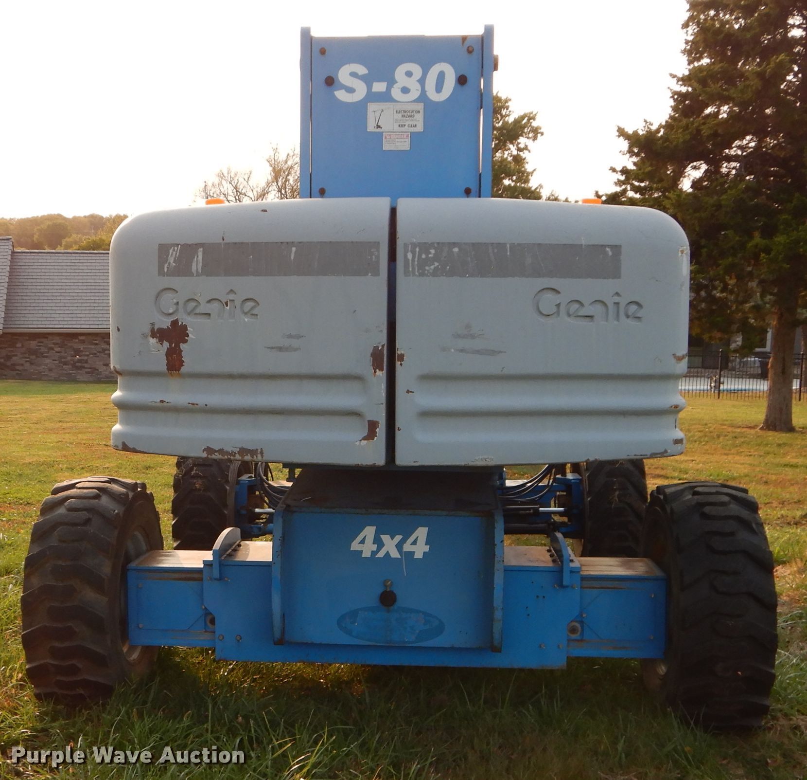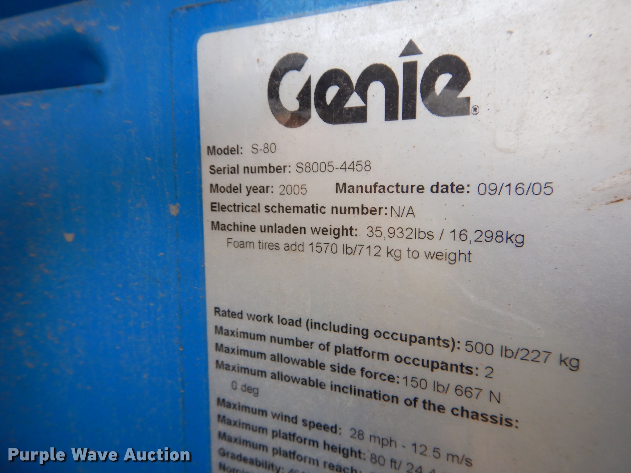 Purple Wave is selling a used Boom Lift in Kansas. This item is a 2005 Genie S80 boom lift with the following: 1,793 hours on meter, Serial: S8005-4458
