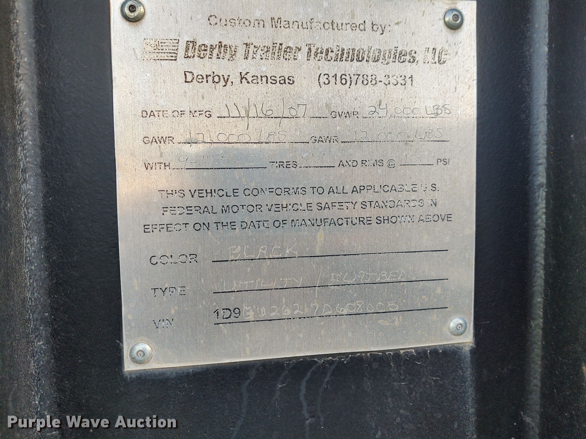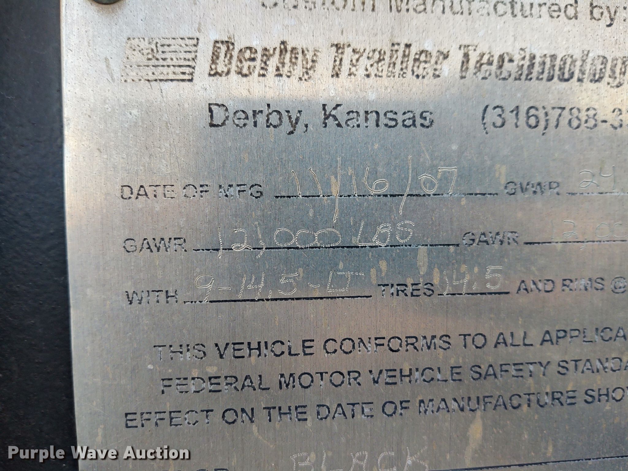 Purple Wave is selling a used Equip. Trailer in Kansas. This item is a 2007 Derby Trailer Technologies equipment trailer with the following: 26'4"L x 102"W overall, 21'2"L deck, 5' tail length, (4) ramps, Dual leg landing gear, Spring suspension, Electric brakes, Tandem axle, Steel wheels, 225/75R14.5 tires, GVWR 24,000 lbs