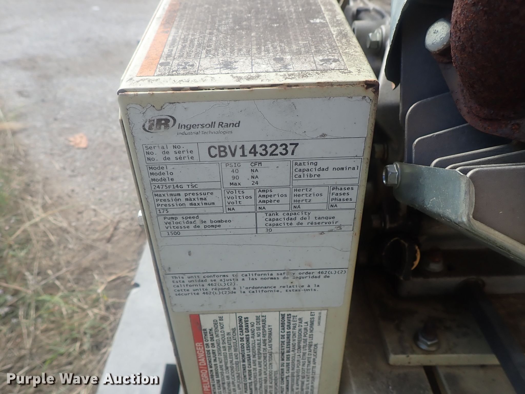 Purple Wave is selling a used Air Compressor in Kansas. This item is a Ingersoll Rand 2475F14G TSC air compressor with the following: Kohler gas engine, 90 psig, 24 cfm, 30 gallon tank, Serial CBV143237