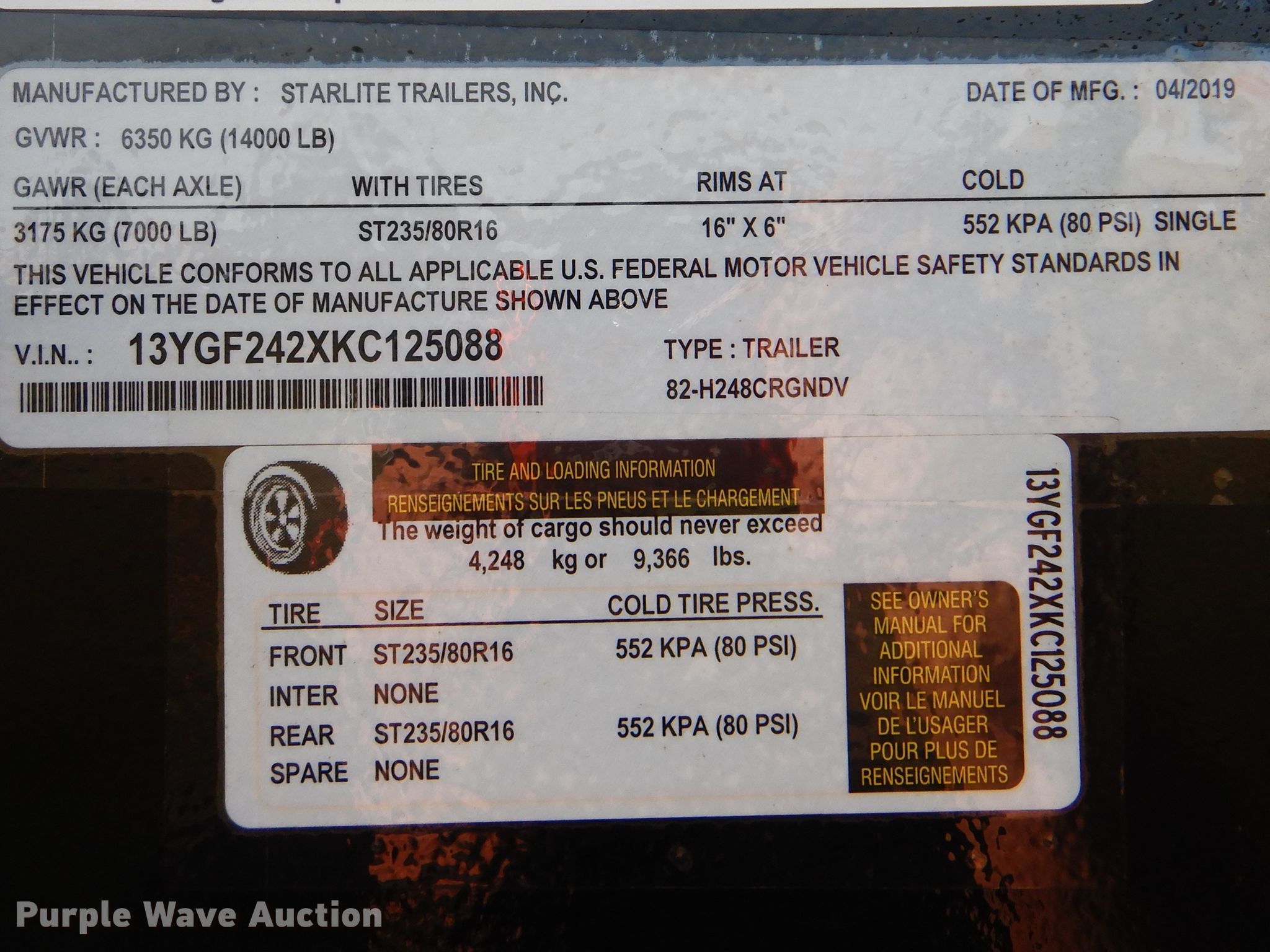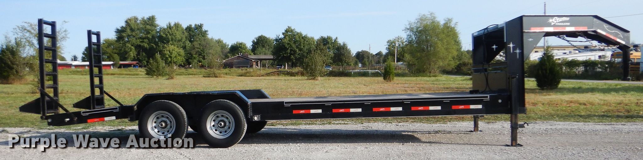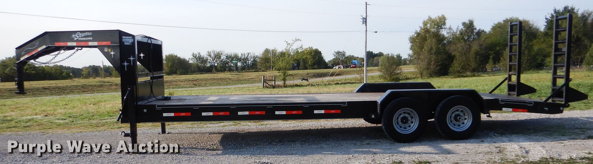 Purple Wave is selling a used Equip. Trailer in Oklahoma. This item is a 2019 Starlite Trailers 82-H248CRGNDV equipment trailer with the following: 30'L x 88"W overall, 20'L x 84"W wood deck, 8.5' tail length, 5'L ramps, Dual leg landing gear, Spring suspension, Electric brakes, Tandem axle, ST235/80R16 tires, GVWR 14,000 lbs, GAWR 7,000 lbs