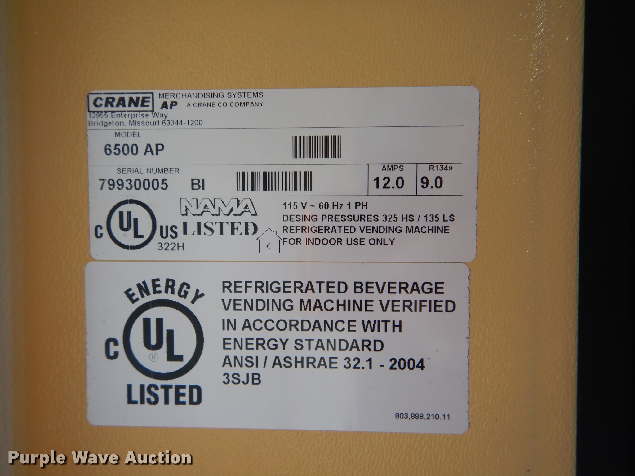Purple Wave is selling a used Retail Displays in Oklahoma. This item is a Crane Merchandising 6500AP vending machine with the following: Approximately 39 slots, Accepts cash or cards, 9.0 R134a refrigerant, 12.0 amps, Serial 79930005