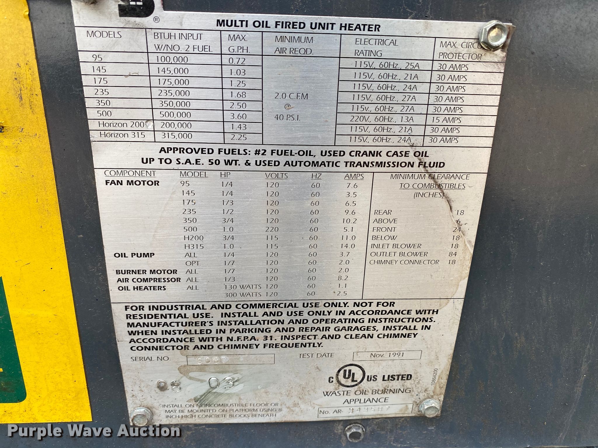 Purple Wave is selling a used Tools in Missouri. This item is a 1991 Shenandoah Horizon 200 oil burning furnace with the following: 200,000 BTU per hour input, 115V, 60 Hz, 21 amp, Serial 9087