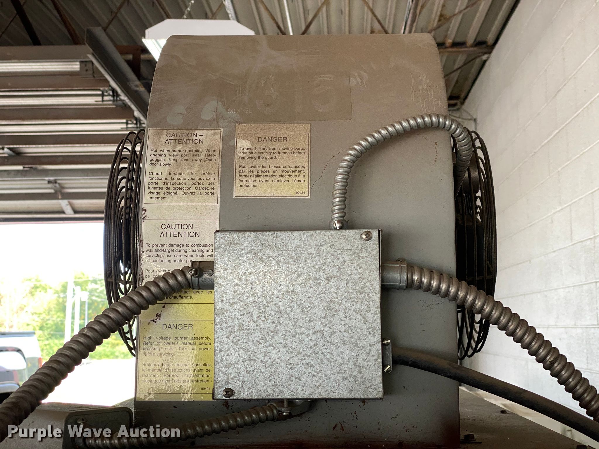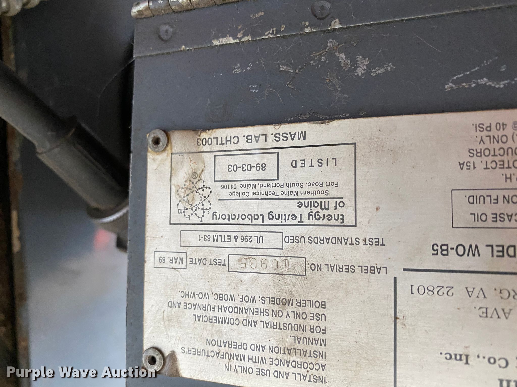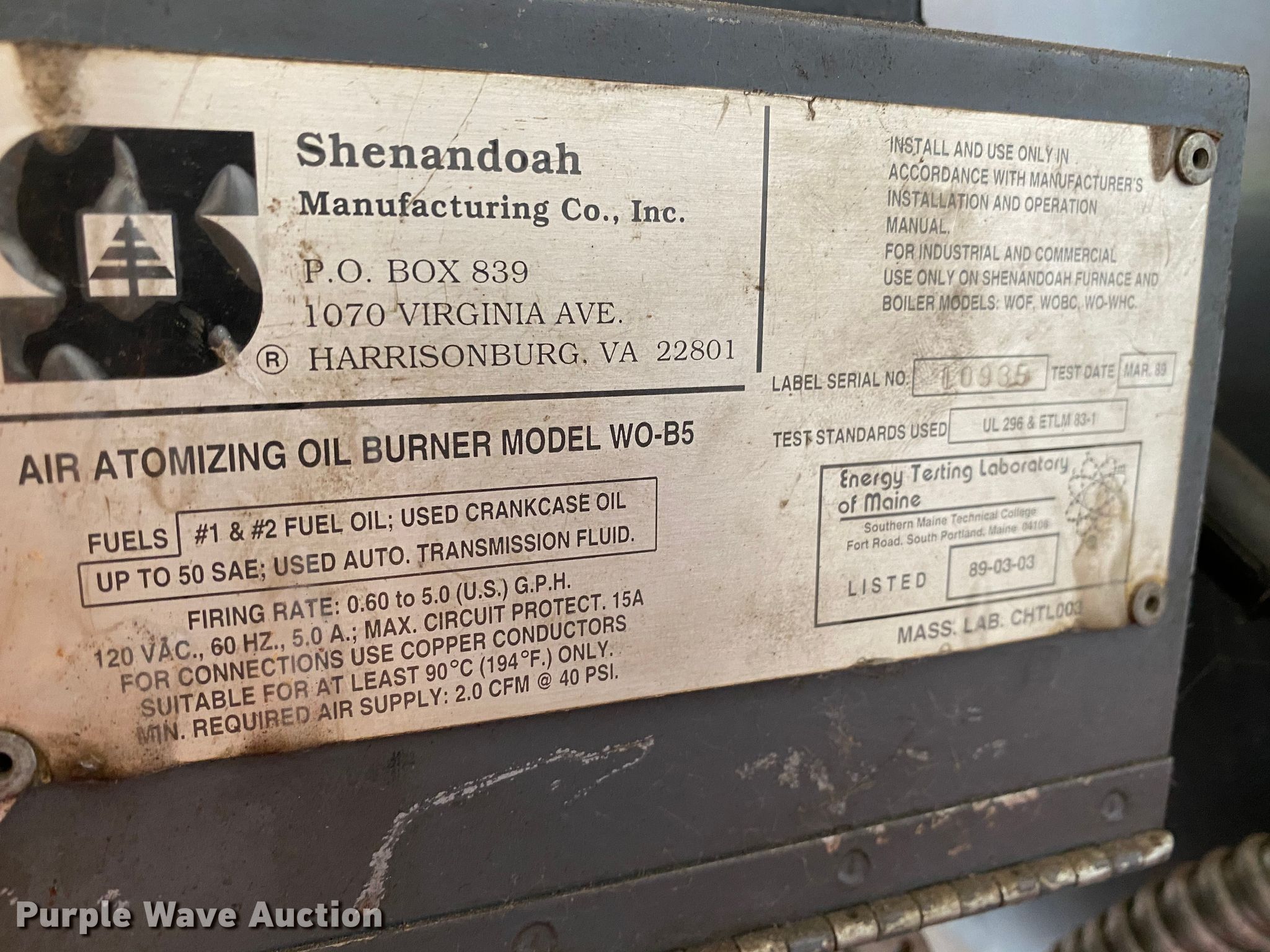 Purple Wave is selling a used Tools in Missouri. This item is a 1991 Shenandoah Horizon 315 oil burning furnace with the following: 315,000 BTU per hour output, 2.25 max gph, 115V, 60 Hz, 34 amp, 3/4 HP, Serial 61419