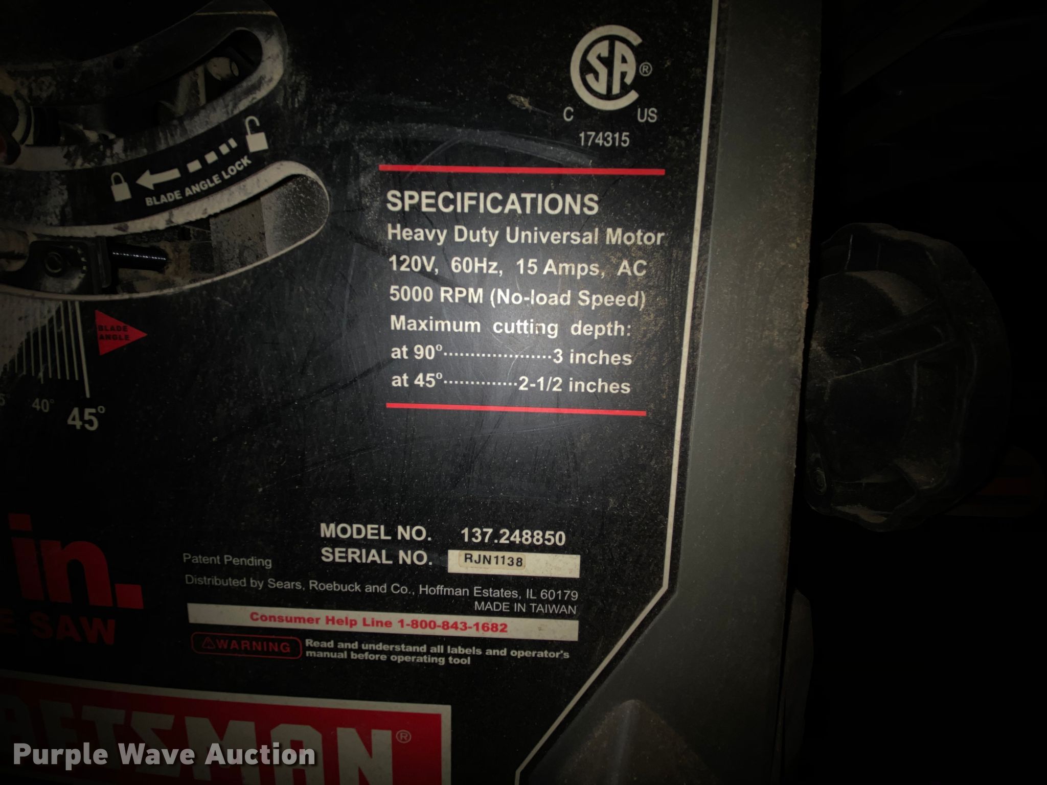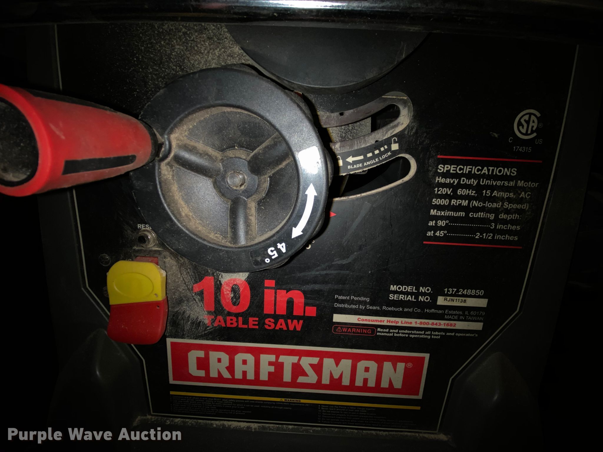 Purple Wave is selling a used Tools in Missouri. This item is a Craftsman 137.248850 table saw with the following: 10", 120V, 65 Hz, 15 amp, 5,000 RPM, Serial RJN1138