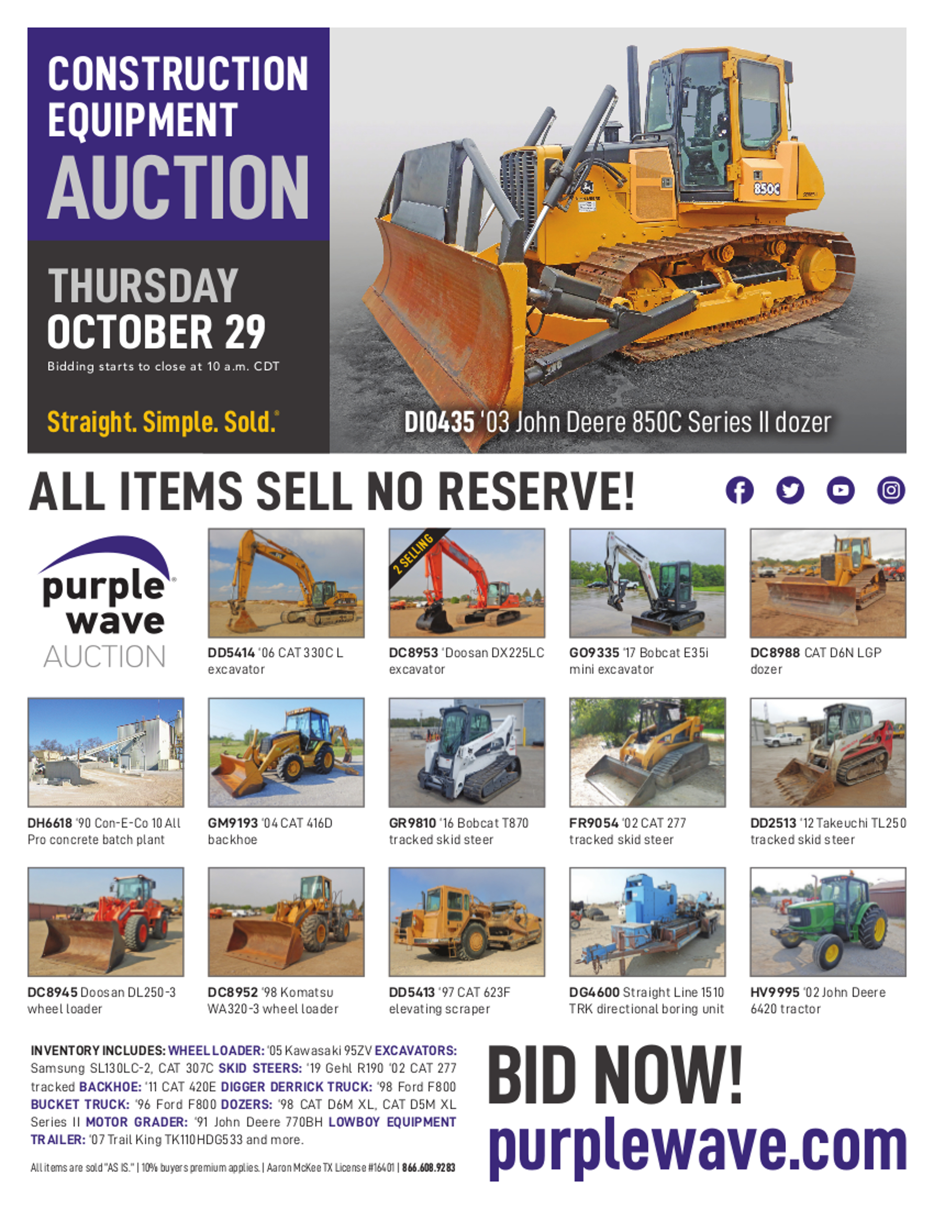 This auction is conducted by Purple Wave, Inc., whose home office is 825 Levee Drive, Manhattan, Kansas. Aaron McKee, Texas auctioneer license # 16401, operates Purple Wave, Inc. Complaints against us may be directed to the Texas Department of Licensing and Regulation, P.O. Box 12157, Austin, Texas 78711, (512) 463-6599. For additional required information, see the attached document.