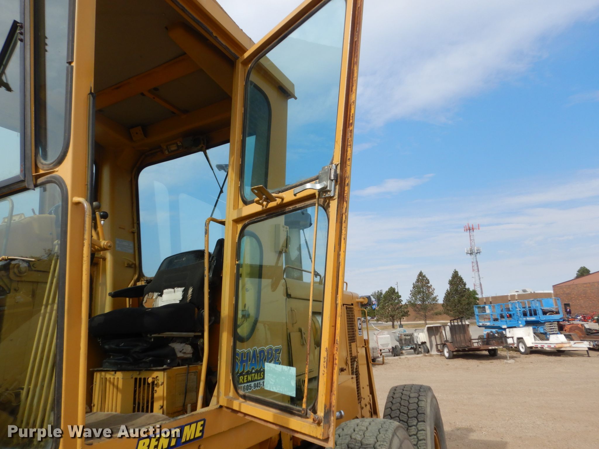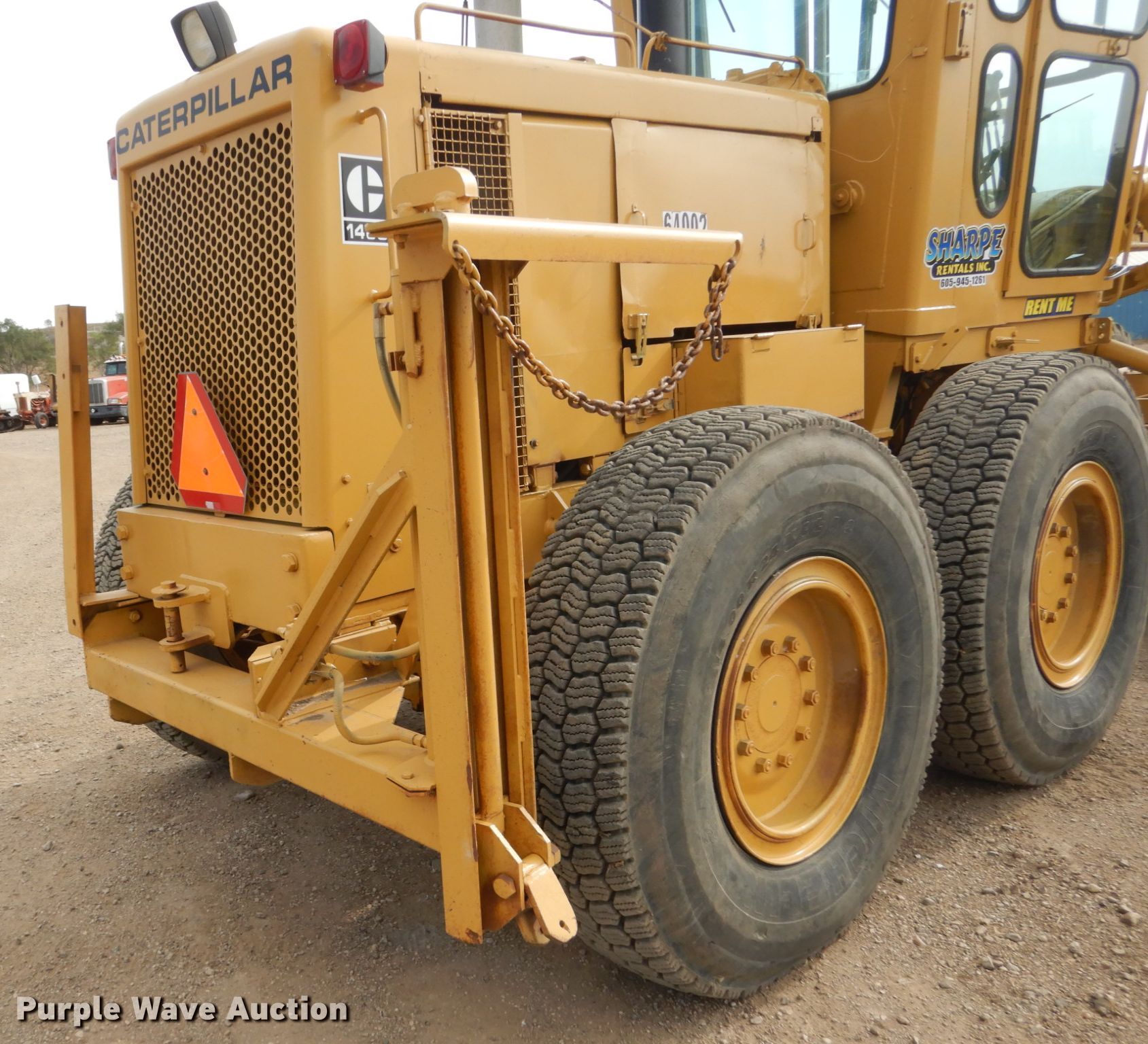 1975 Caterpillar 140G motor grader. 6,543 hours on meter, Unit #: 64002. Engine Caterpillar 3306, Serial: 3N37689, Cylinders: 6, Fuel type: Diesel. Transmission Powershift, 6F - 6R. Operators station Enclosed cab, Heat, Hydraulic control valves: 11. Operational Moldboard: Tip control, Side shift, Total length: 14', Front mounted lift group, Snow wing plow bracket. Tires Size: 14.00-24. Sharpe Rentals, Inc.. 3500 E Hwy 34. Pierre, SD 57501