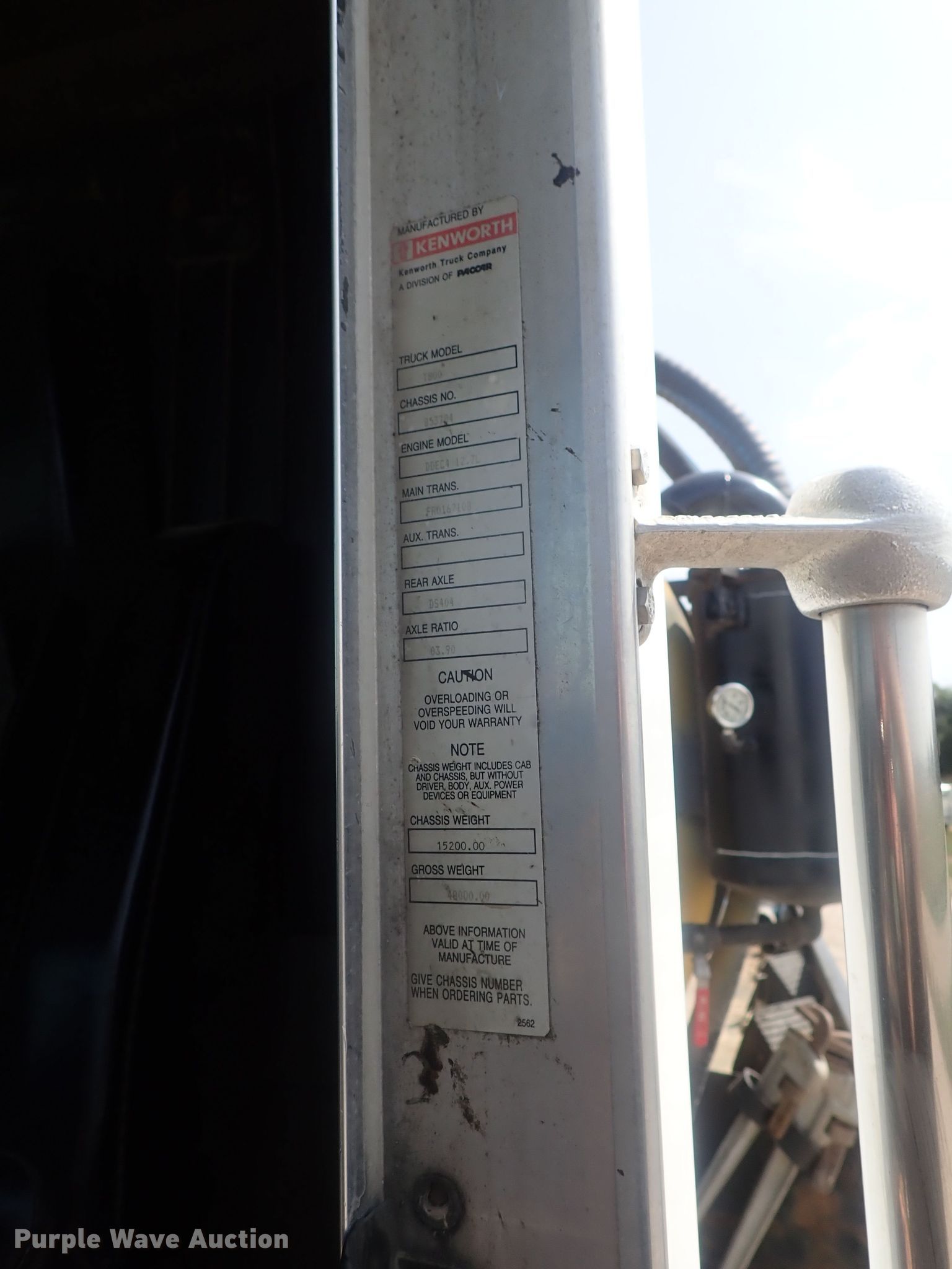 2000 Kenworth T800 vacuum truck. 851,453 miles on odometer, Miles may vary. unit still in use. Engine Detroit Diesel, Displacement: 12.7L, Cylinders: 6, Fuel type: Diesel. Transmission Manual, Speed: 10. Chassis Axles: Tandem, Suspension: Air, Brakes: Air, PTO. Interior AC, Heat, Heated mirrors, Cruise control. Operational Bed/ tank Capacity: 80 barrels, Top hatches: 3, Rear outlet: 4", Vacuum pump Bowie.. Tires Front: 315/80R22.5, Rear: 285/75R24.5. Notes Hoses and fittings not included. Kansas title. Vehicle has an E-Title in the State of Kansas. A paper title will be distributed to the buyer within 30 days from verification of funds. 1XKDDR9XXYJ853784. Webb Excavation. 1160 17th Rd. Lyons, KS 67554