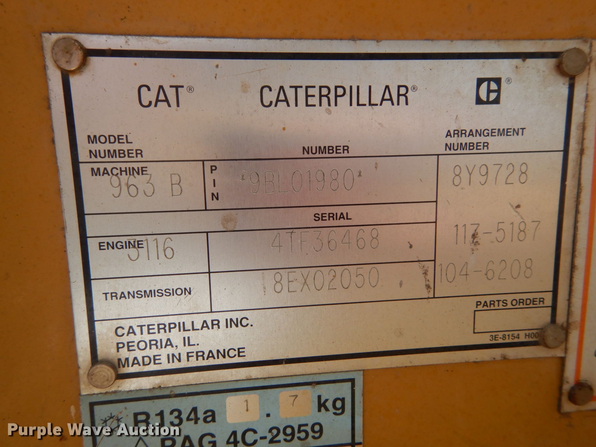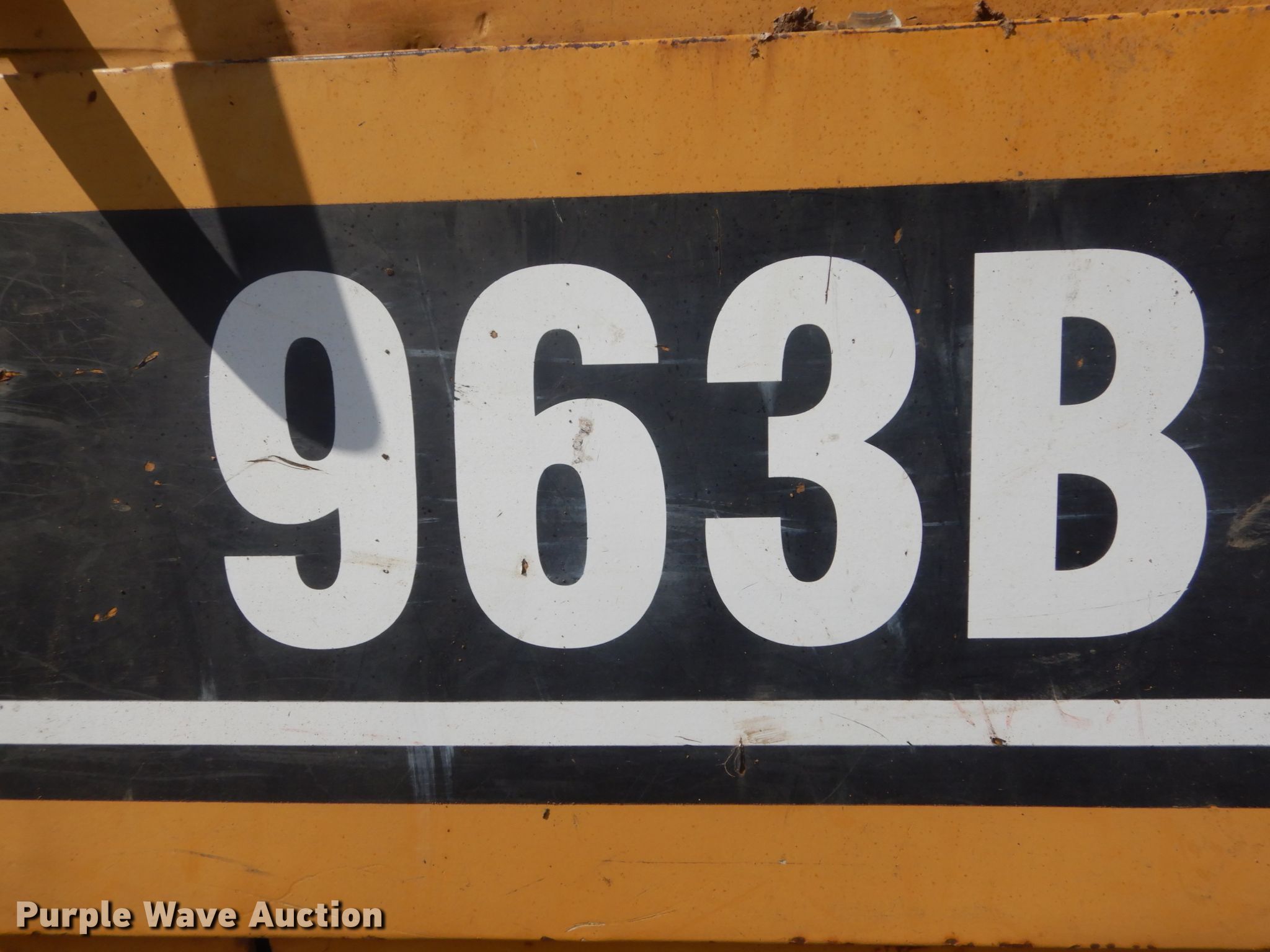 1997 Caterpillar 963B track loader. 3,525 hours on meter, Serial: 9BL01980. Engine Caterpillar 3116, Cylinders: 6, Fuel type: Diesel. Transmission Hydrostatic. Operators station Enclosed cab, AC, Bucket controls: Two-lever. Operational Bucket Width: 96", Self-leveling bucket, Cutting edge: Bolt-on Teeth: 8.. Tracks Width: 22", Grouser pads: Double. Thoele Inc.. Saint Charles, MO 63304