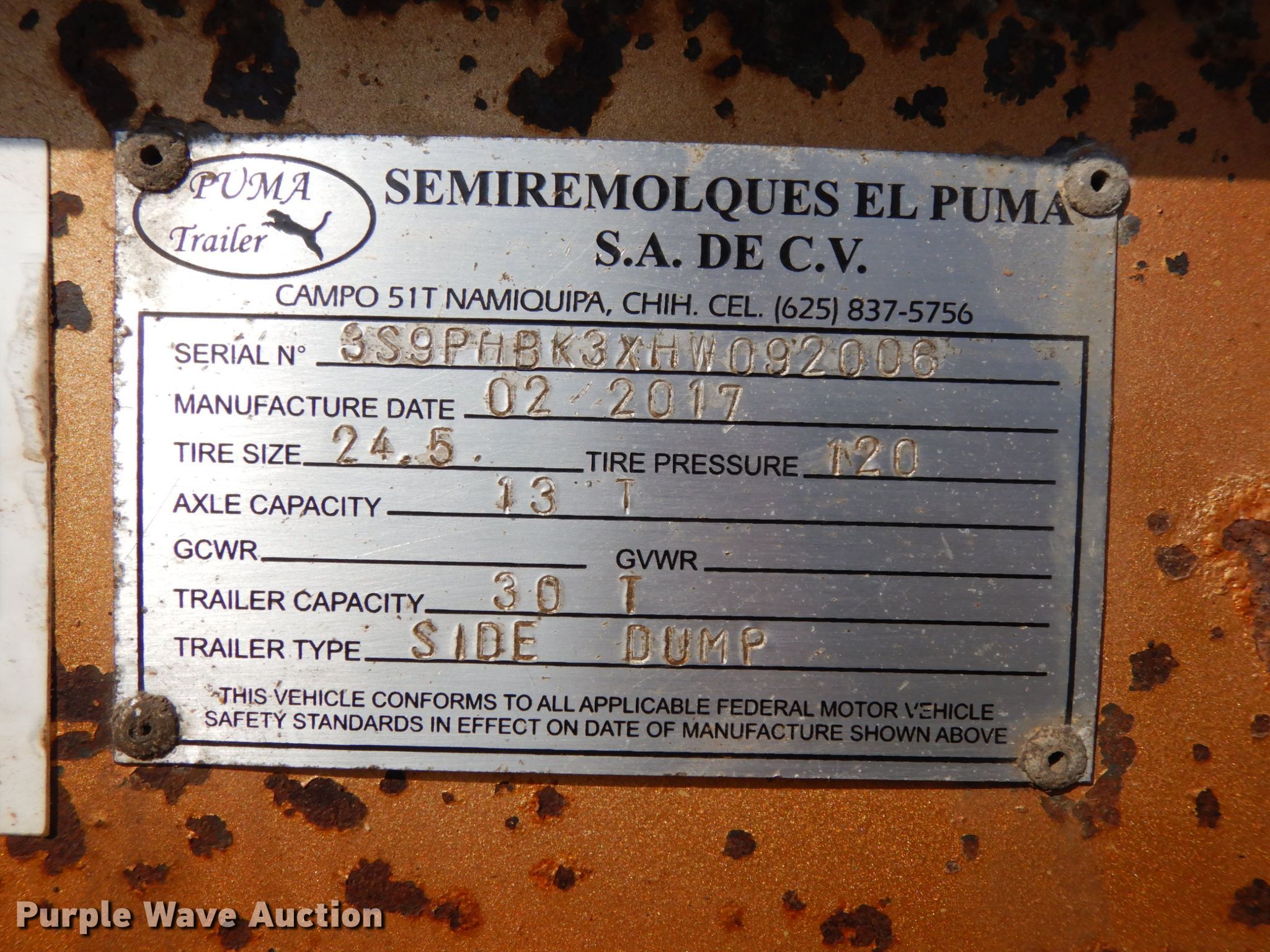 Purple Wave is selling a used Side Tilt Dump Trailer in Nebraska. This item is a 2017 Puma side dump trailer with the following: 48'L x 102"W, 36'L barrel dump bed, 30 ton capacity, Dual cylinder hoist, Trailer controls, Electric tarp, Rear push block, Dual leg landing gear, Air suspension, Air brakes, Triple axle, Aluminum wheels, 385/65R22.5 tires, 11R22.5 tag axle tires, GVWR 60,000 lbs, GAWR 26,000 lbs