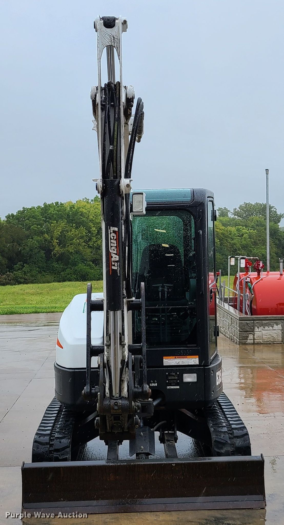 2017 Bobcat E35i mini excavator. 781 hours on meter, Serial: AUYM14459. Engine Kubota, Cylinders: 3, Fuel type: Diesel. Transmission Hydrostatic. Operators station Enclosed cab, AC, Heat. Operational Backfill blade Width: 69", Boom Swing, Stick Stick length: 56", Quick coupler: Hydraulic, Thumb: Hydraulic. Tracks Width: 12", Rubber. Shaw Construction Inc.. 7017 Hwy D. Bates City, MO 64011