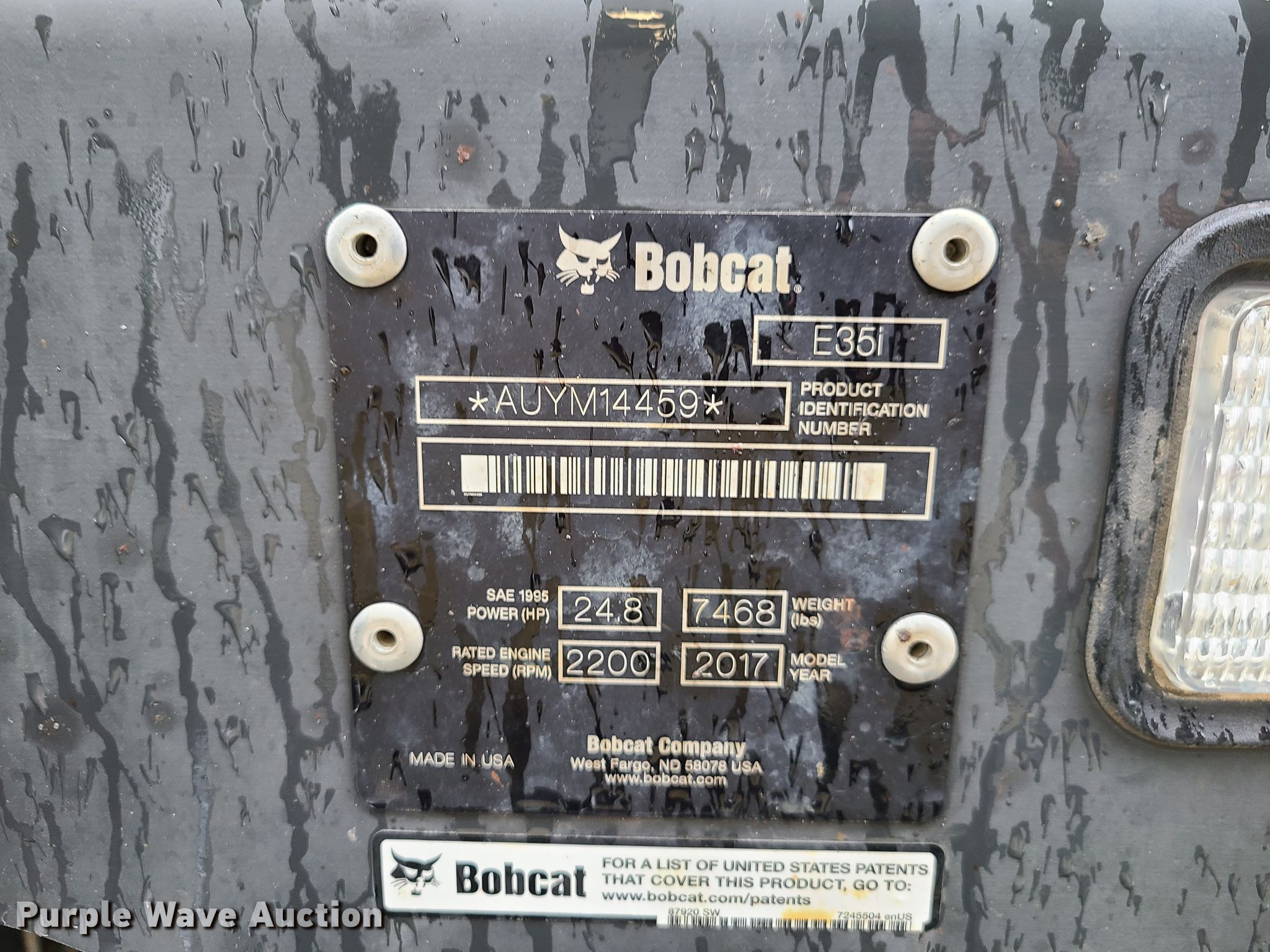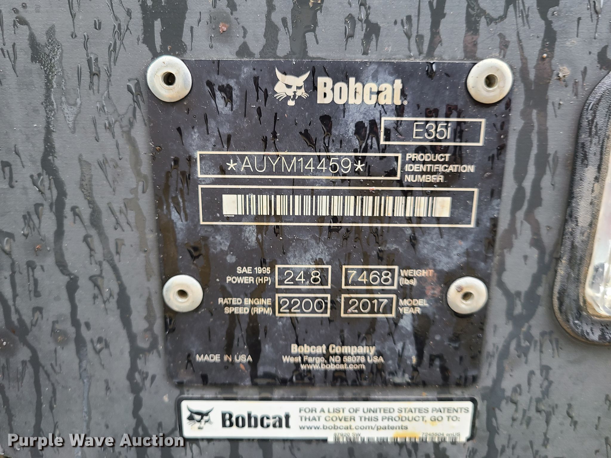 Purple Wave is selling a used Mini Excavator in Missouri. This item is a 2017 Bobcat E35i mini excavator with the following: 781 hours on meter, Serial: AUYM14459